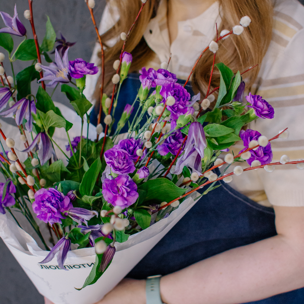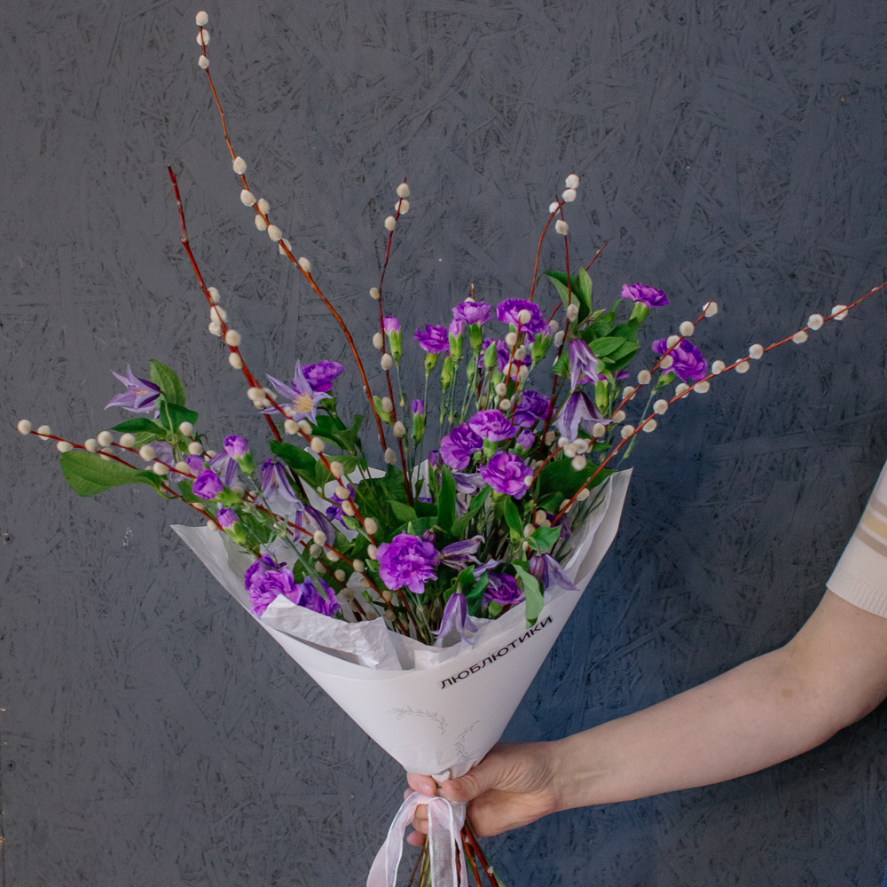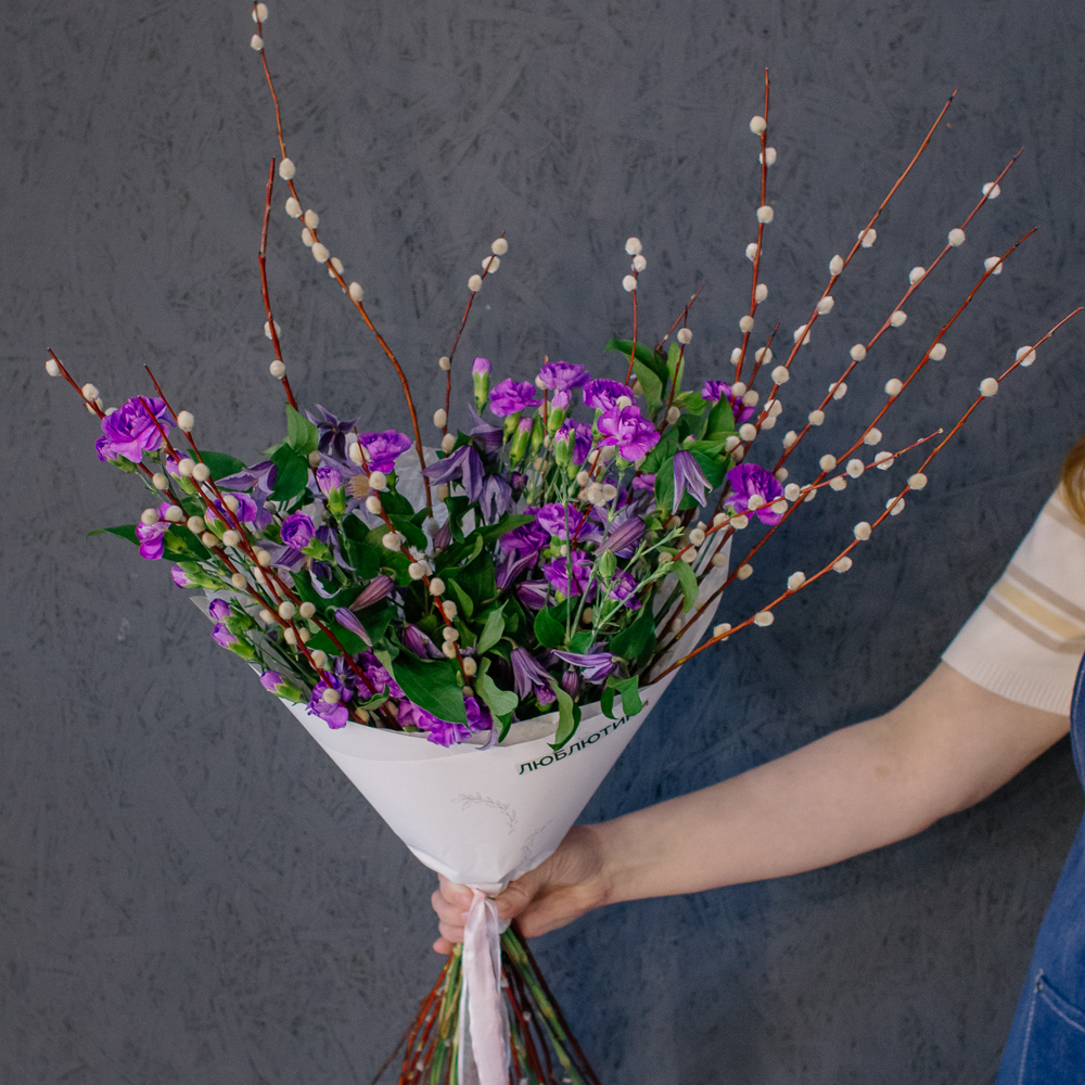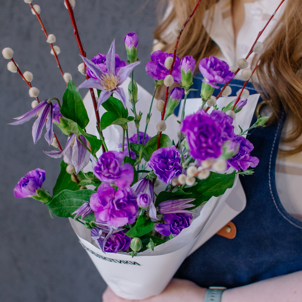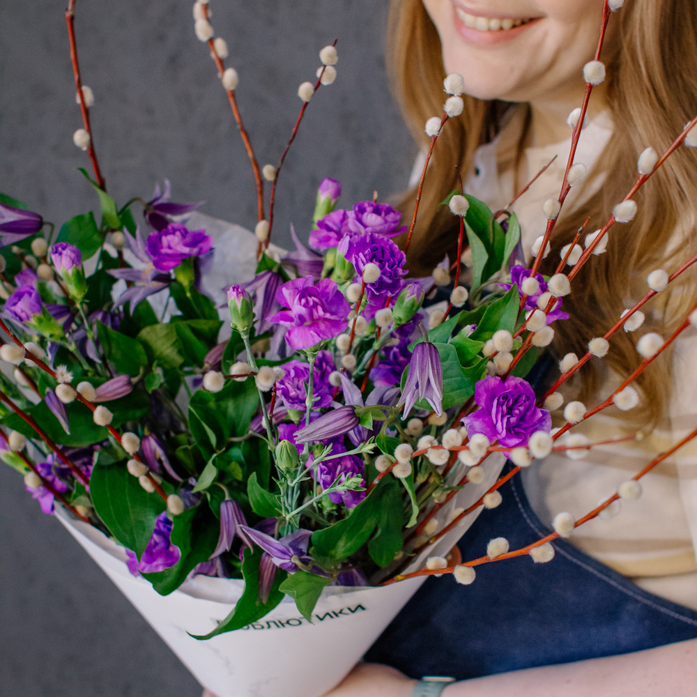 Букет с ярким сиреневым клематисом, кустовыми гвоздиками и веточками вербы — выразительный и с весенним настроением.
