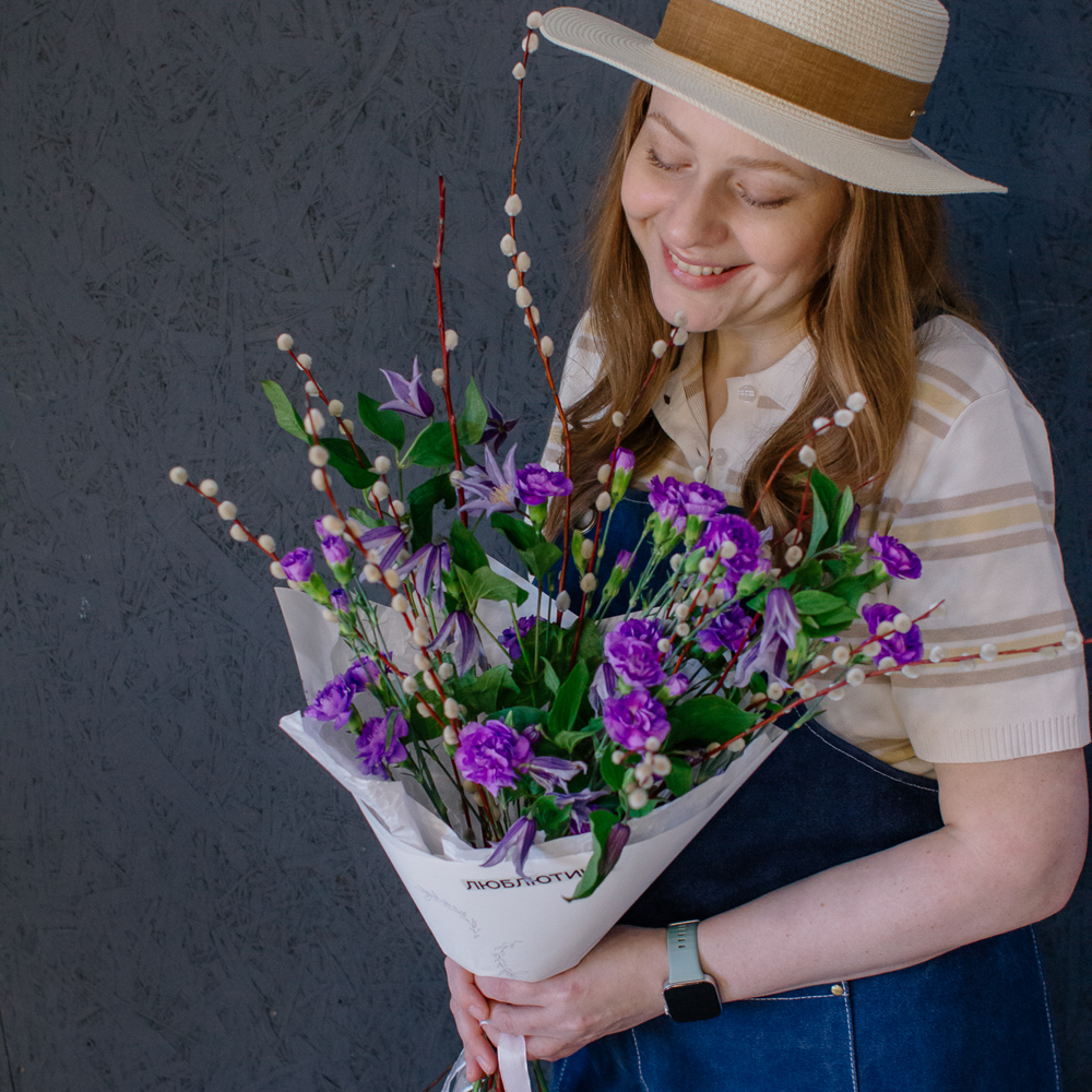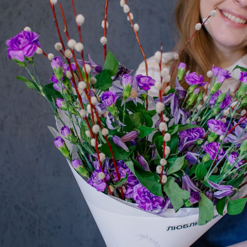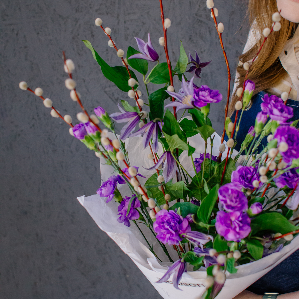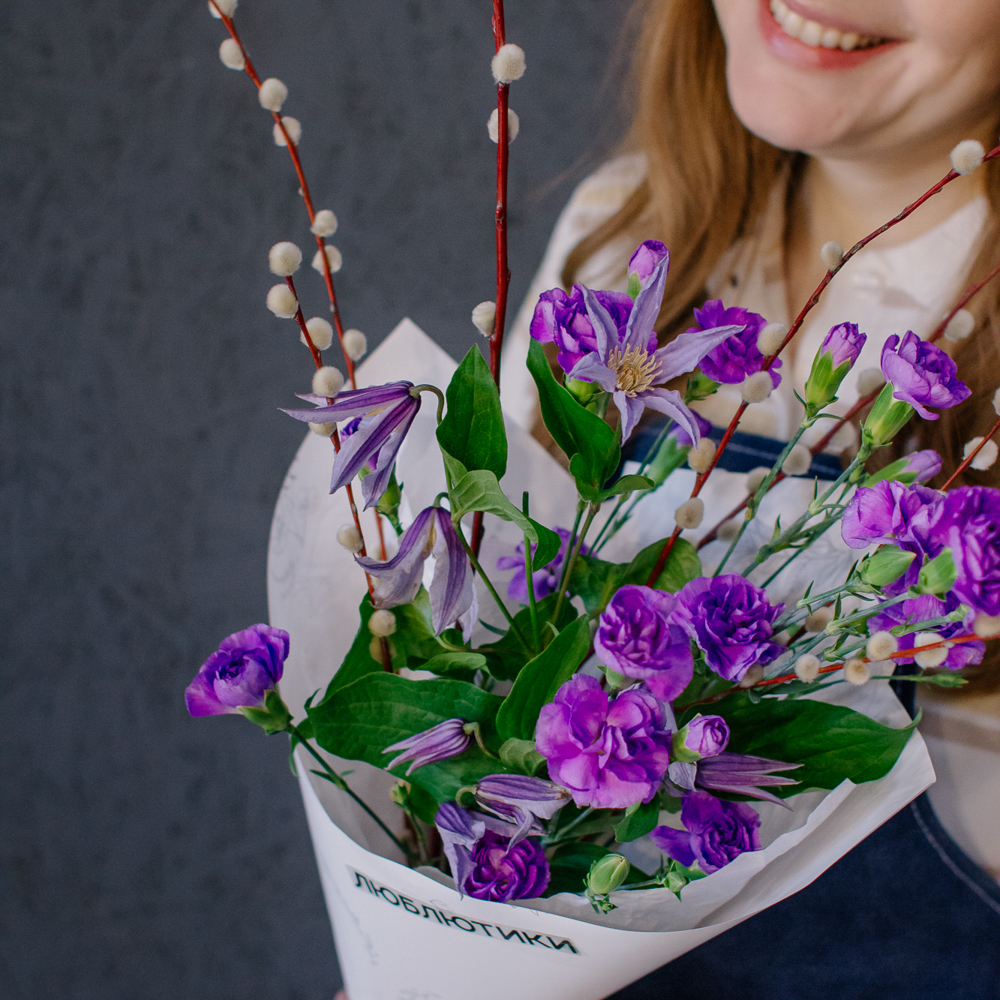 Букет с ярким сиреневым клематисом, кустовыми гвоздиками и веточками вербы — выразительный и с весенним настроением.