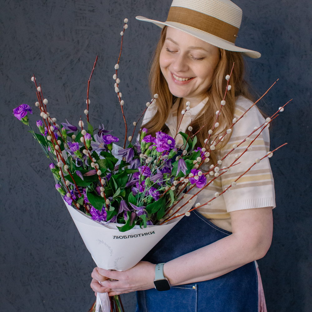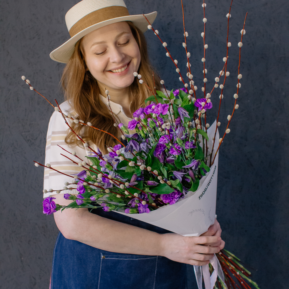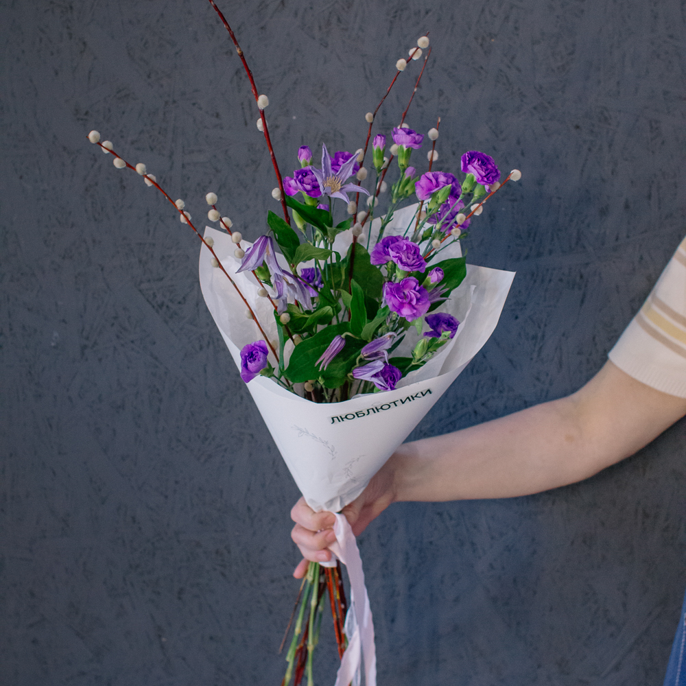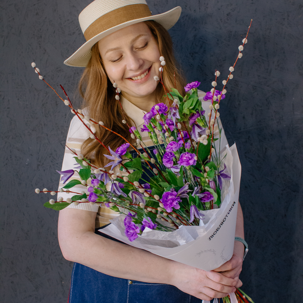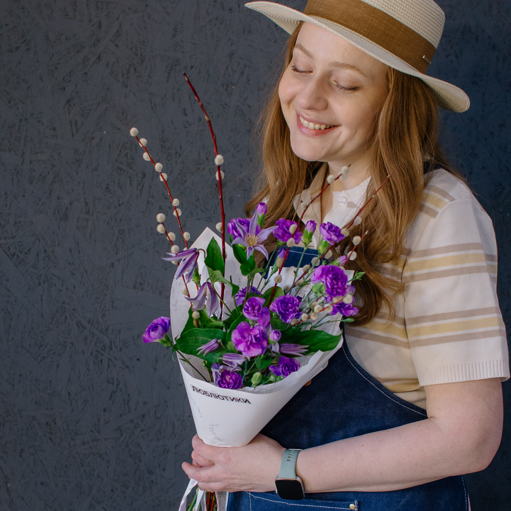Букет с ярким сиреневым клематисом, кустовыми гвоздиками и веточками вербы — выразительный и с весенним настроением.