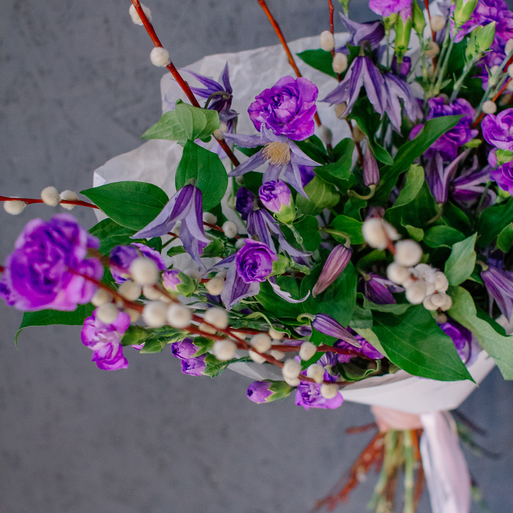 Клематис насыщенного сиреневого оттенка сразу притягивает внимание и задаёт динамику композиции, кустовые гвоздики добавляют объём и мягкость, а веточки вербы придают фактуру и тёплый природный акцент.