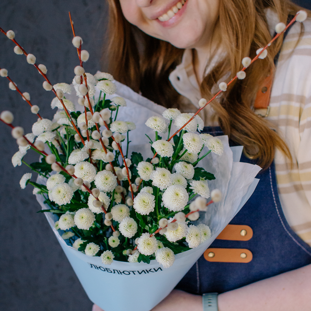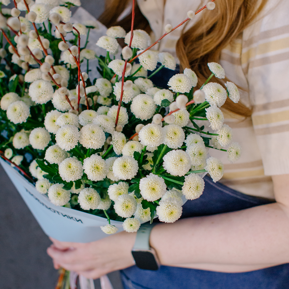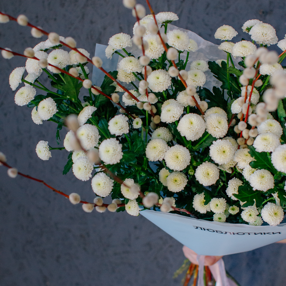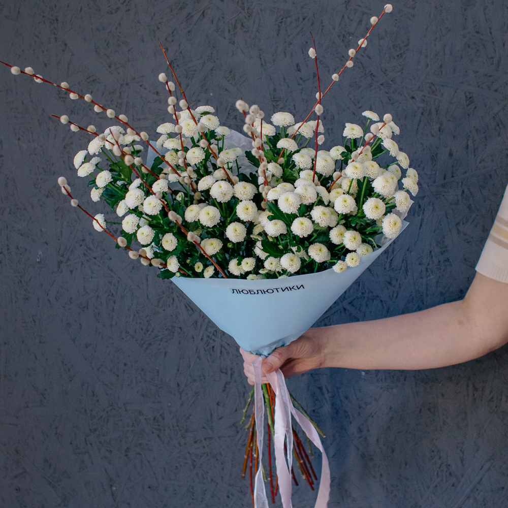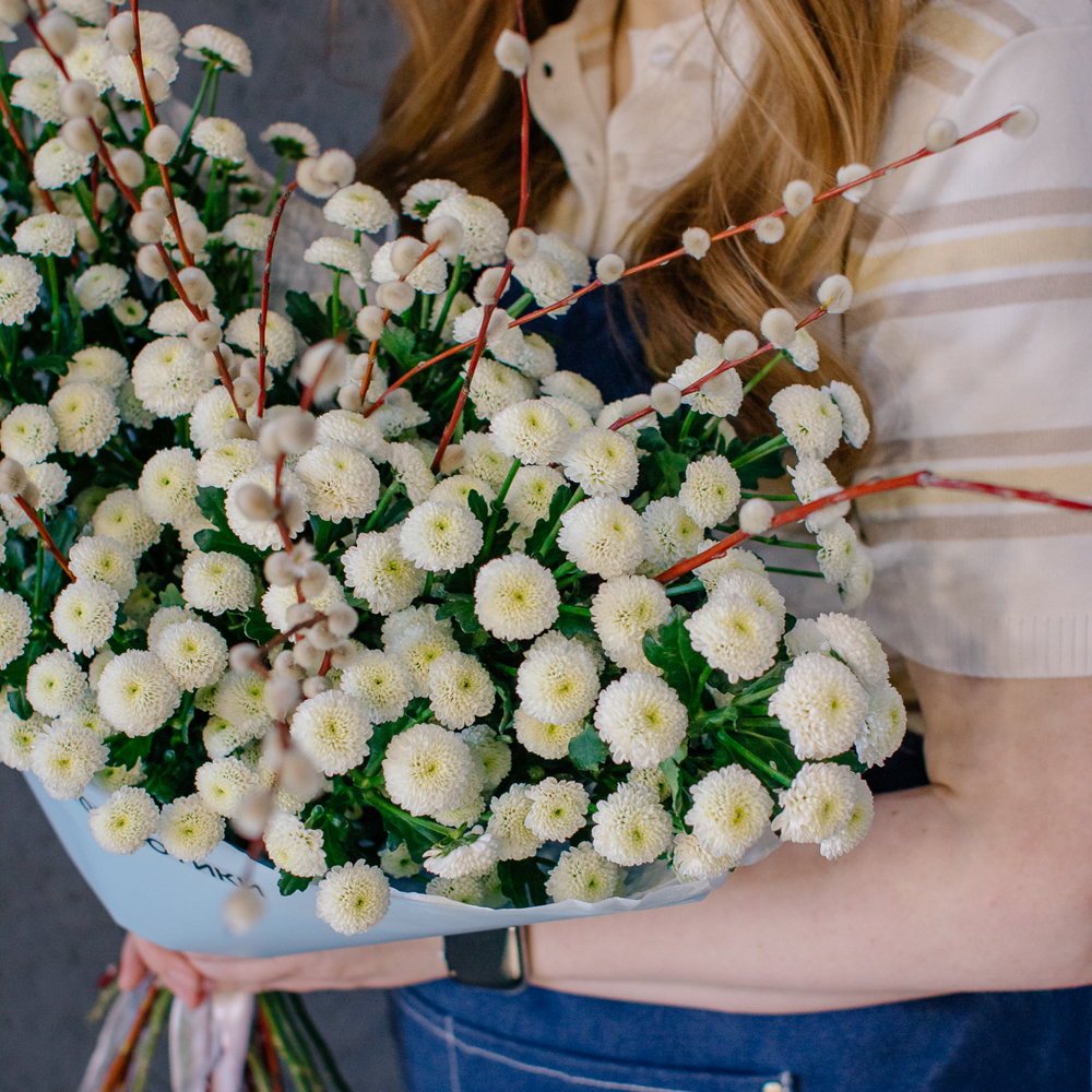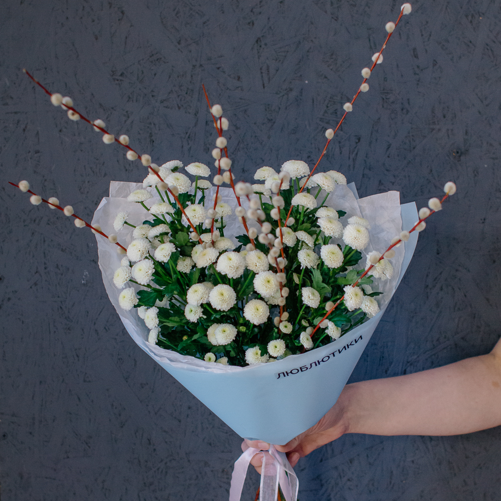 Белый моно-букет из хризантемы сантини с веточками вербы — нежный с весенним настроением.