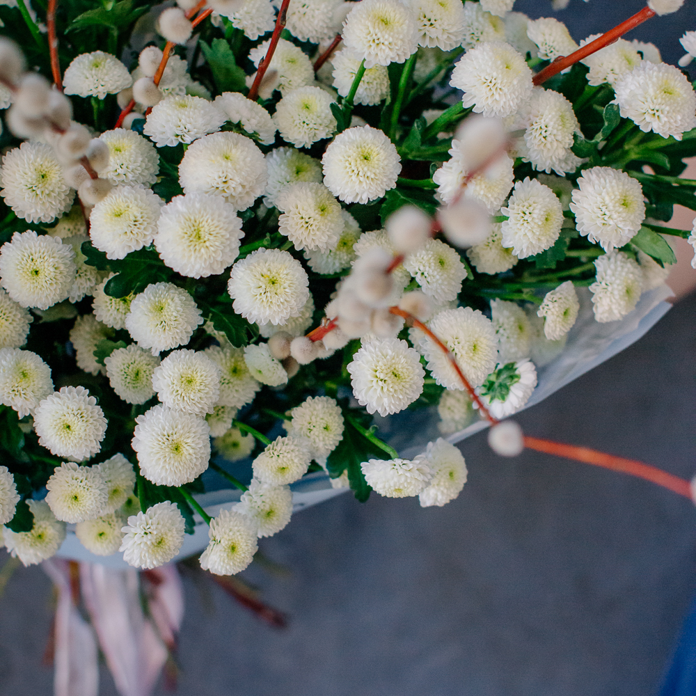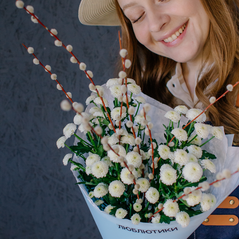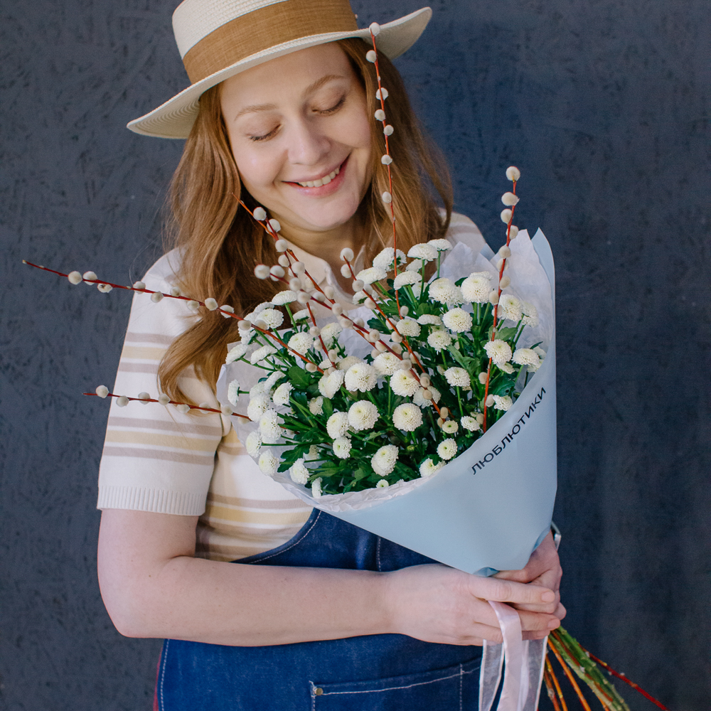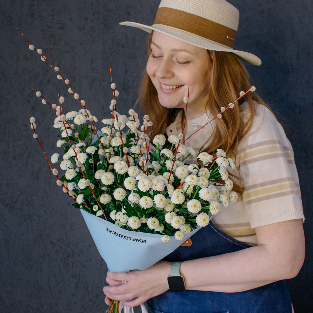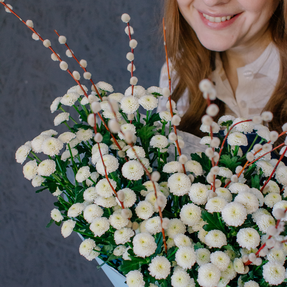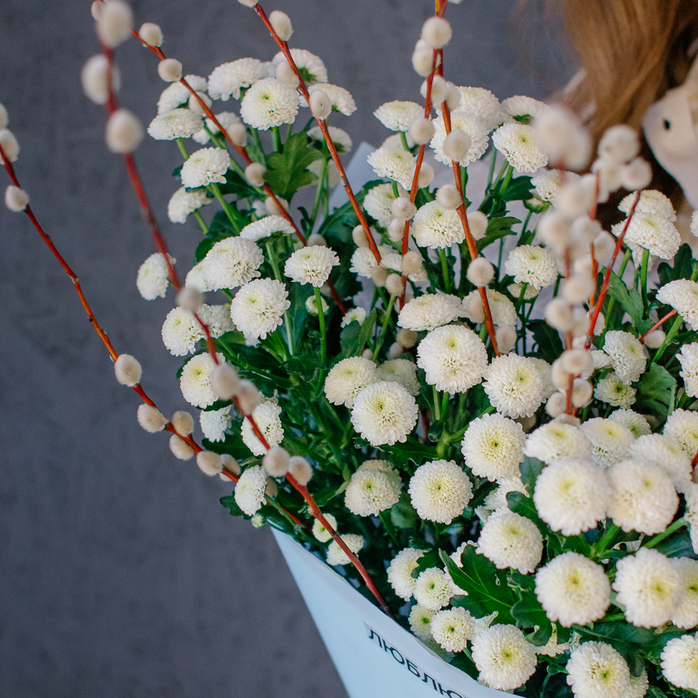 Белый моно-букет из хризантемы сантини с веточками вербы — нежный с весенним настроением.