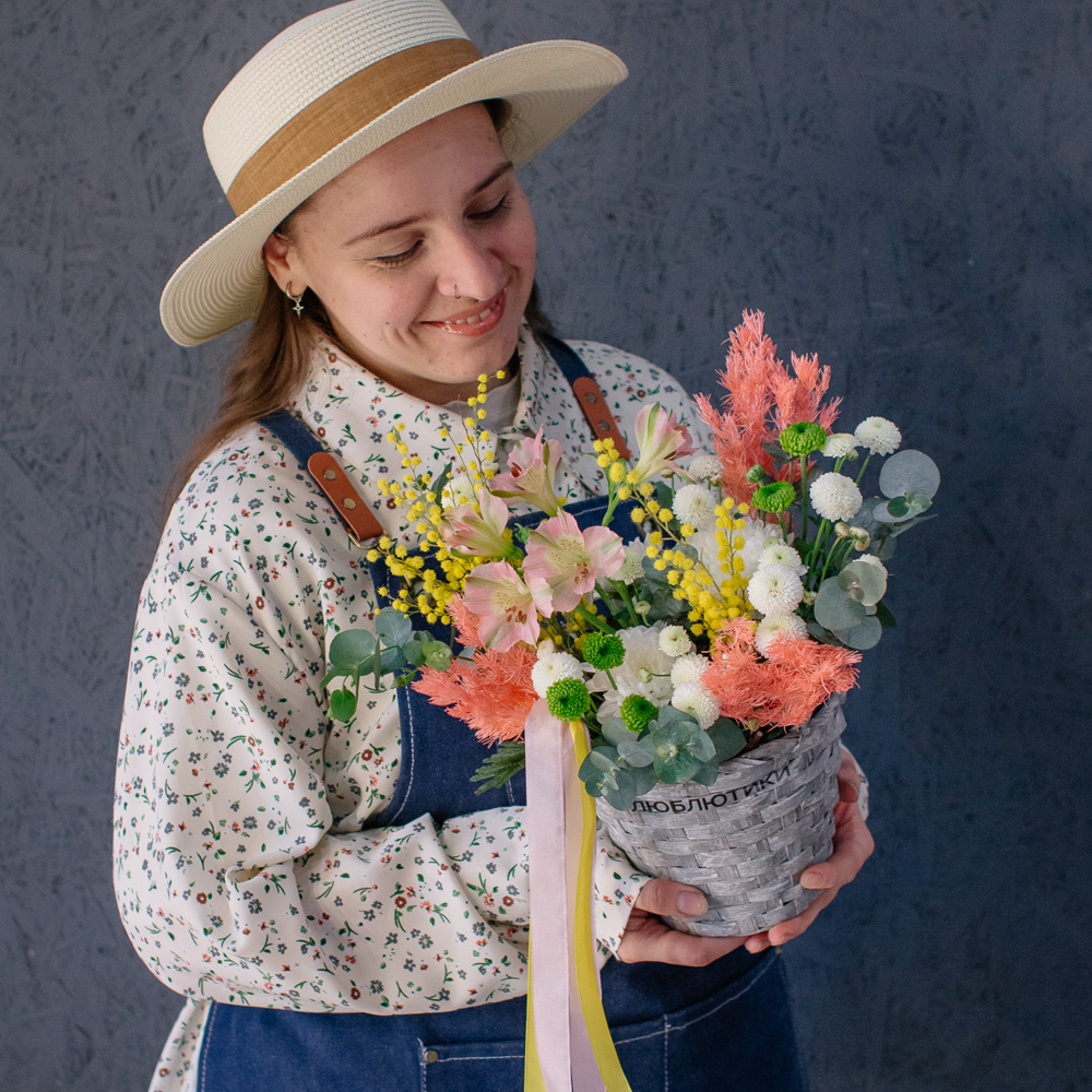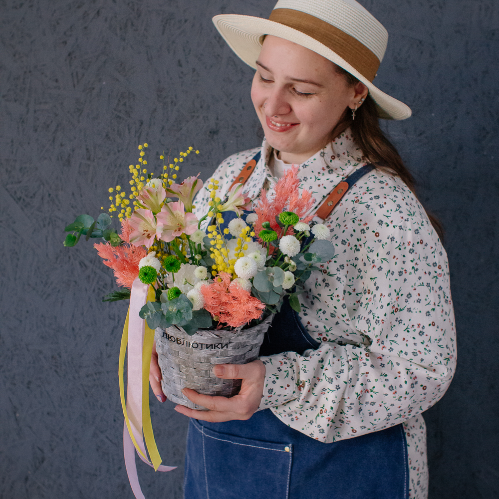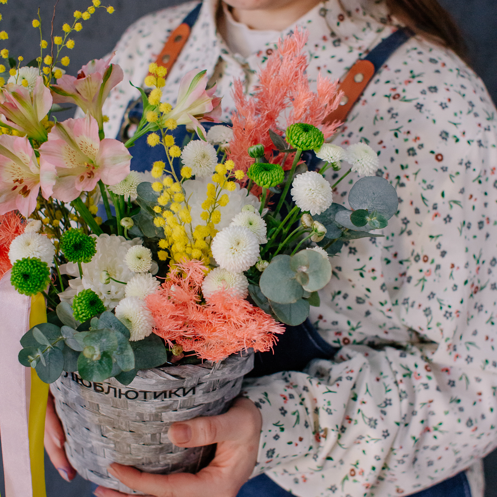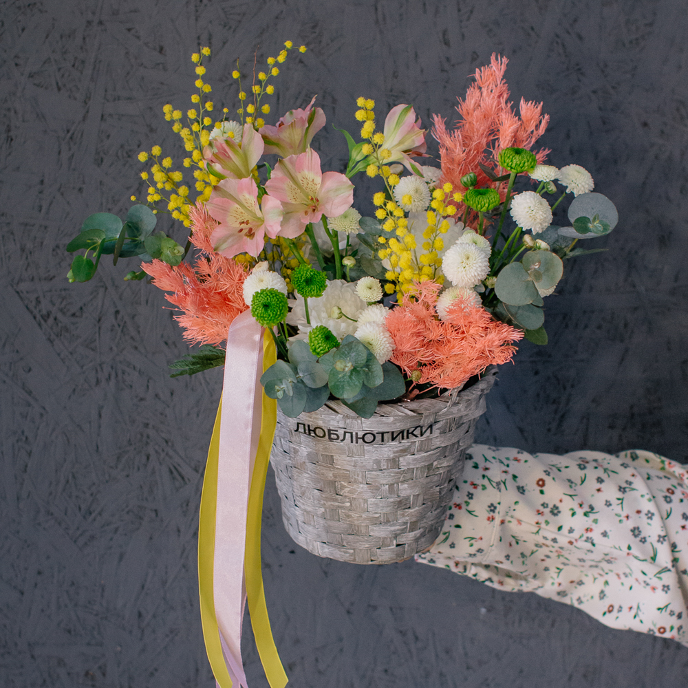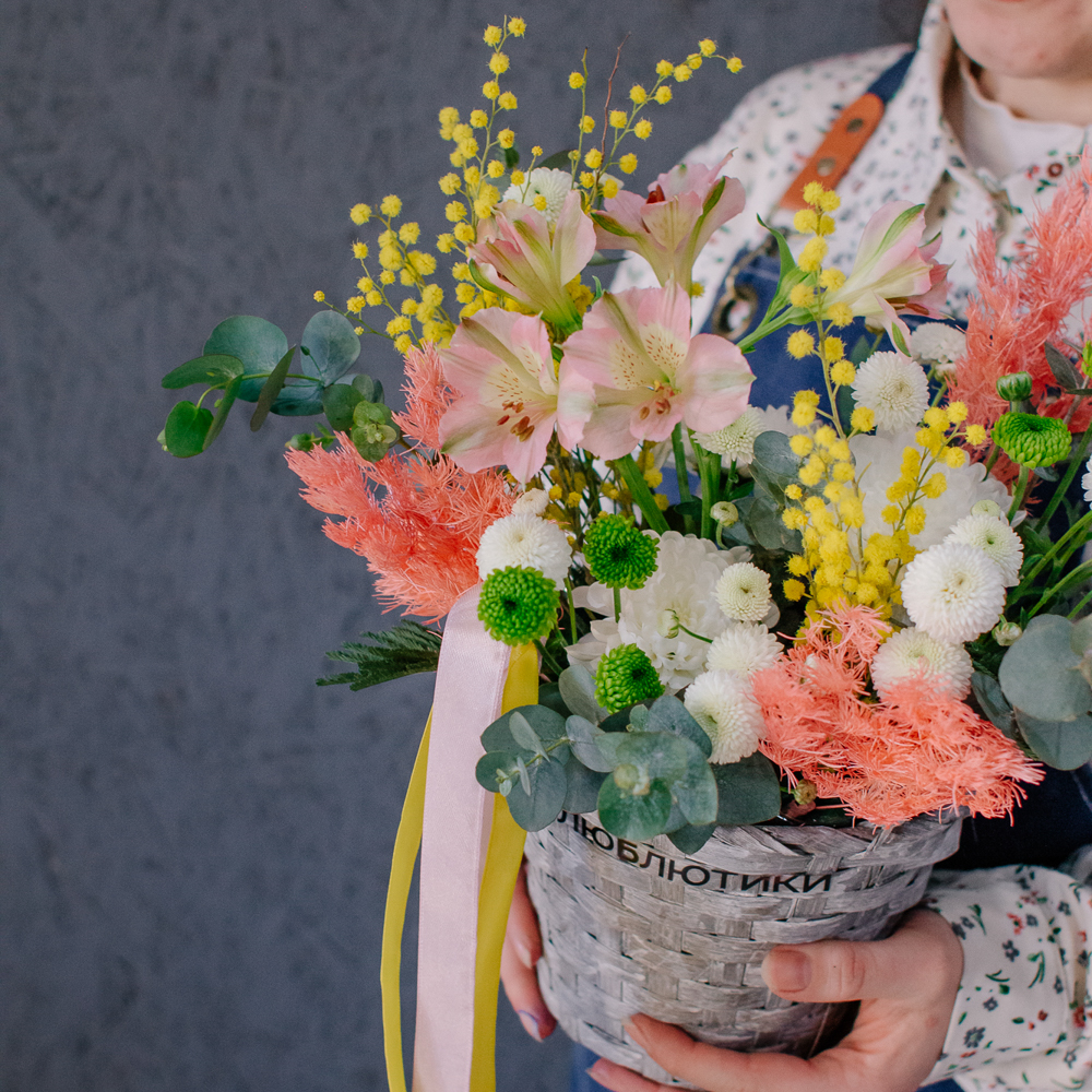Нежная альстромерия добавляет лёгкости и изящества, кустовая хризантема создаёт объём и аккуратную форму, а ароматная мимоза наполняет композицию тёплым весенним настроением. Эвкалипт завершает образ свежими зелёными акцентами и придаёт композиции природную гармонию.