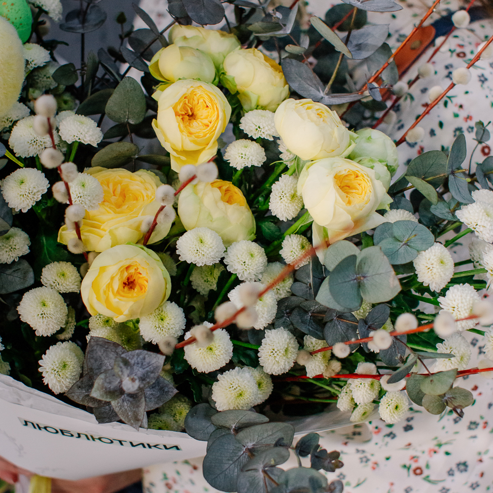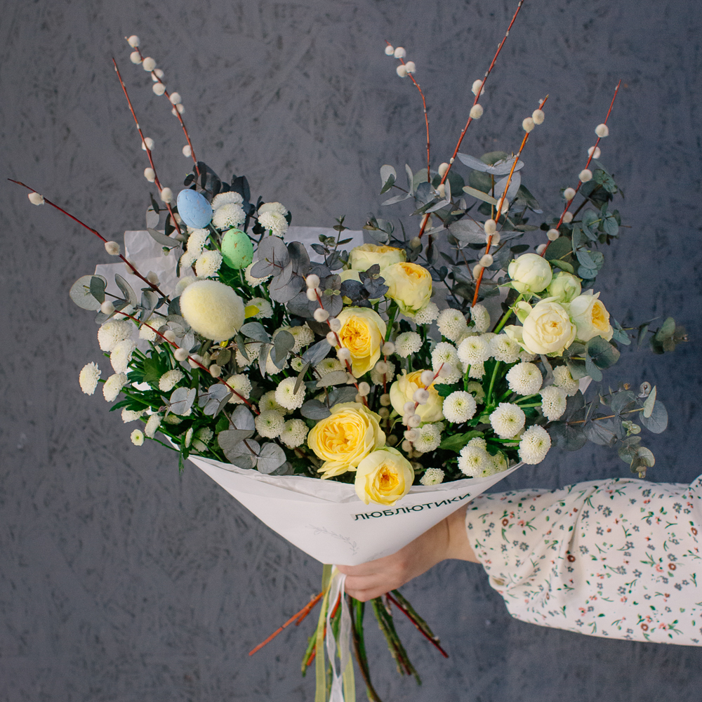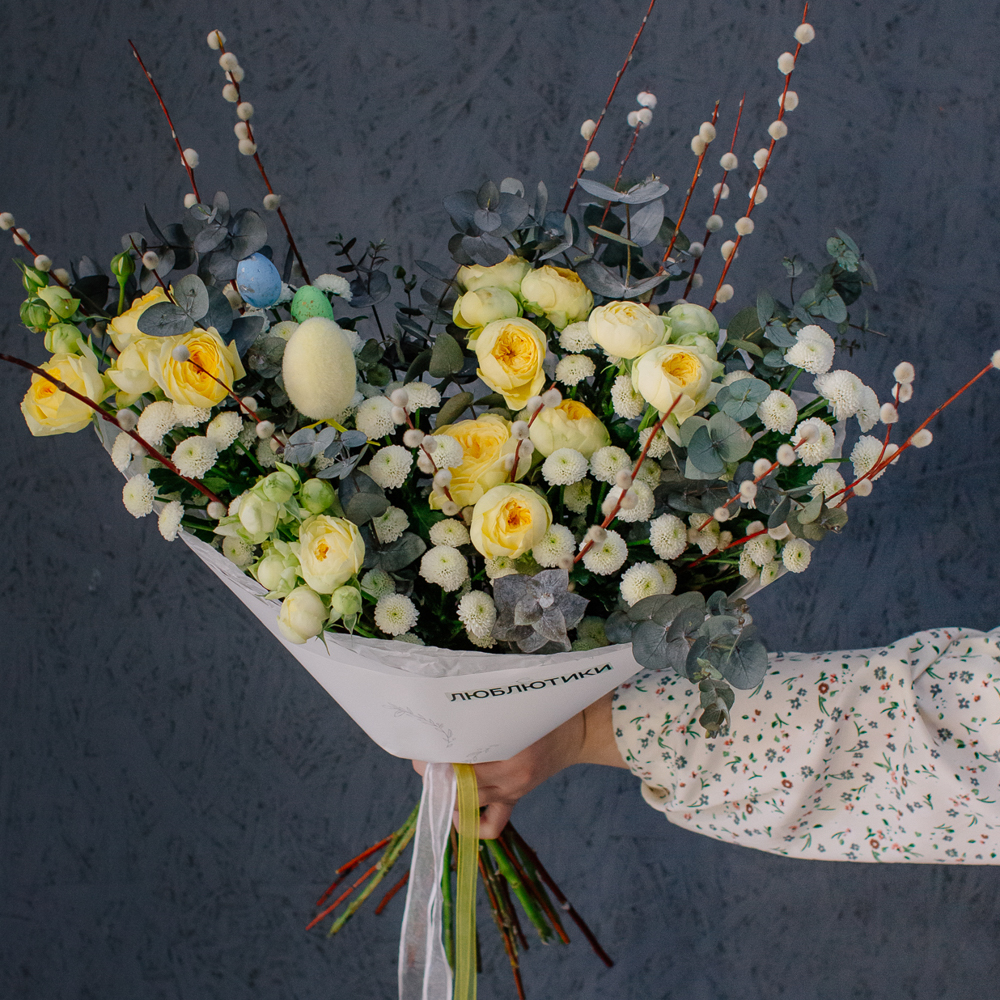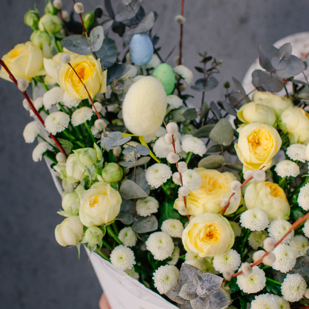 Нежный пасхальный букет с жёлтой кустовой пионовидной розой, вербой и сантини, дополненный эвкалиптом и декоративными пасхальными яйцами. Пышные жёлтые розы наполняют композицию солнечным теплом и мягким объёмом, верба добавляет сезонный акцент и лёгкую фактуру, а сантини поддерживают цветовую гармонию и придают букету аккуратную структуру. Прохладные оттенки эвкалипта создают свежий контраст с яркостью жёлтых цветов, делая композицию особенно сбалансированной и живой.