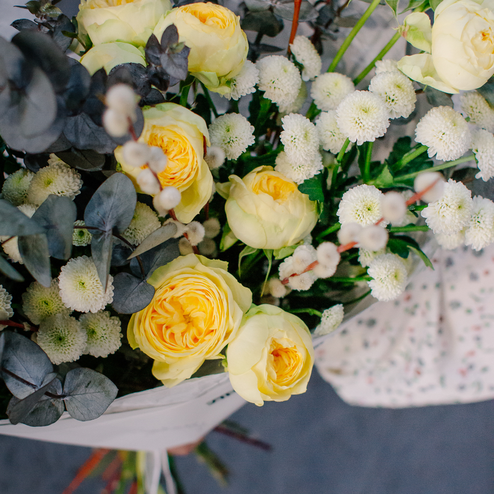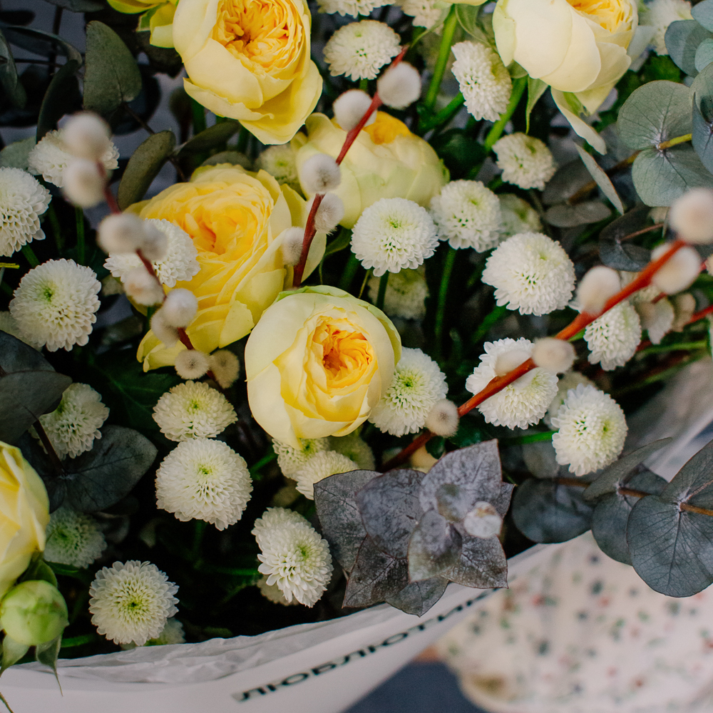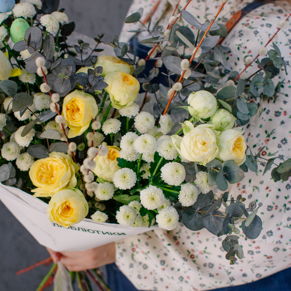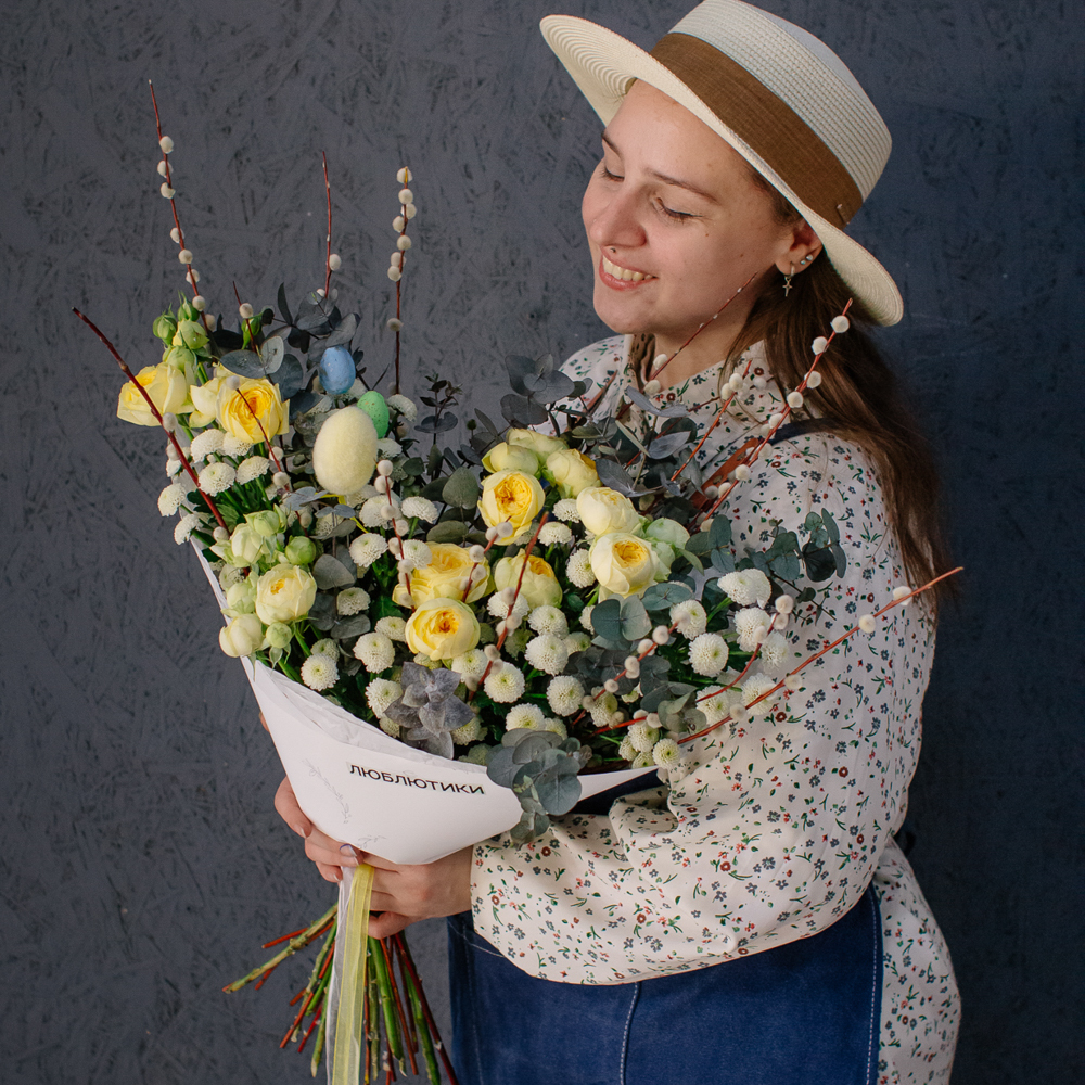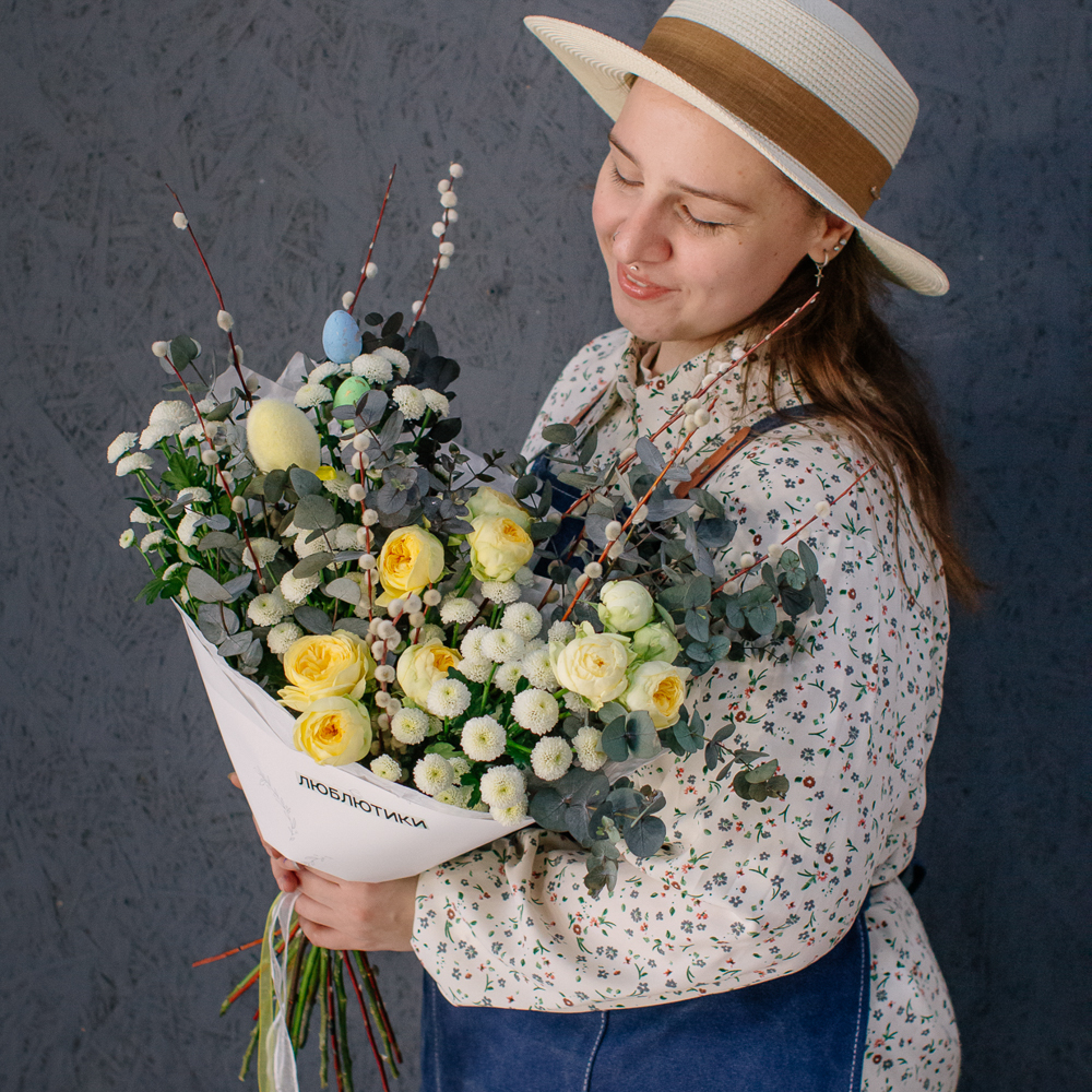 Нежный пасхальный букет с жёлтой кустовой пионовидной розой, вербой и сантини, дополненный эвкалиптом и декоративными пасхальными яйцами. Пышные жёлтые розы наполняют композицию солнечным теплом и мягким объёмом, верба добавляет сезонный акцент и лёгкую фактуру, а сантини поддерживают цветовую гармонию и придают букету аккуратную структуру. Прохладные оттенки эвкалипта создают свежий контраст с яркостью жёлтых цветов, делая композицию особенно сбалансированной и живой.