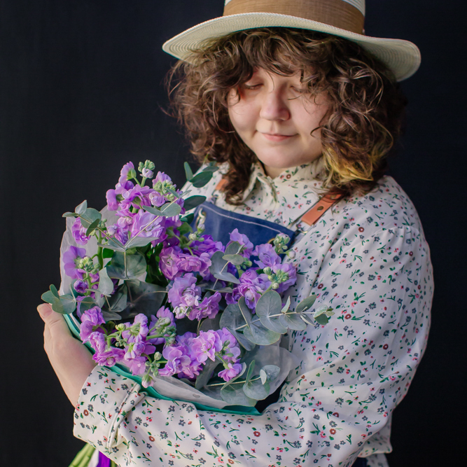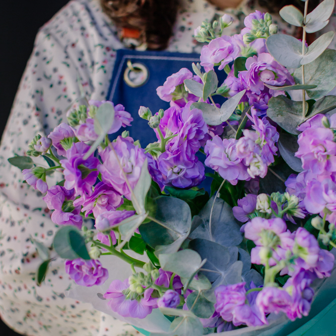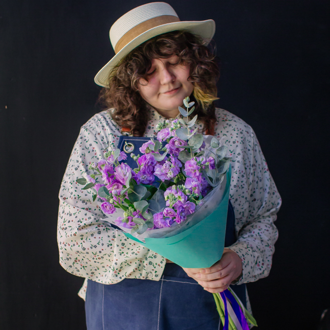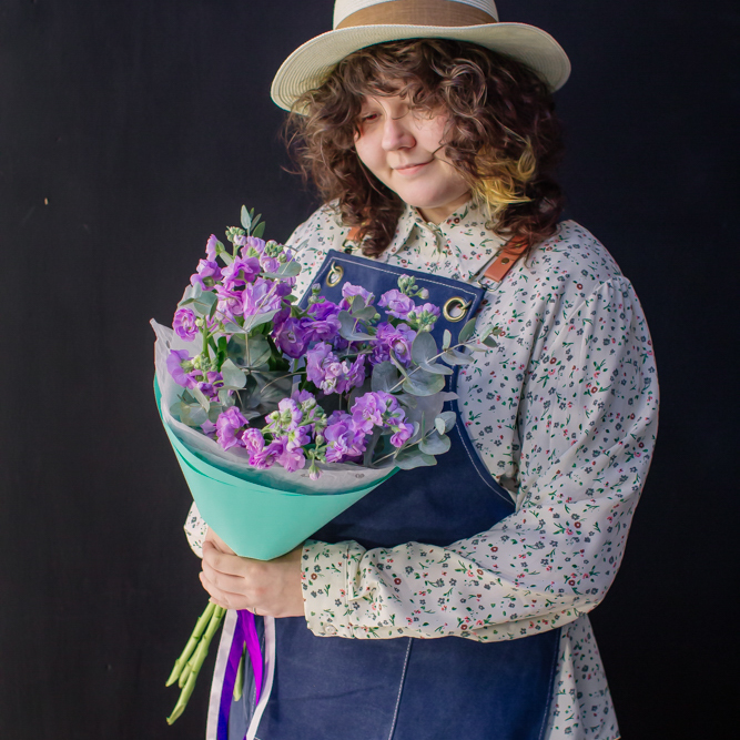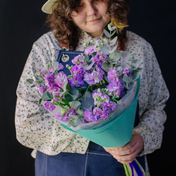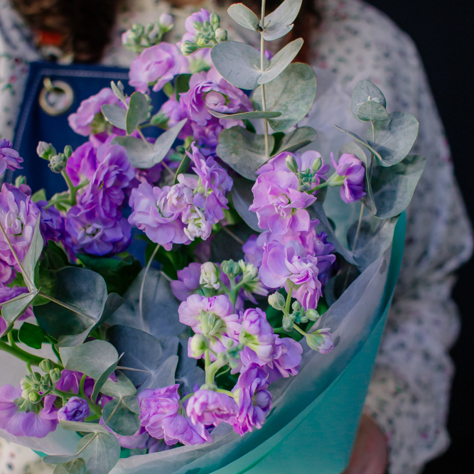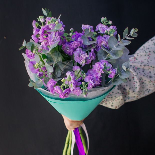 Аккуратный букет из ароматнейшей маттиолы и эвкалипта - нежный, милый, чистая романтика в упаковке!