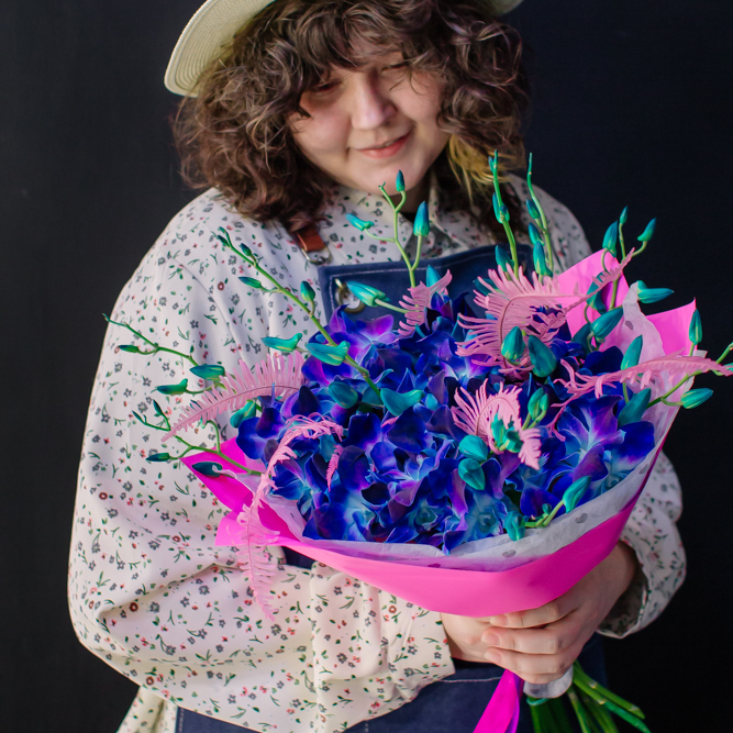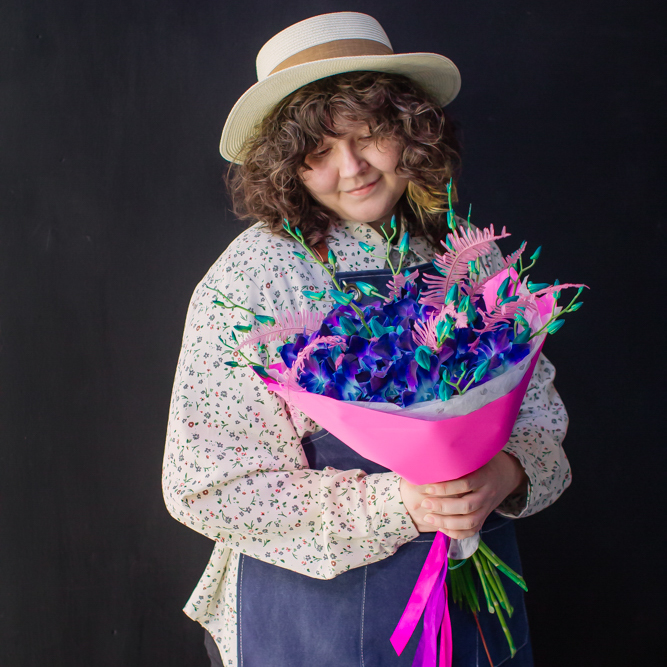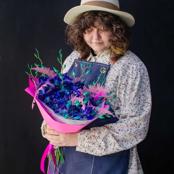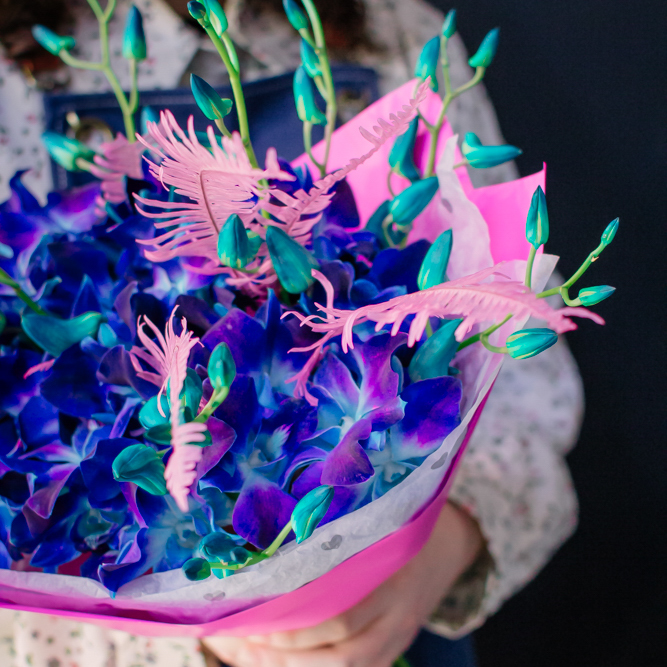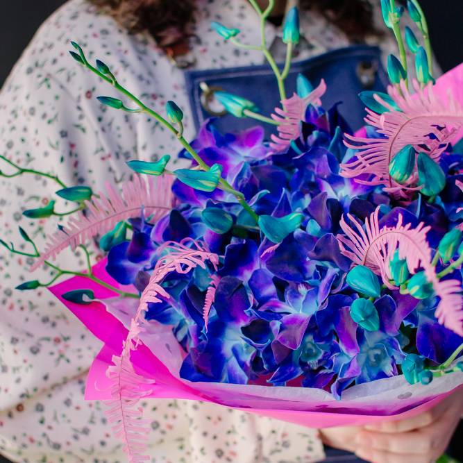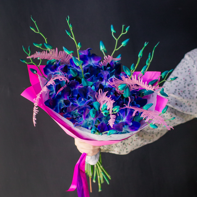 Неоновый сине-розовый букет из орхидеи дендробиум и стабилизированного папоротника.