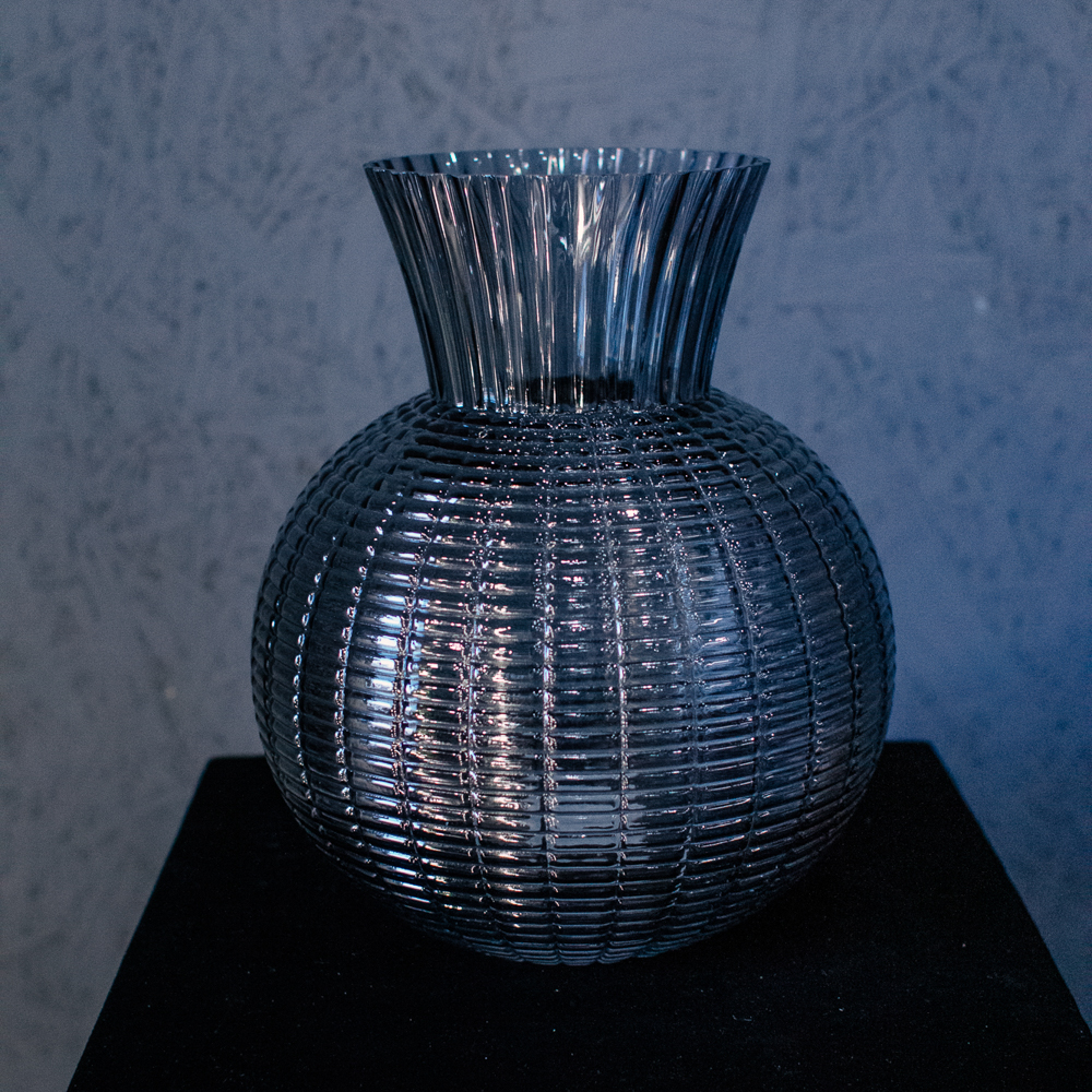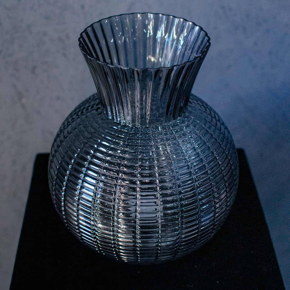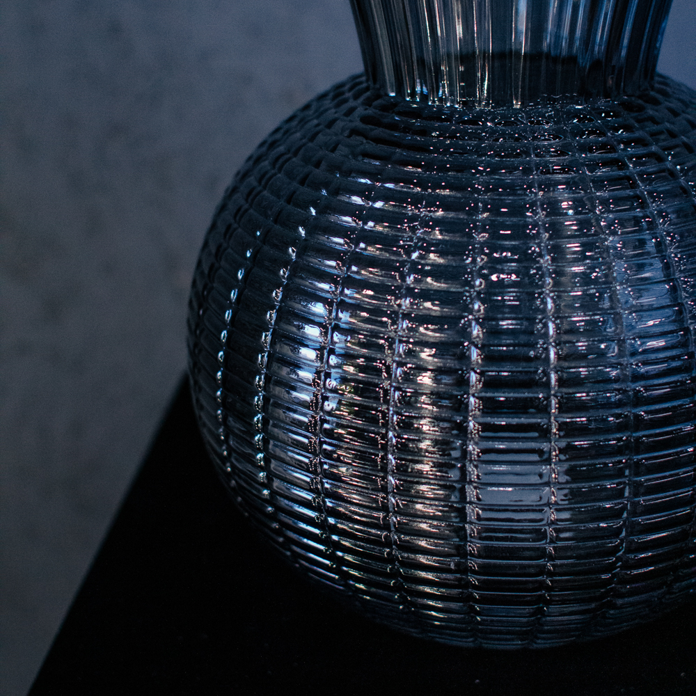 Округлая форма и рельефные засечки создают интересную игру света. Глубокий сине-серый цвет делает вазу акцентной. Идеальна для гостиной; подходит для букетов L и XL.