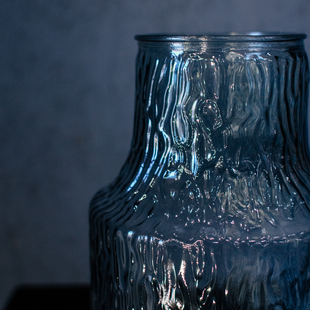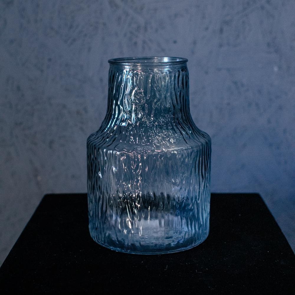 Рельеф, напоминающий стекающую воду, придаёт вазе лёгкую динамику и свежесть. Полупрозрачный синеватый оттенок красиво раскрывает стебли и воду. Идеальна для кухни или спальни; подходит для букетов S и M.