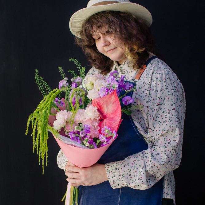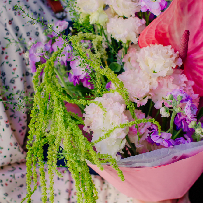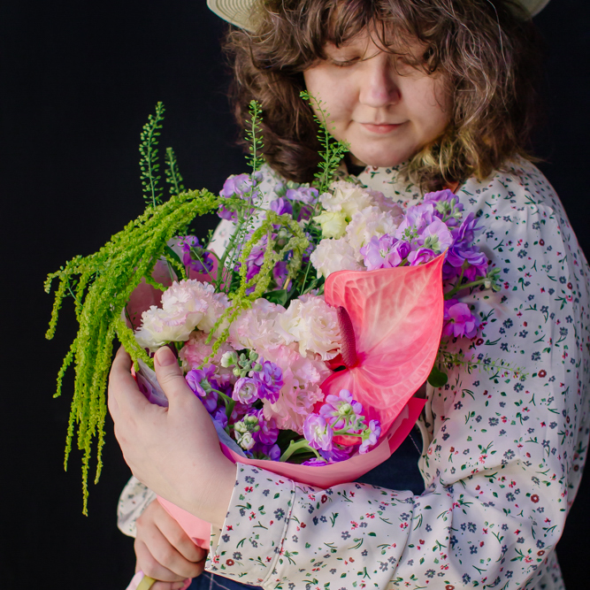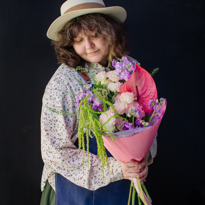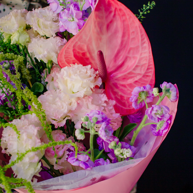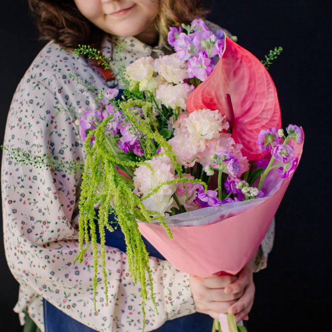 Авторский букет-комплимент с ярким антуриумом, нежной эустомой, маттиолой, зеленью тласпи и акцентом в виде зеленого амаранта.