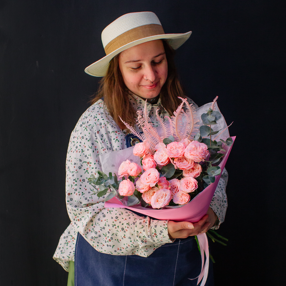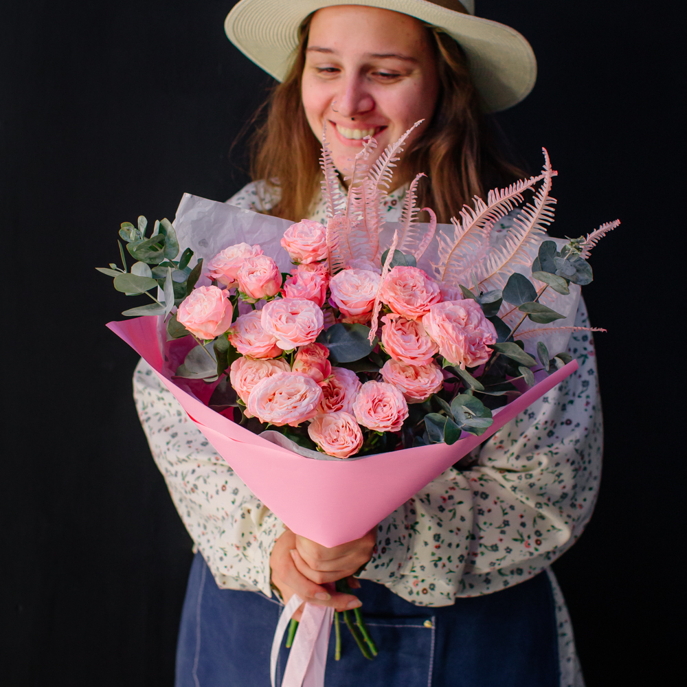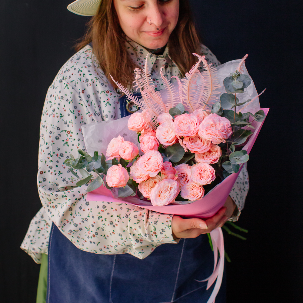 Нестареющая классика! букет-комплимент из кустовых пионовидных роз сорта Бомбастик, эвкалипта и стабилизированного папоротника.
