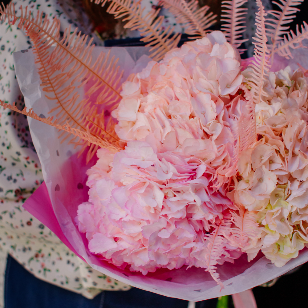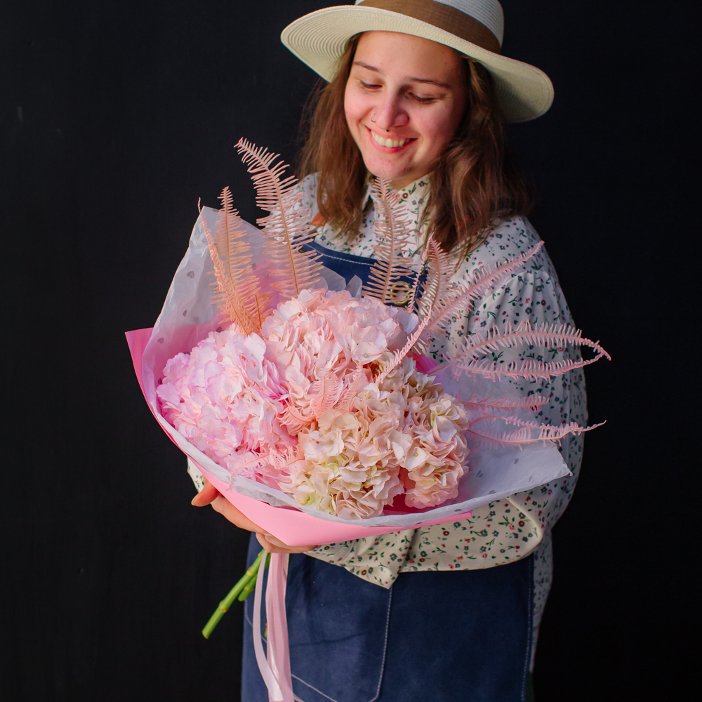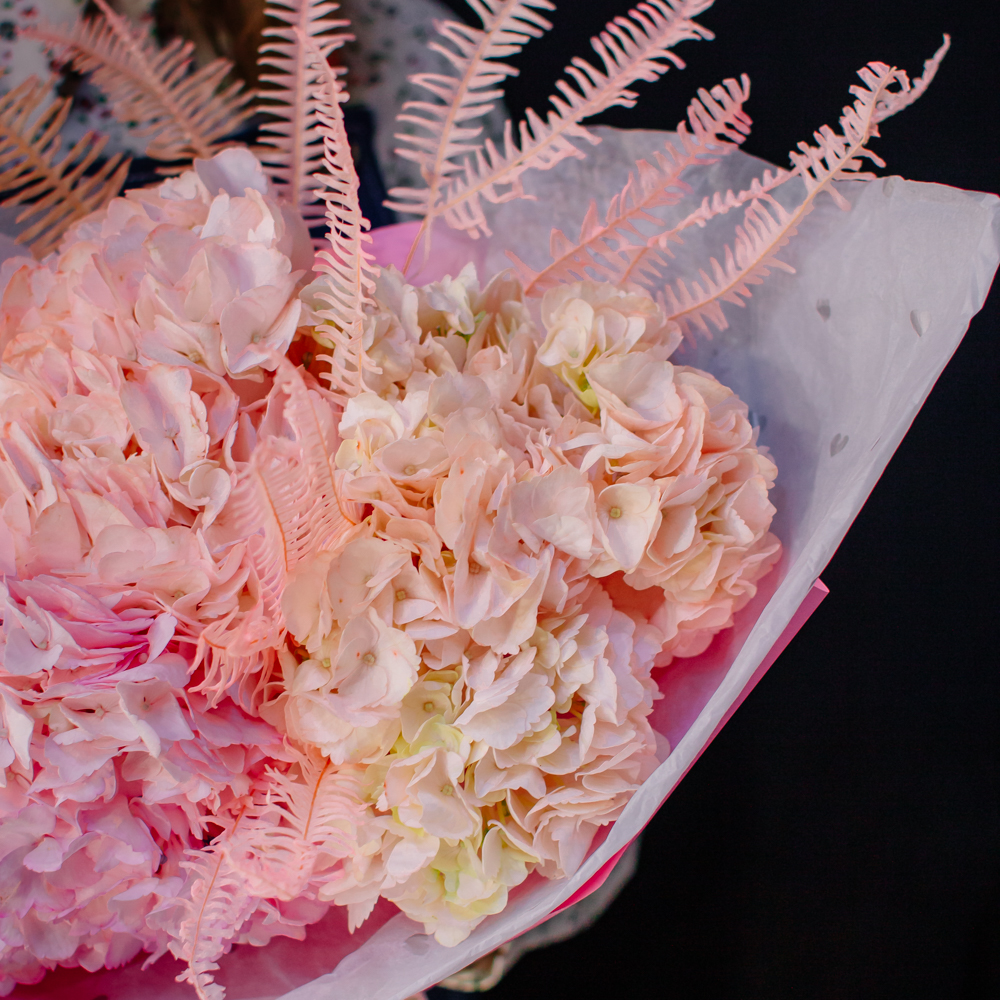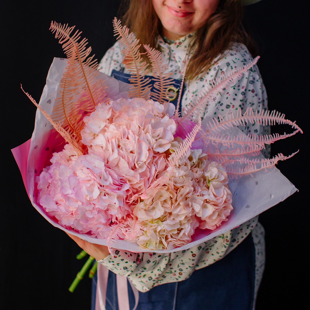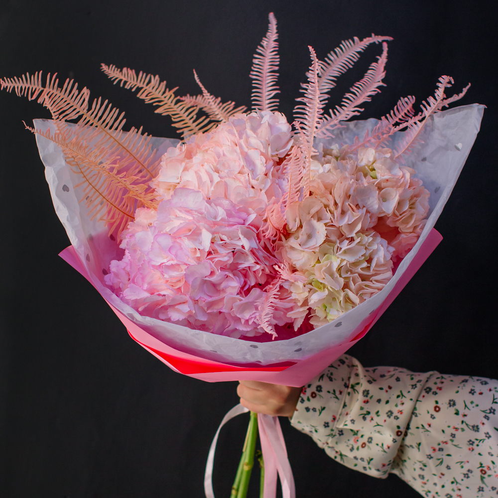 Воздушный моно-букет из гортензий с акцентом из стабилизированного папоротника Амбрелла.