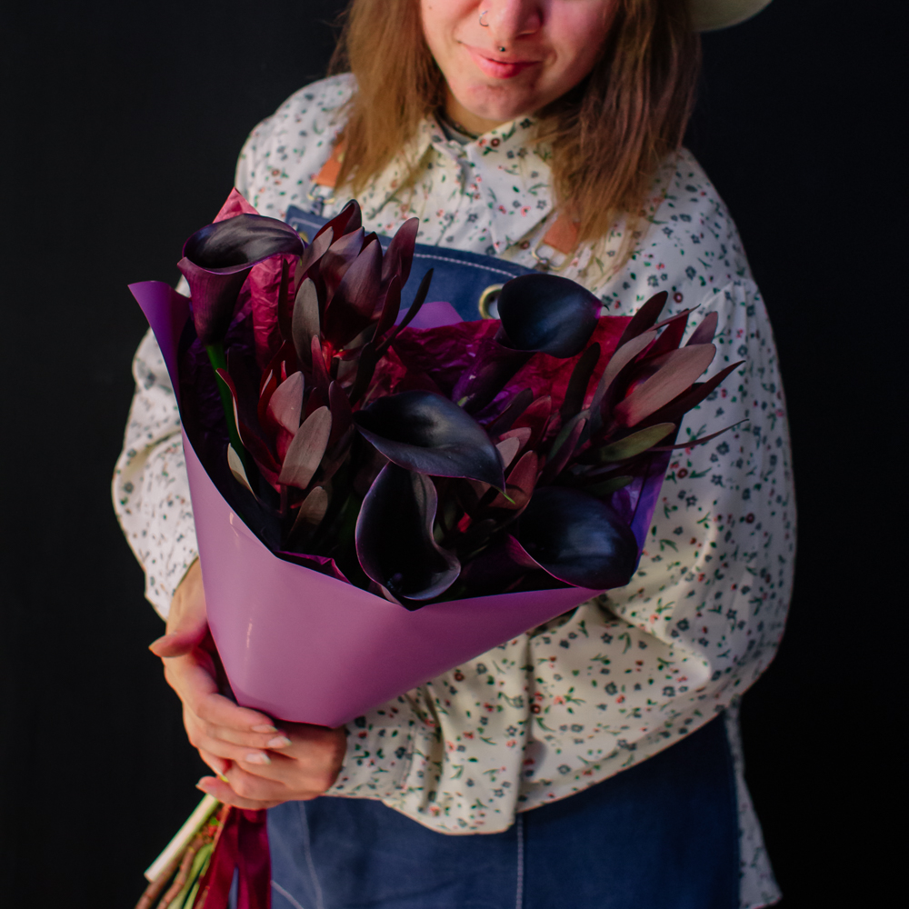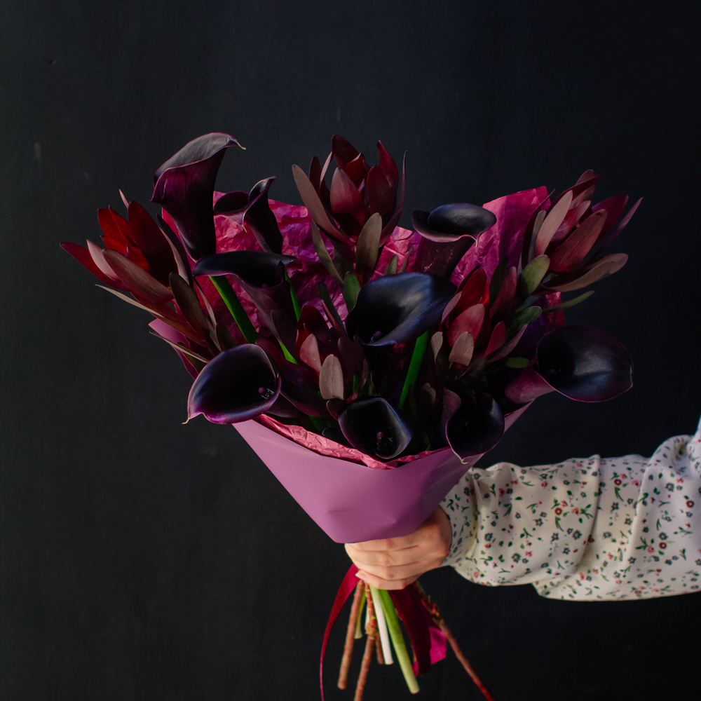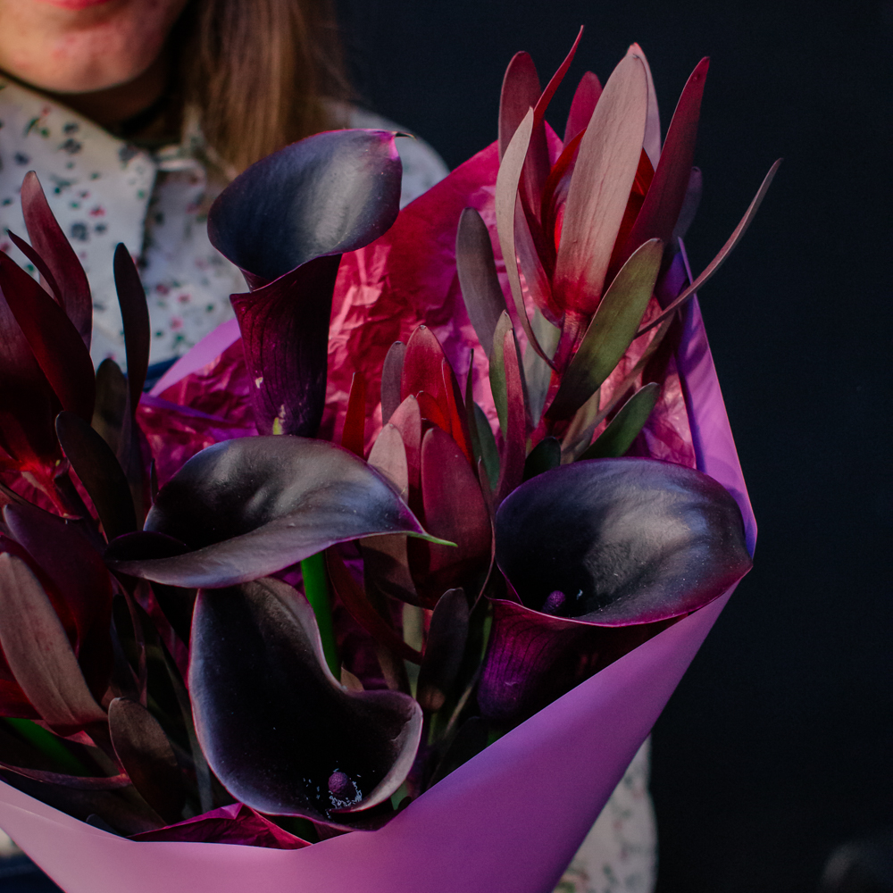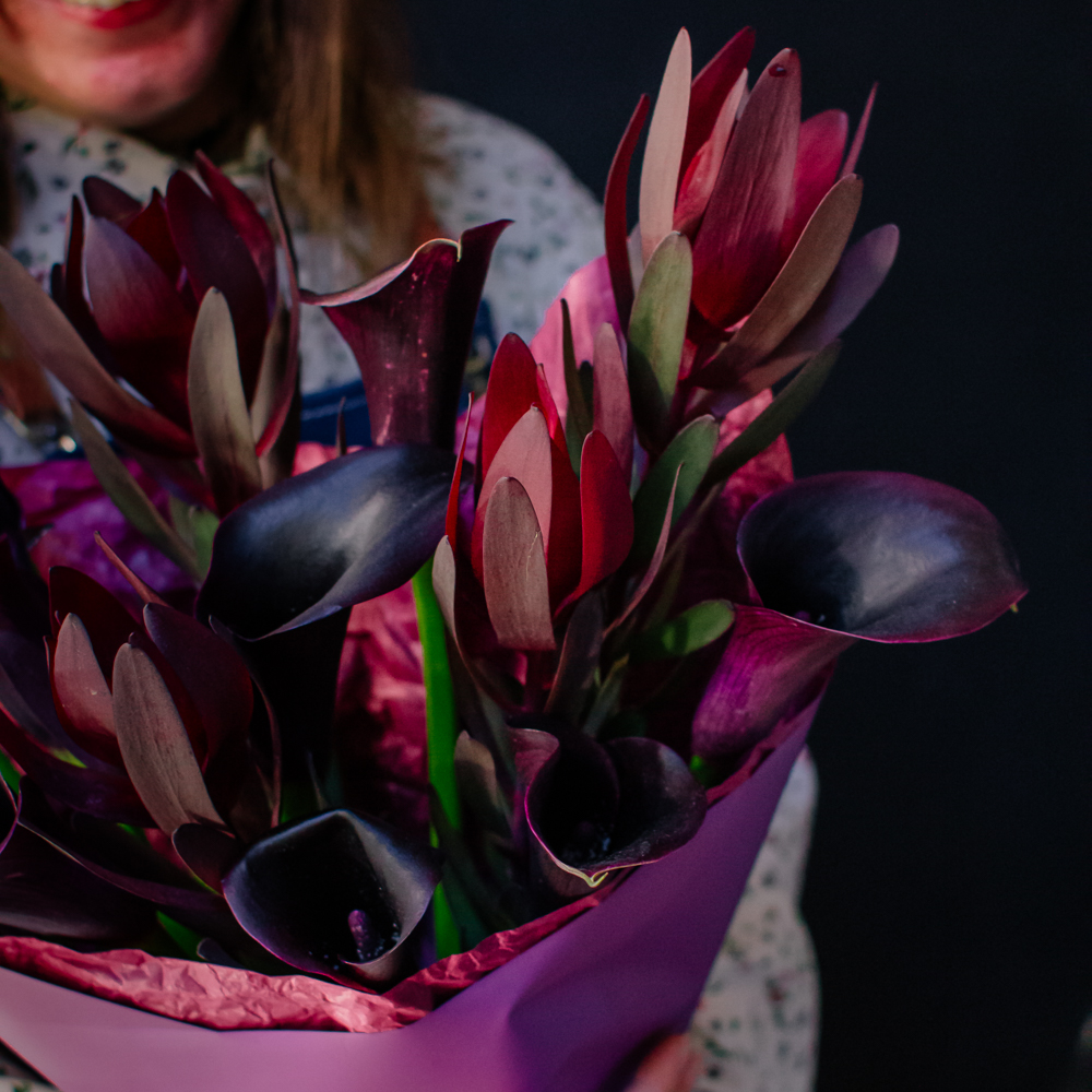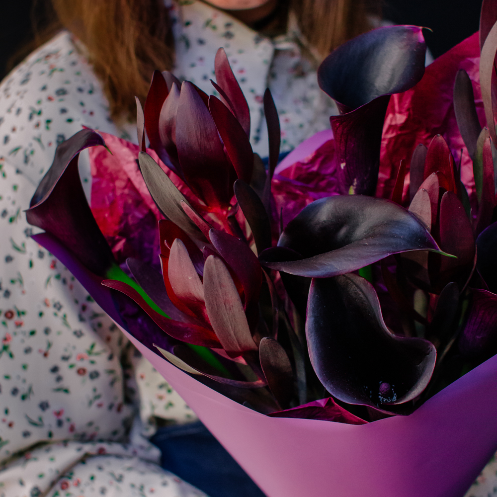 Бордовый оттенок леукондендронов и иссиня-черные, будто бархатные, каллы создают ощущение элегантности и силы. Такой букет подойдёт тем, кто ценит стиль и выразительность в каждом жесте.
