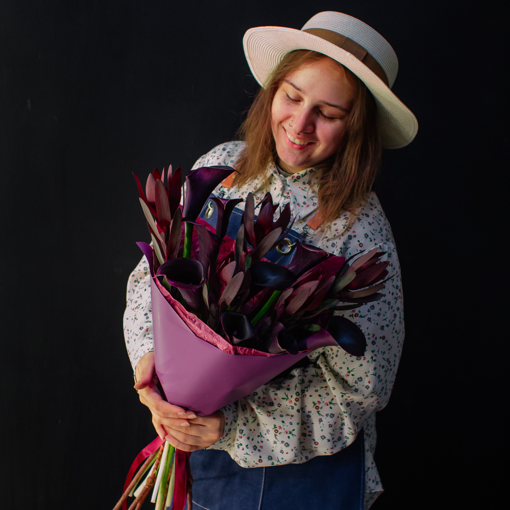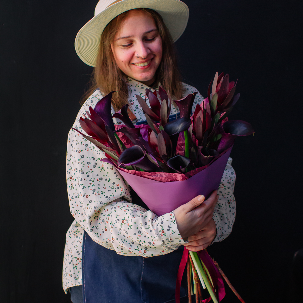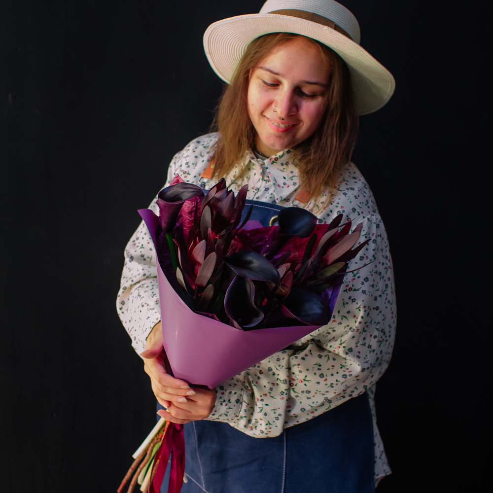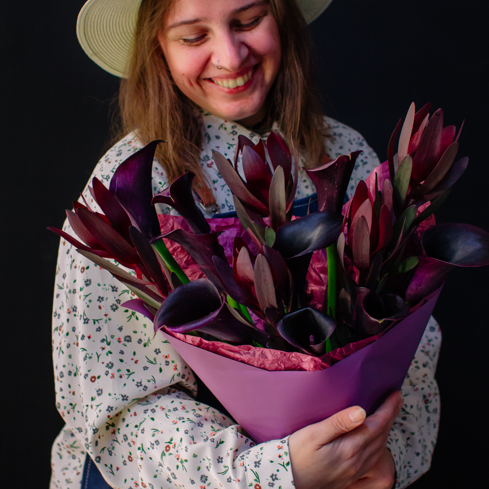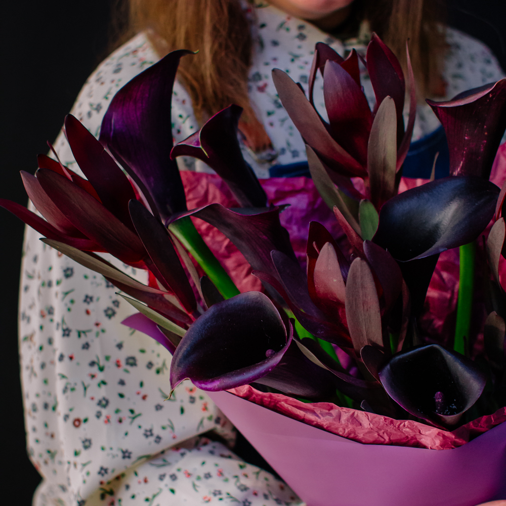 Бордовый оттенок леукондендронов и иссиня-черные, будто бархатные, каллы создают ощущение элегантности и силы. Такой букет подойдёт тем, кто ценит стиль и выразительность в каждом жесте.