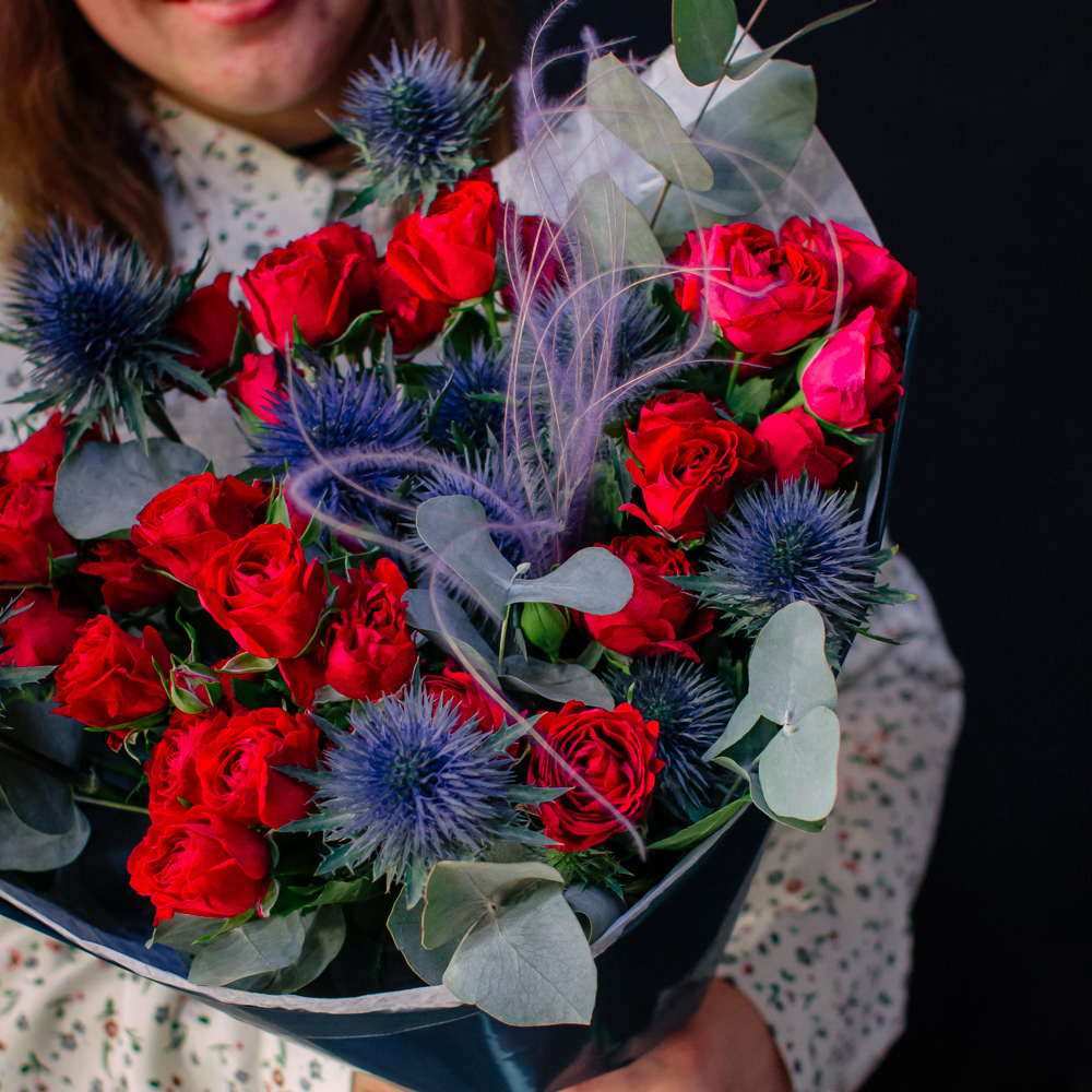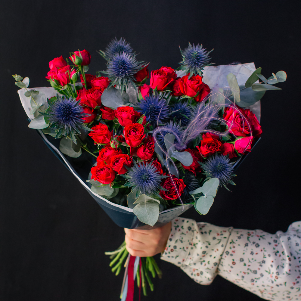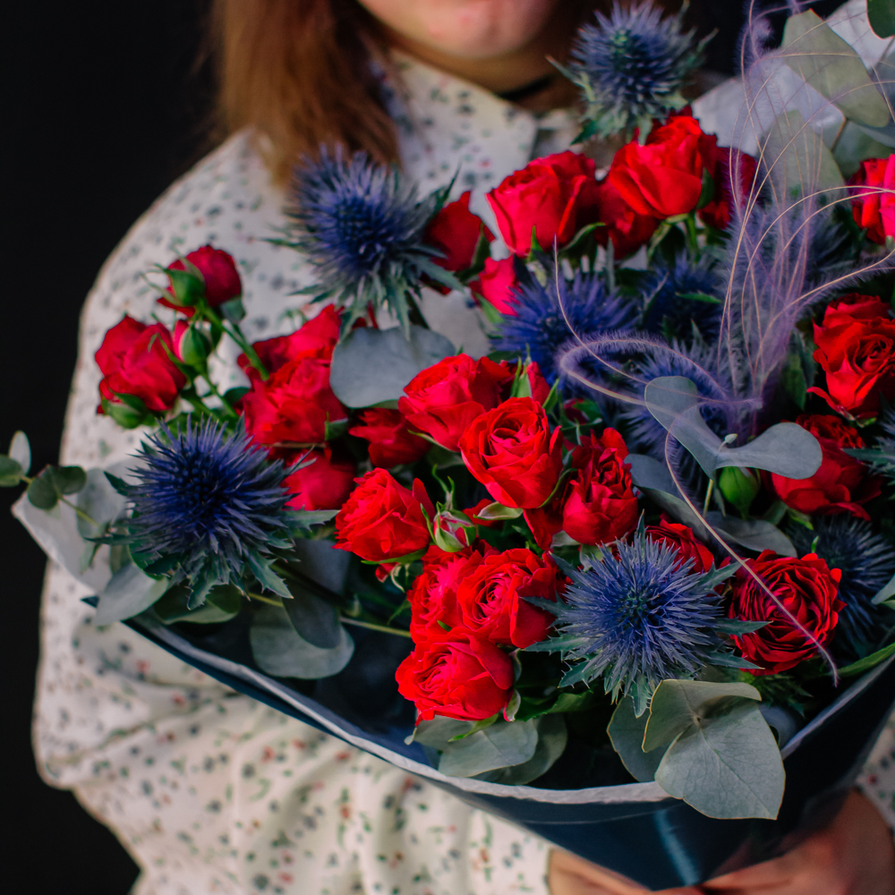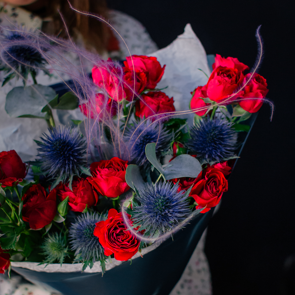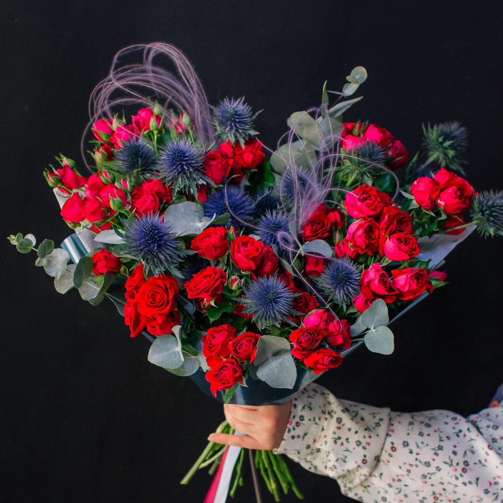 Темно-синий эрингиум и алые кустовые розы переплетаются, словно ночь встречает рассвет. Такой букет дарит ощущение праздника и волны вдохновения!