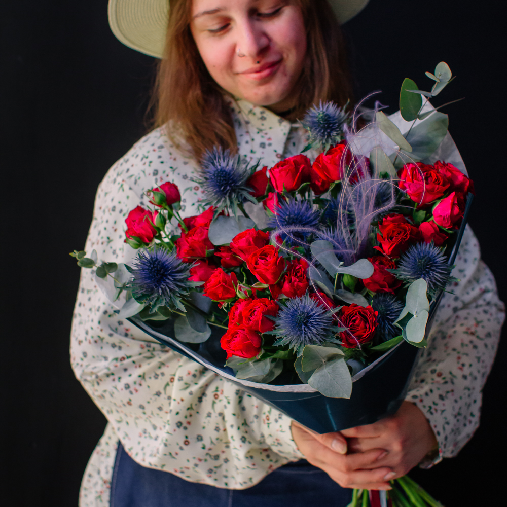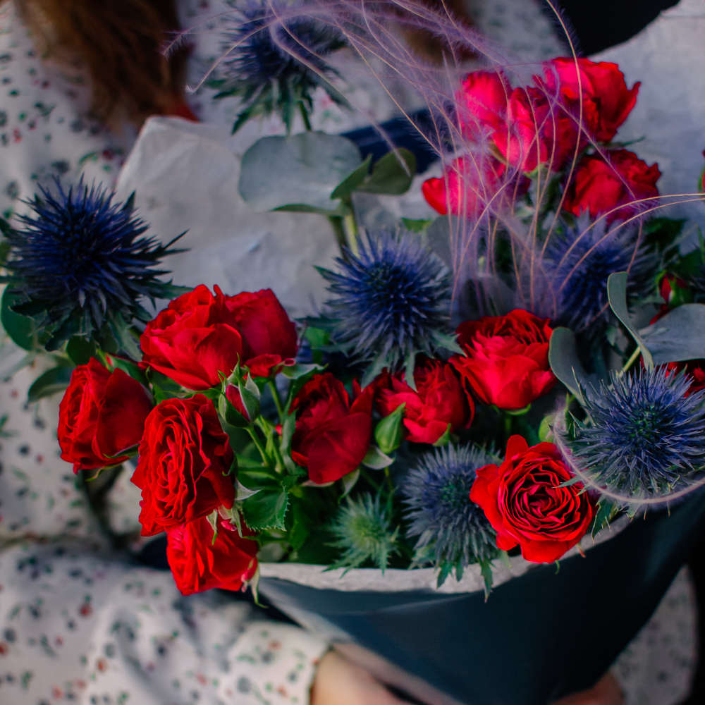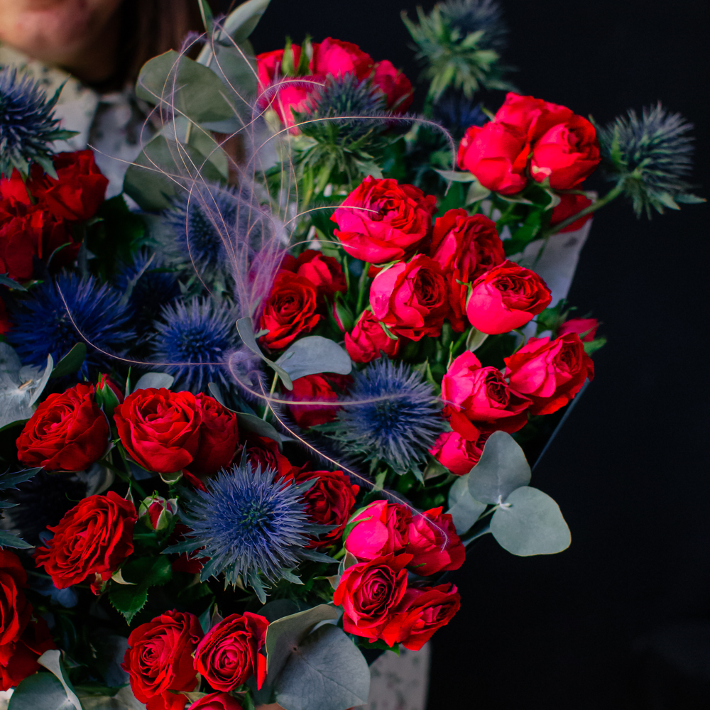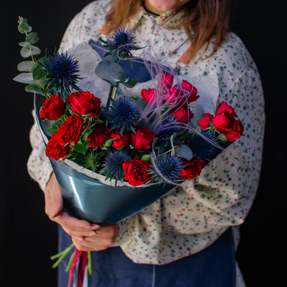 Темно-синий эрингиум и алые кустовые розы переплетаются, словно ночь встречает рассвет. Такой букет дарит ощущение праздника и волны вдохновения!