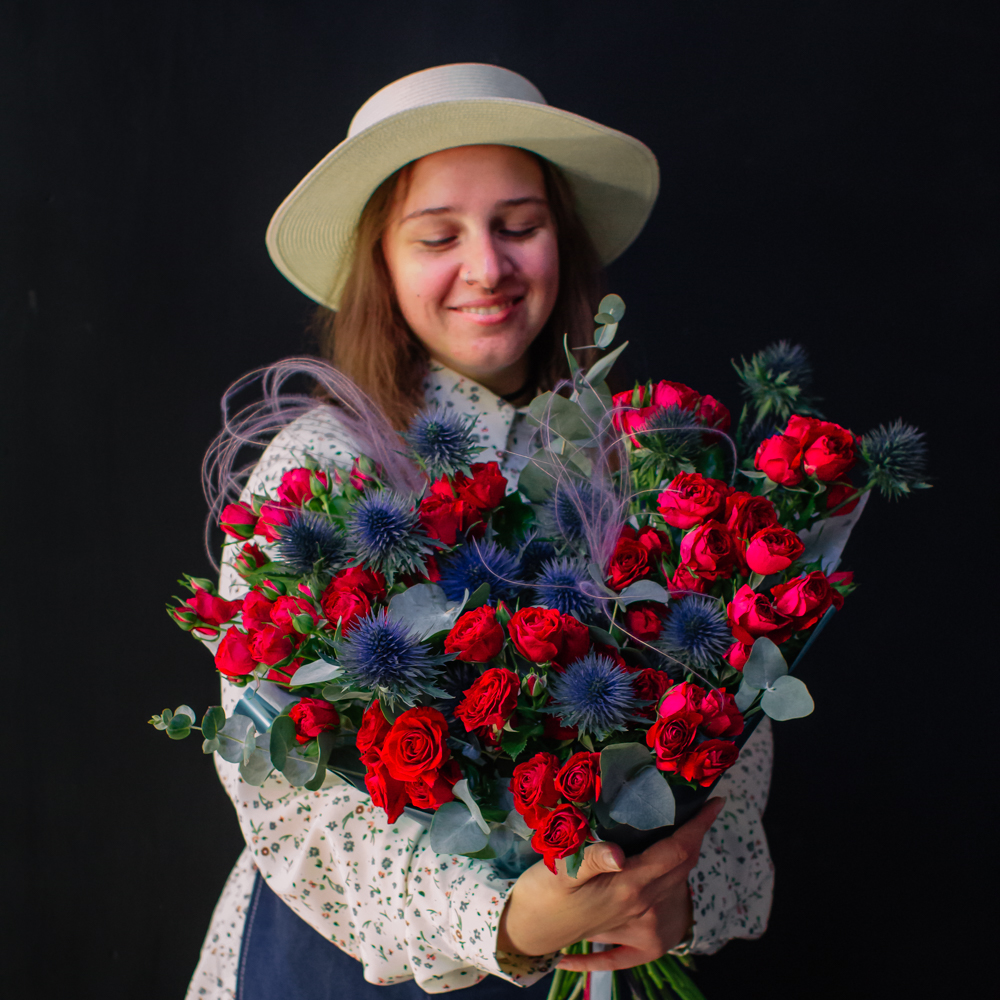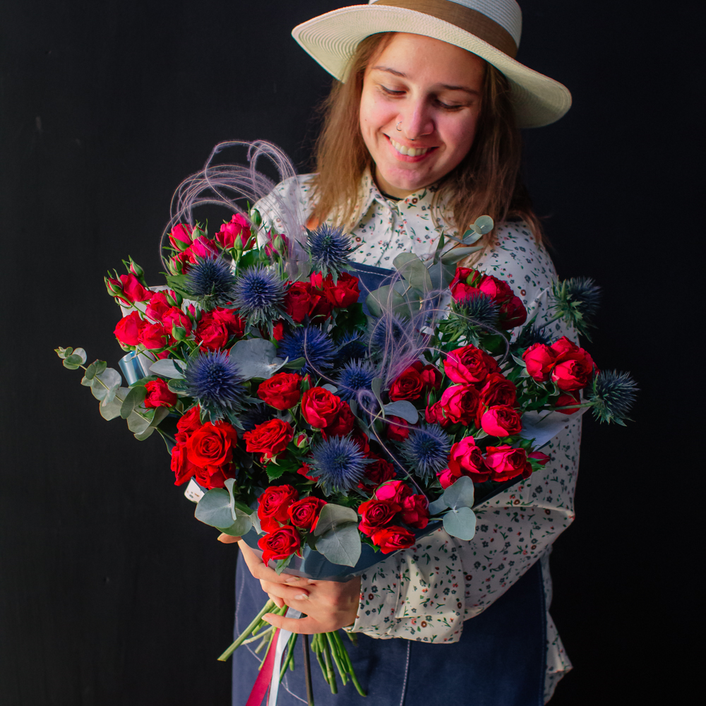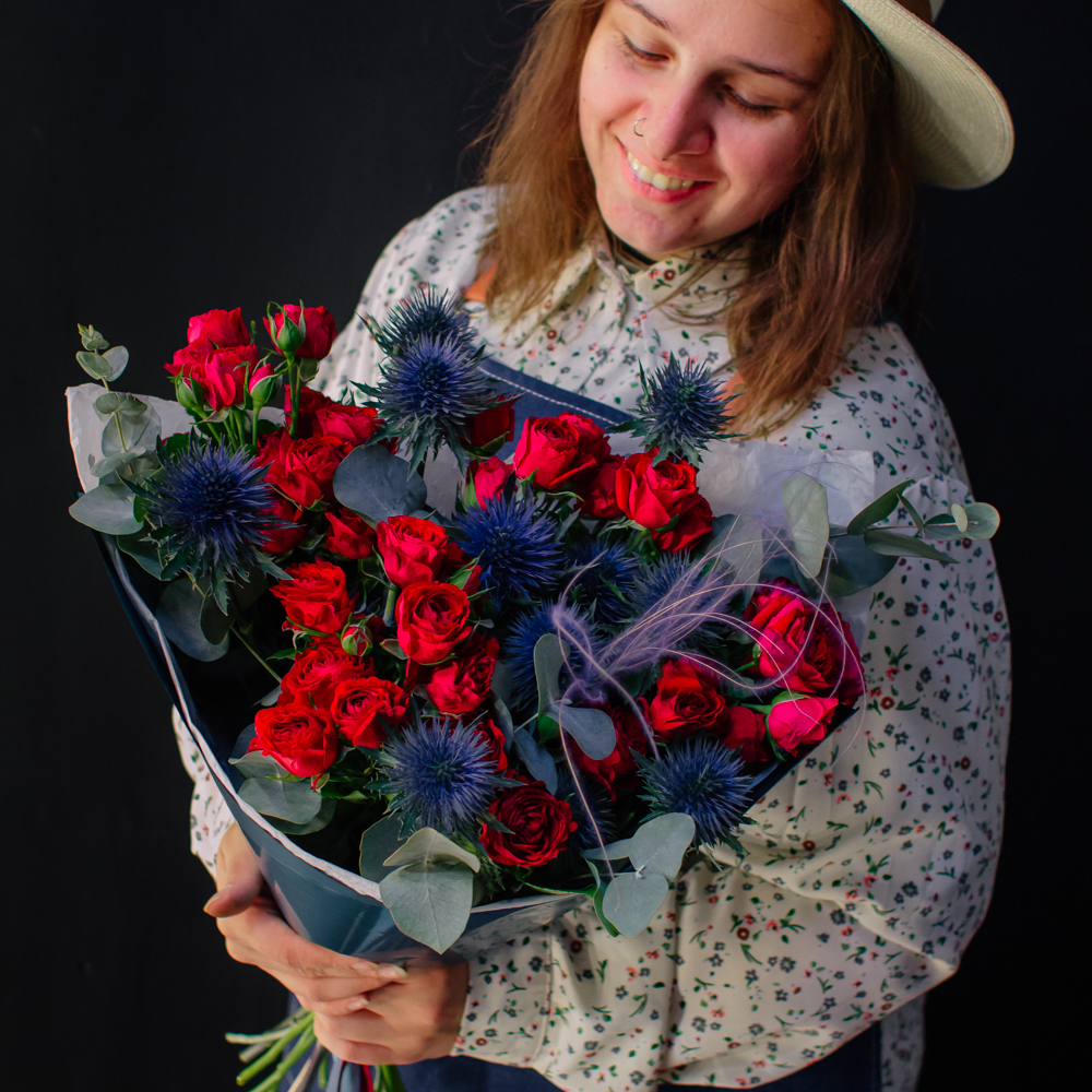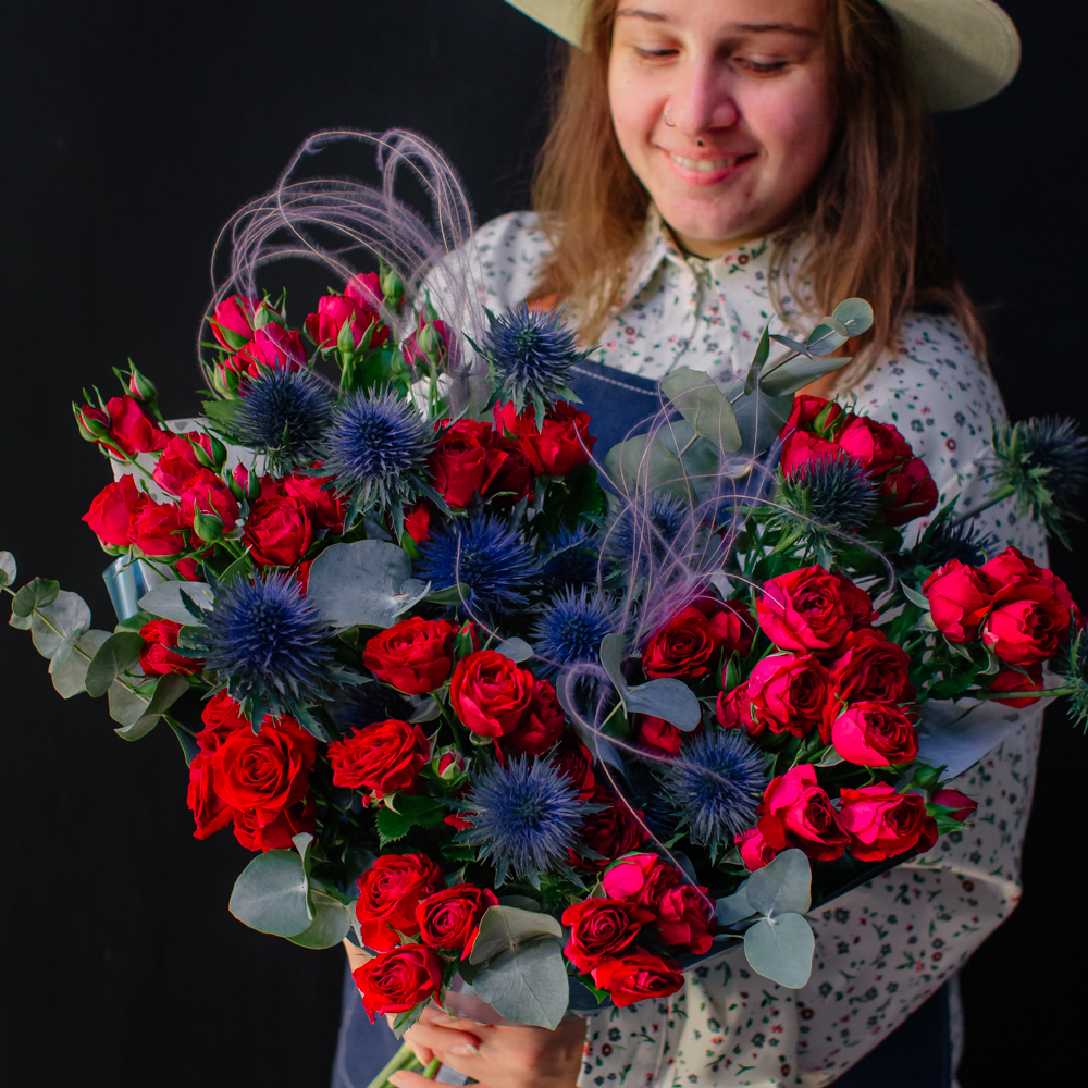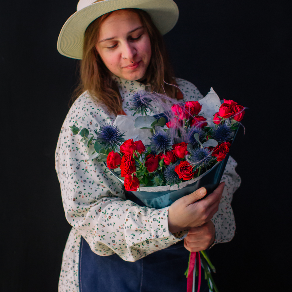 Темно-синий эрингиум и алые кустовые розы переплетаются, словно ночь встречает рассвет. Такой букет дарит ощущение праздника и волны вдохновения!