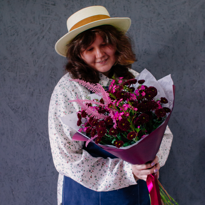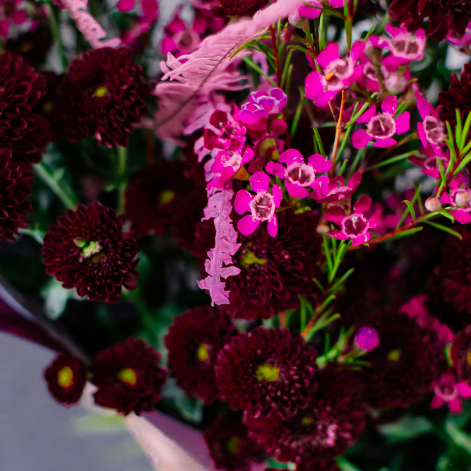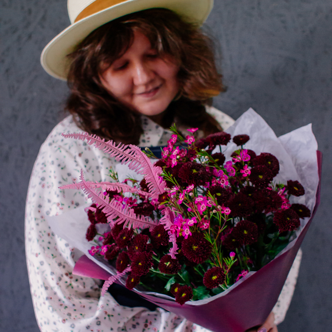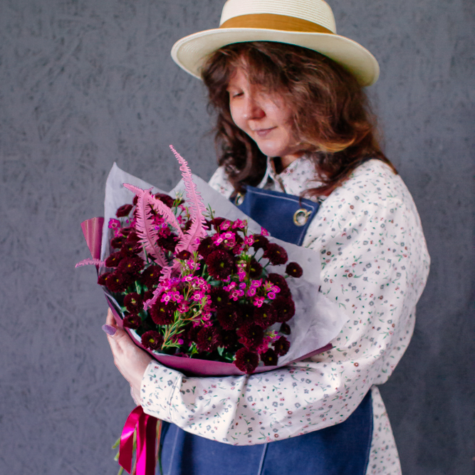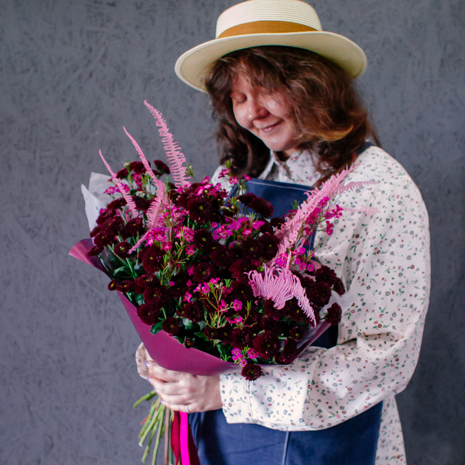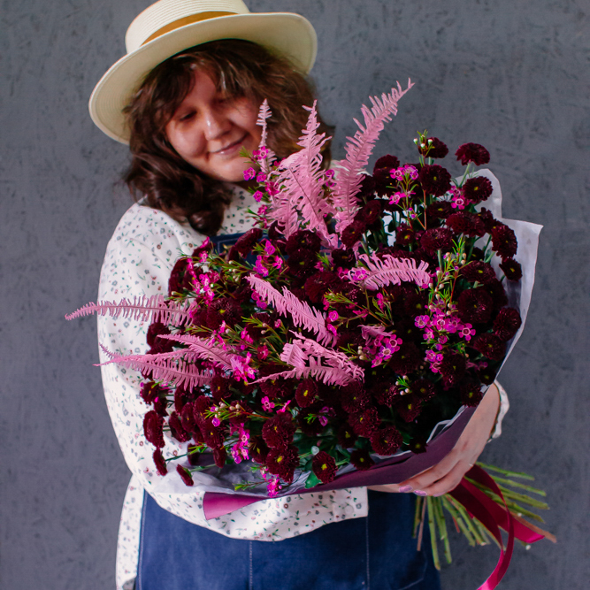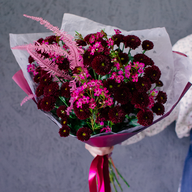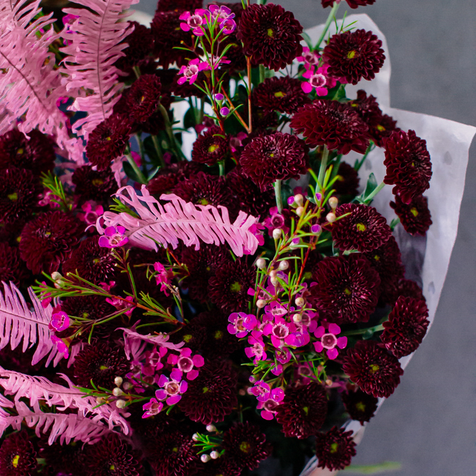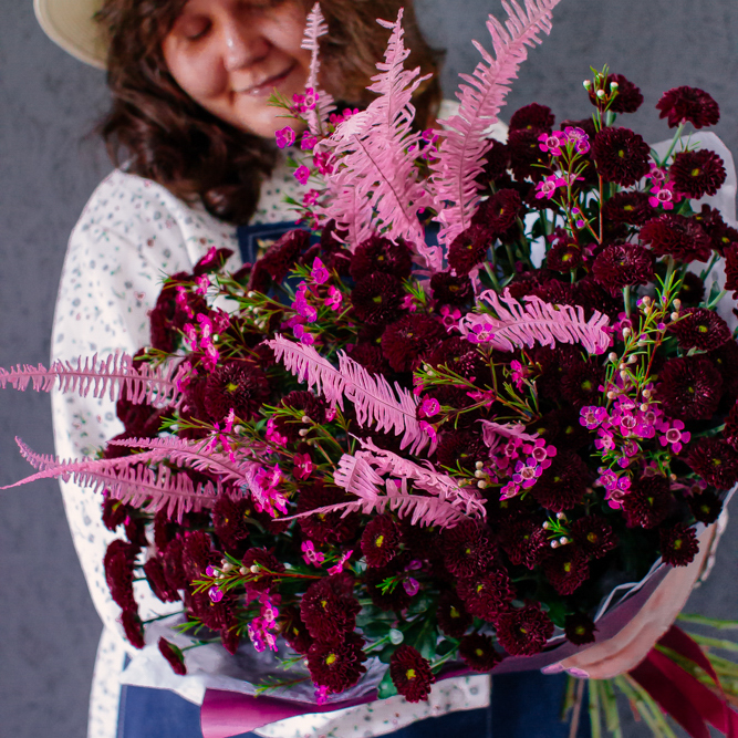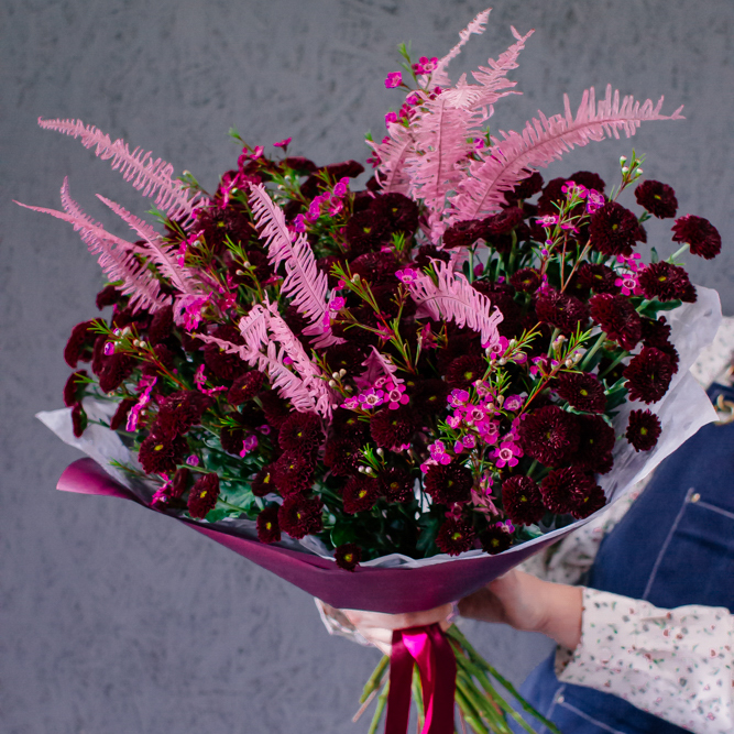 Бордовый оттенок сантини в сочетании с розоватыми акцентами создают магию монохрома — как последние лучи закатного солнца. Этот букет очаровывает и завораживает с первого взгляда.