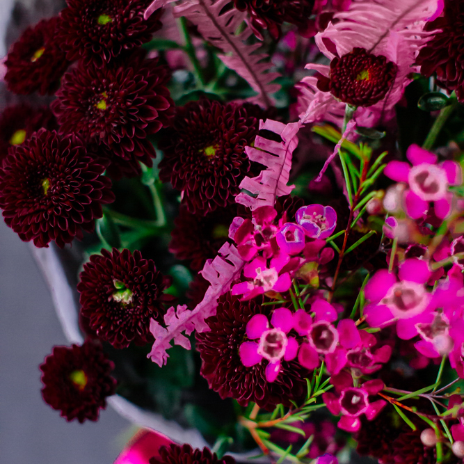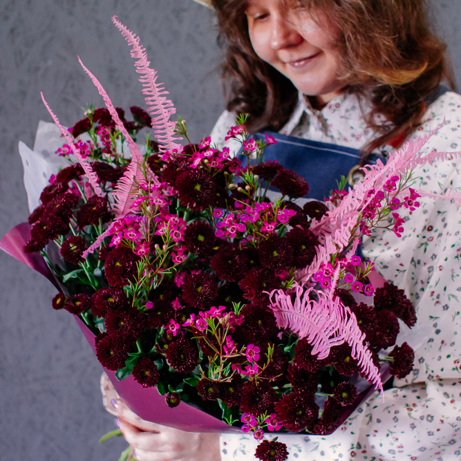 Насыщенный стойкий букет с бордовыми хризантемами сантини, малиновым хамелациумом и стабилизированным папоротником.