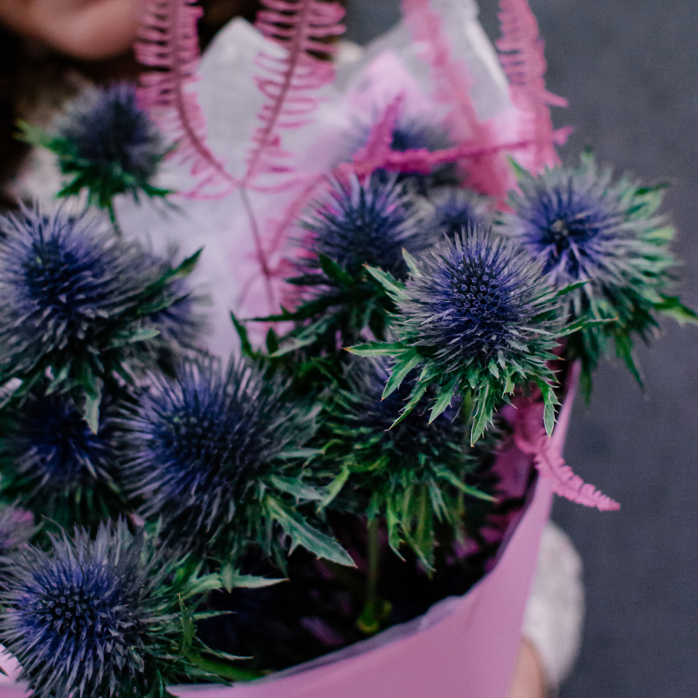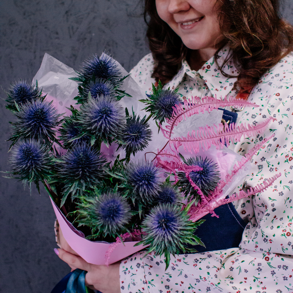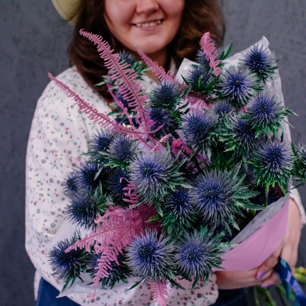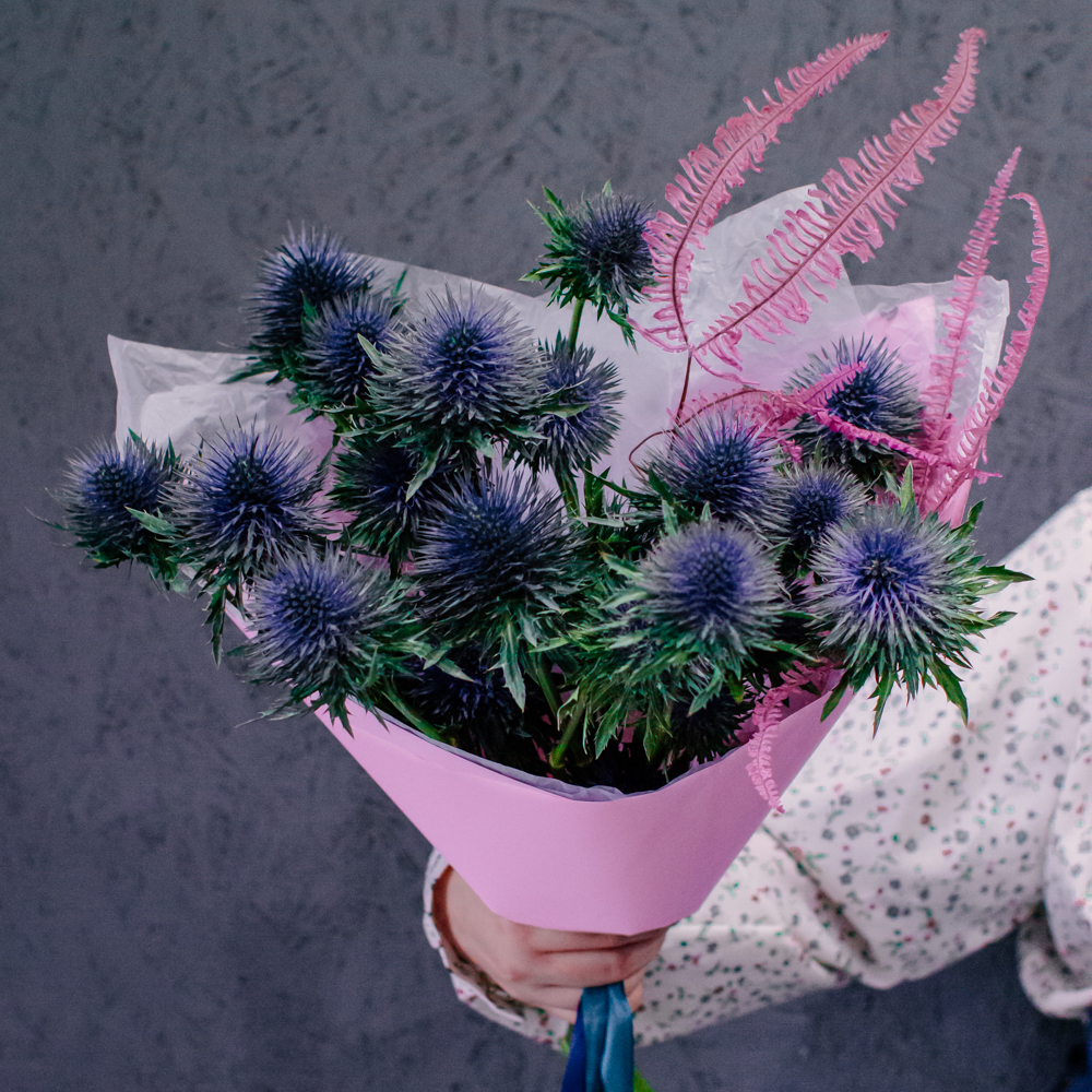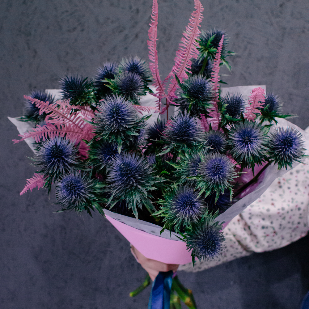 Контрастные оттенки эрингиума и нежного розового папоротника создают ощущение живой энергии. Этот букет словно говорит: «Живи ярко, люби смело, мечтай без границ!»