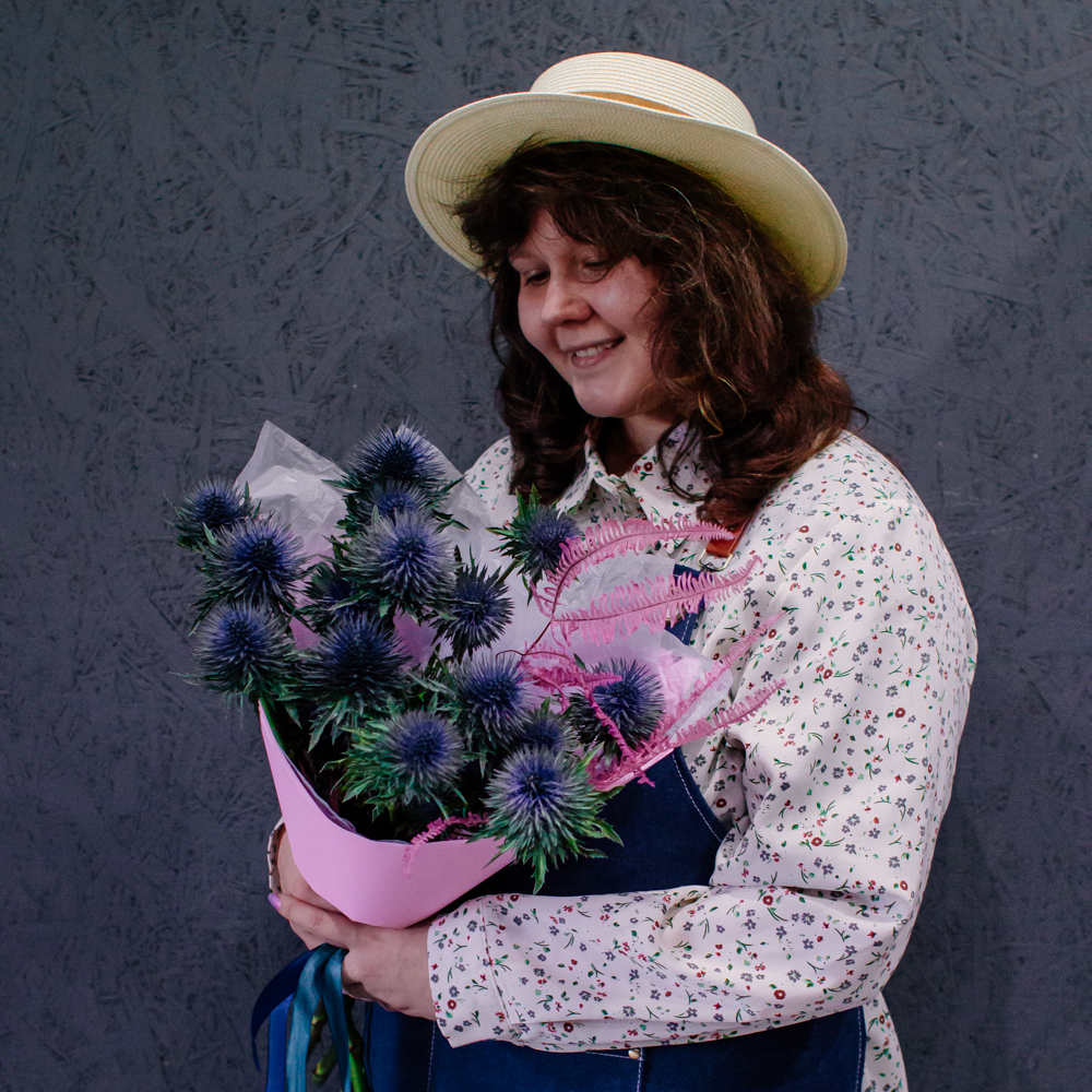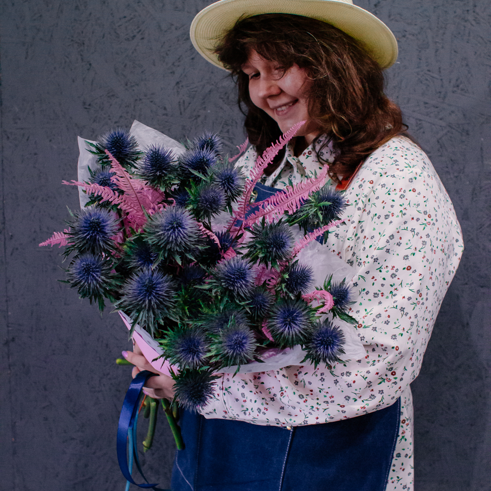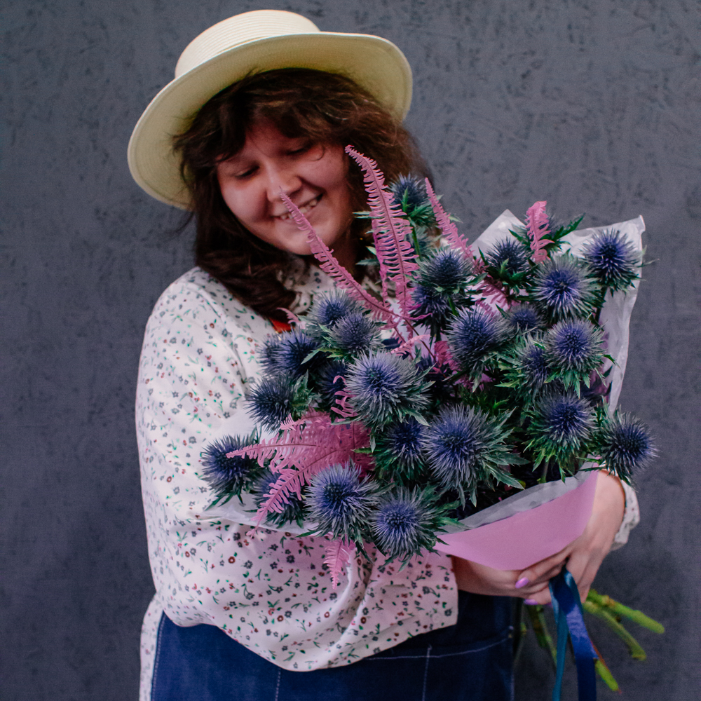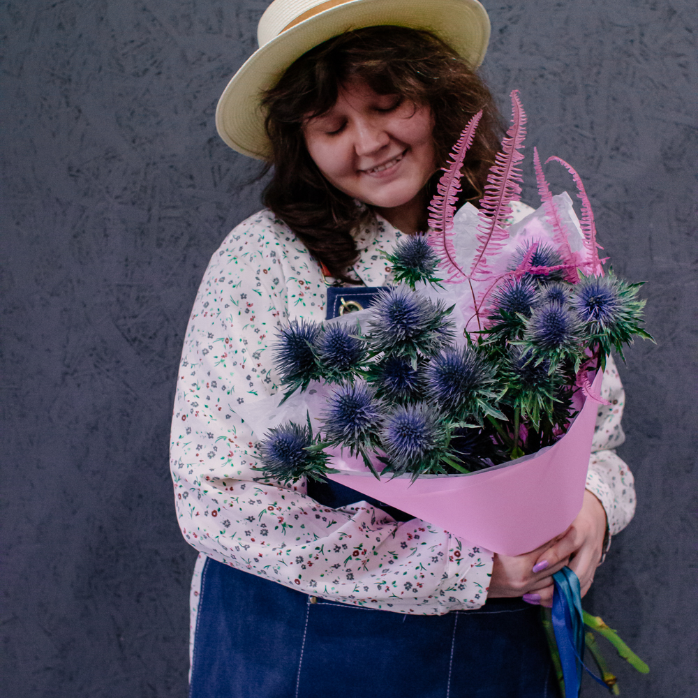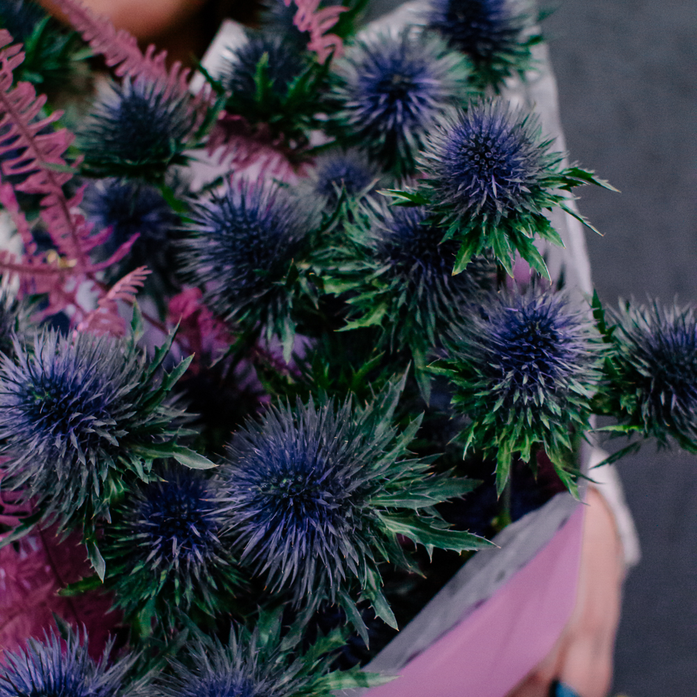 Контрастные оттенки эрингиума и нежного розового папоротника создают ощущение живой энергии. Этот букет словно говорит: «Живи ярко, люби смело, мечтай без границ!»