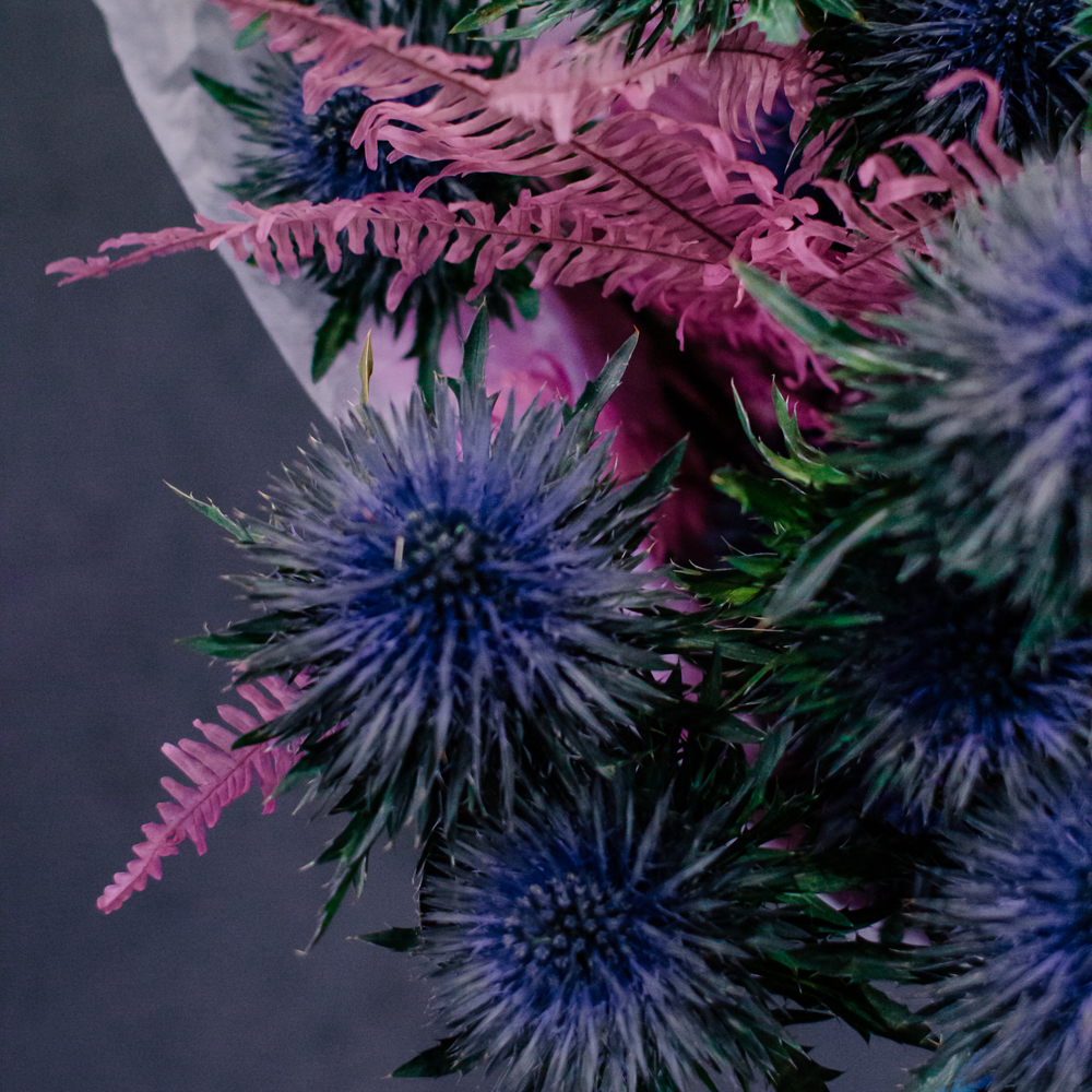 Смелый и запоминающийся букет в синевато-розовой гамме с эрингиумом и стабилизированным папоротником Амбрелла.