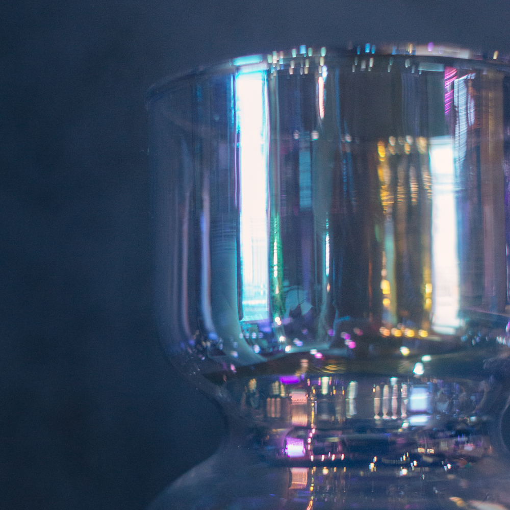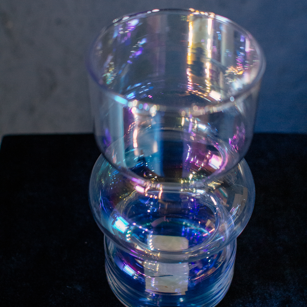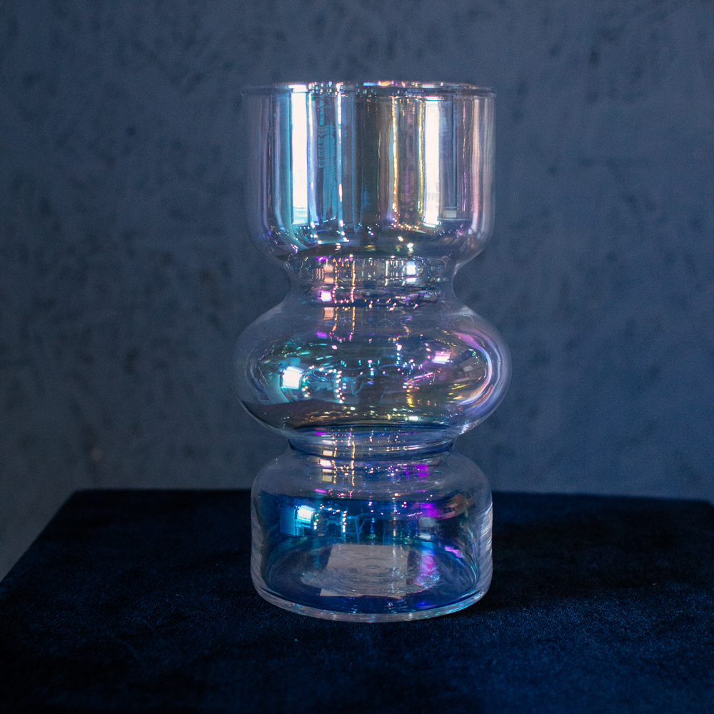 Необычный силуэт делает вазу акцентным элементом интерьера. Бензиновый блеск добавляет современности и лёгкой игры света. Подойдёт для небольших пространств или полок; размер S.