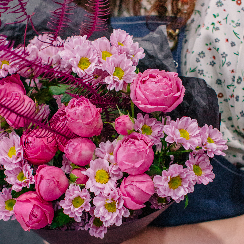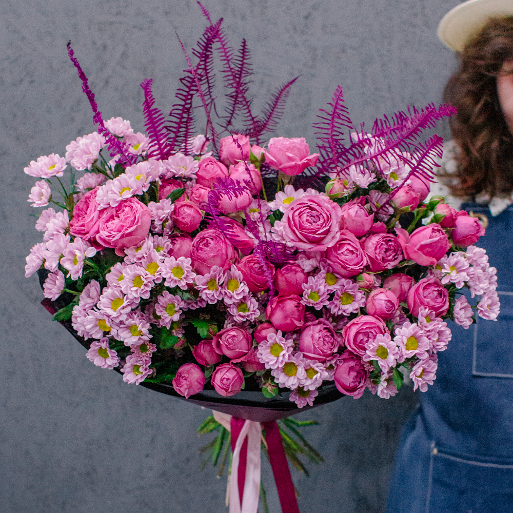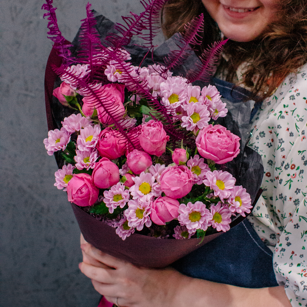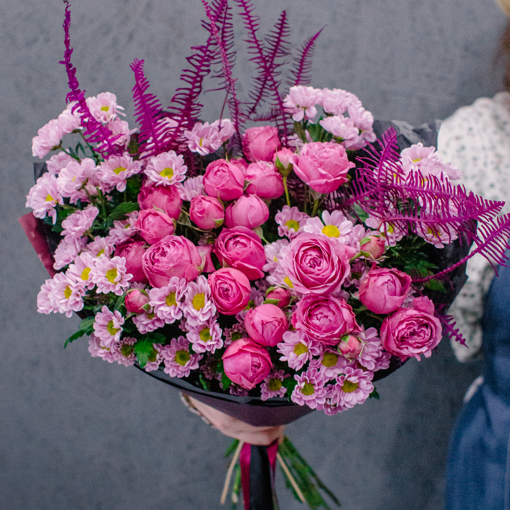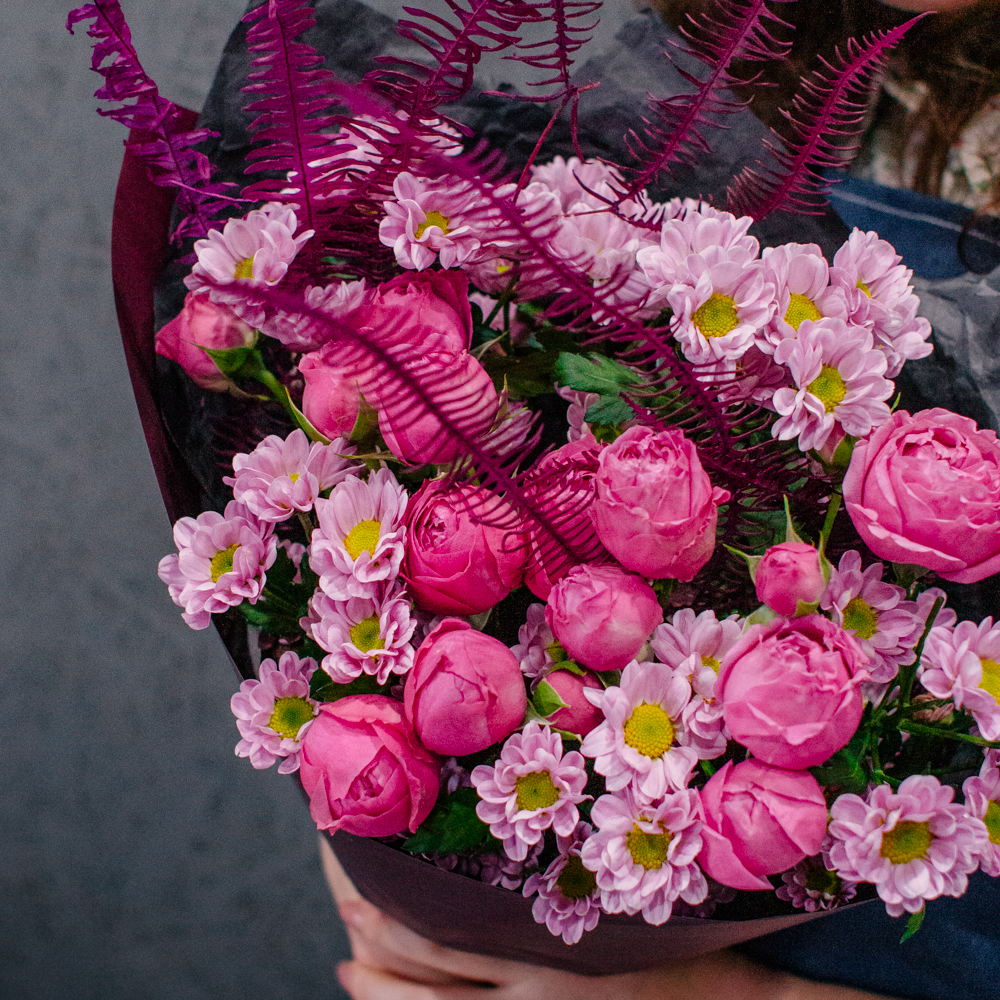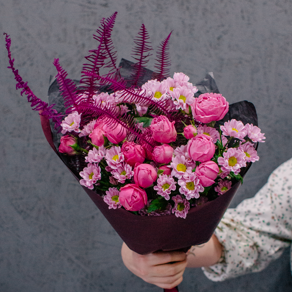 Дуо-букет с пионовидными кустовыми розами малинового оттенка, хризантемами сантини и стабилизированным папоротником.