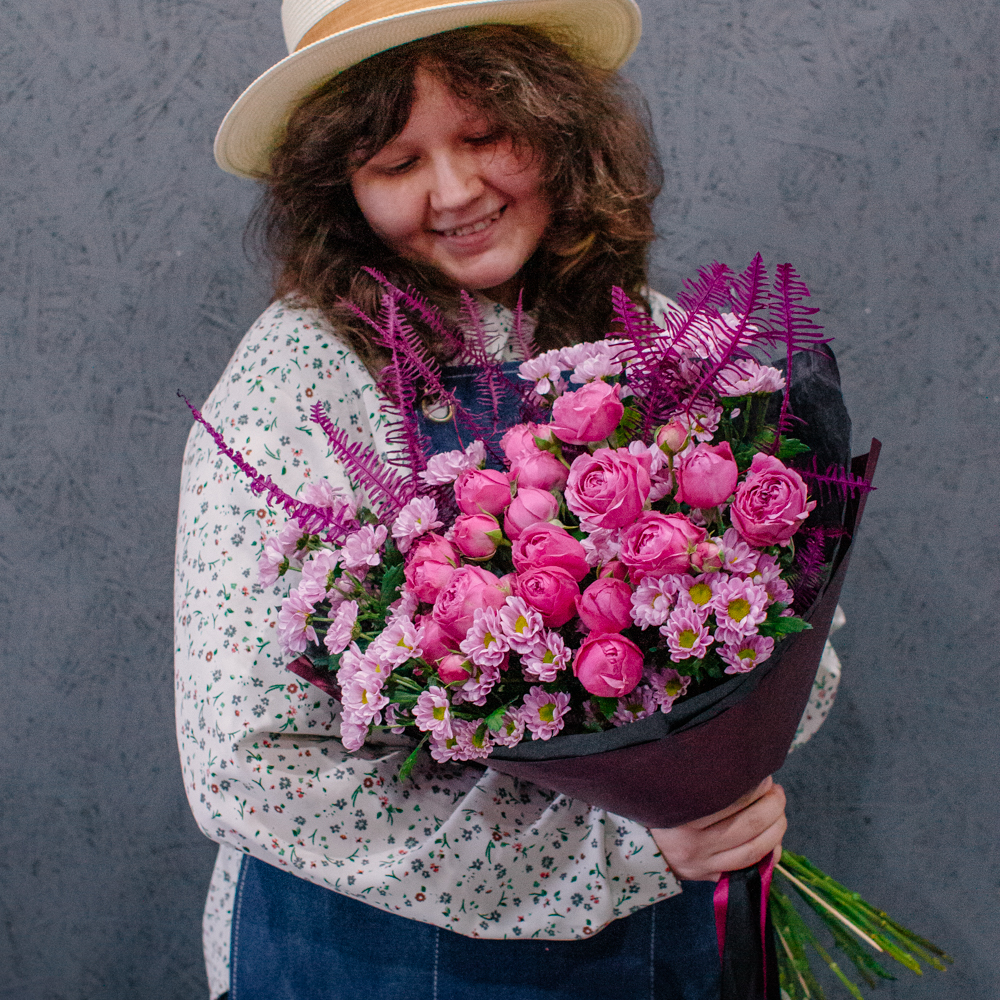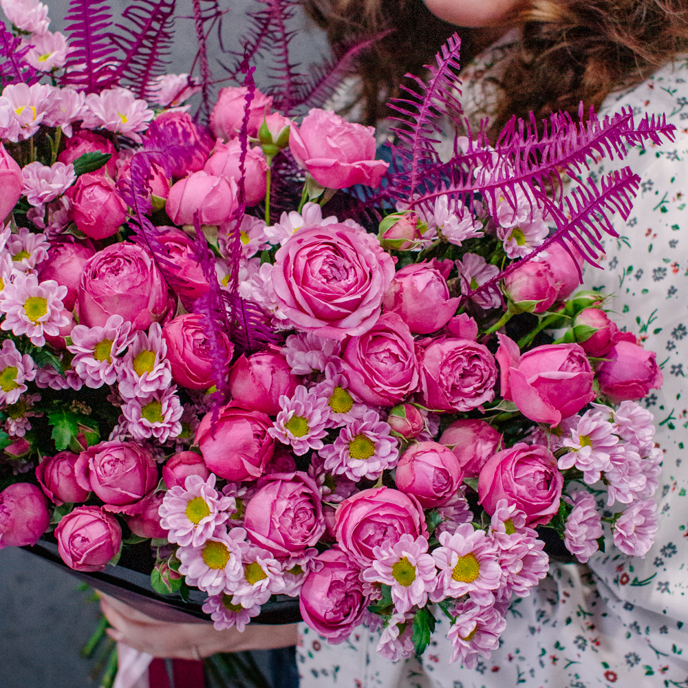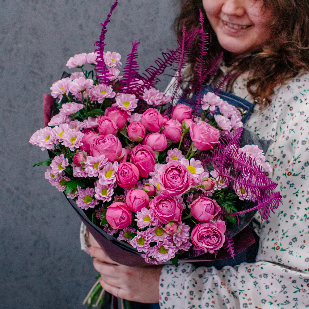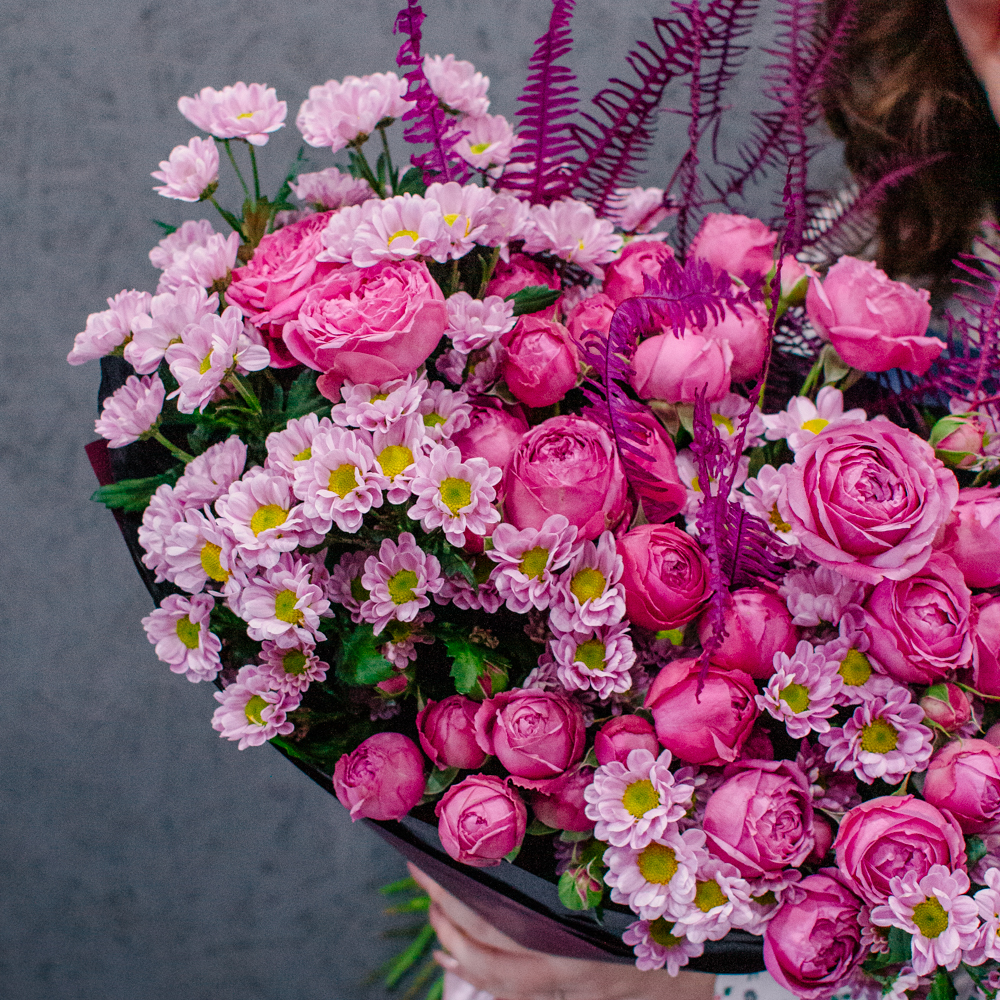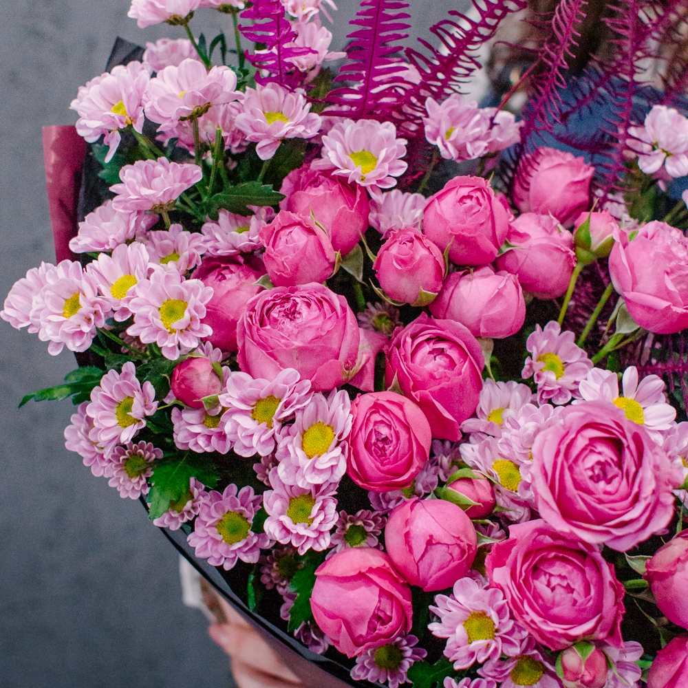 Дуо-букет с пионовидными кустовыми розами малинового оттенка, хризантемами сантини и стабилизированным папоротником.