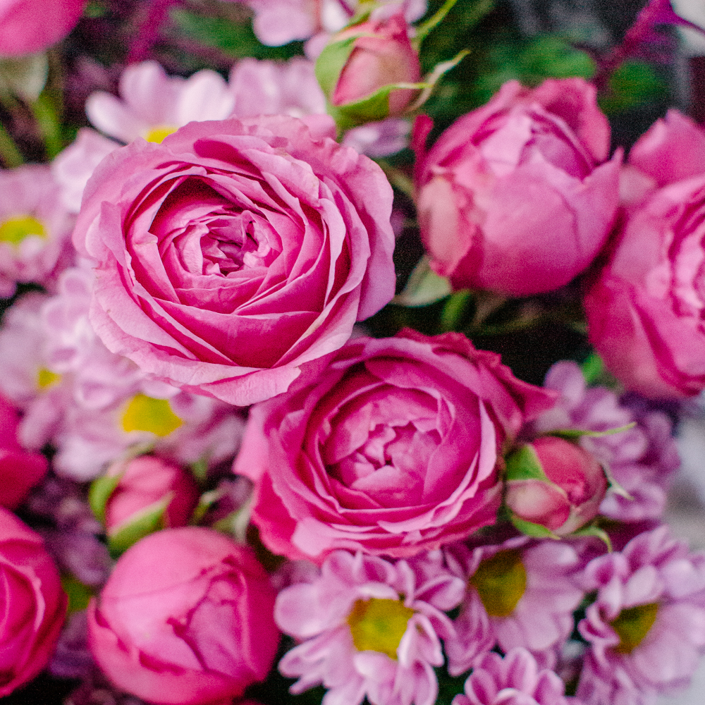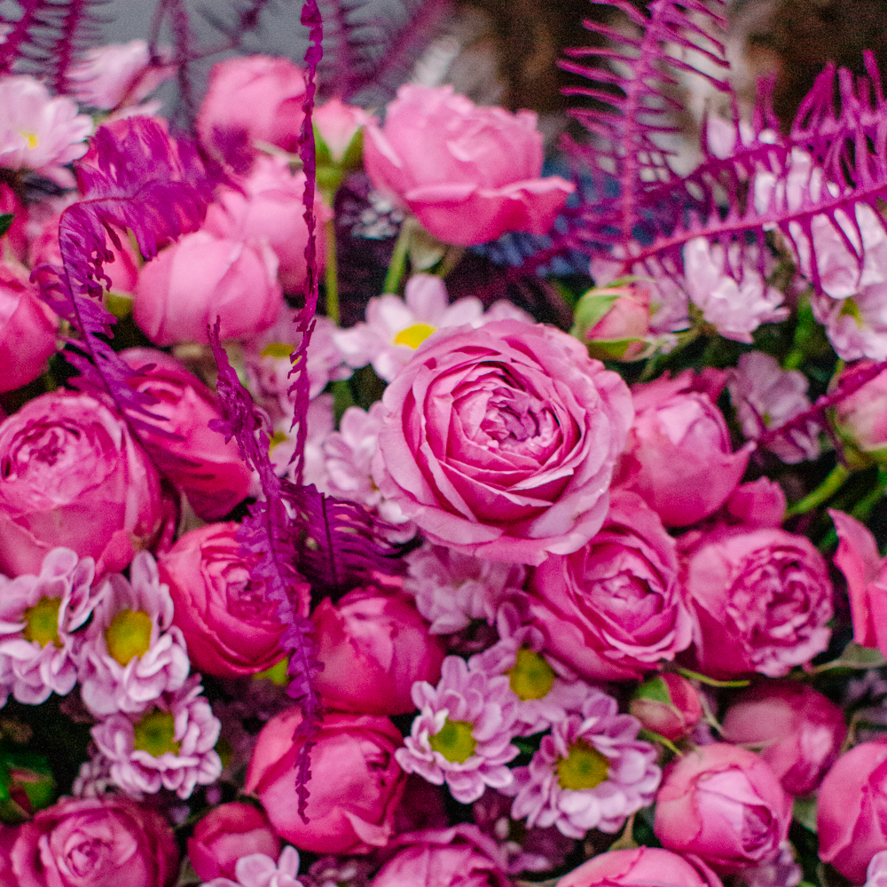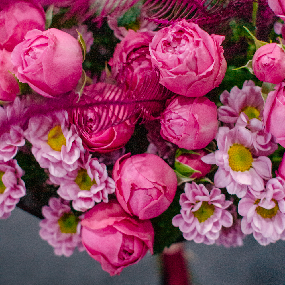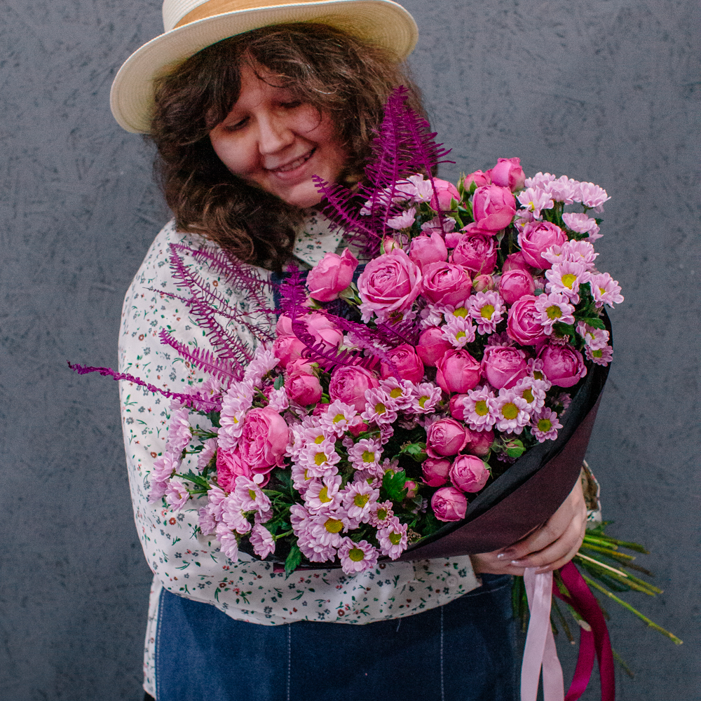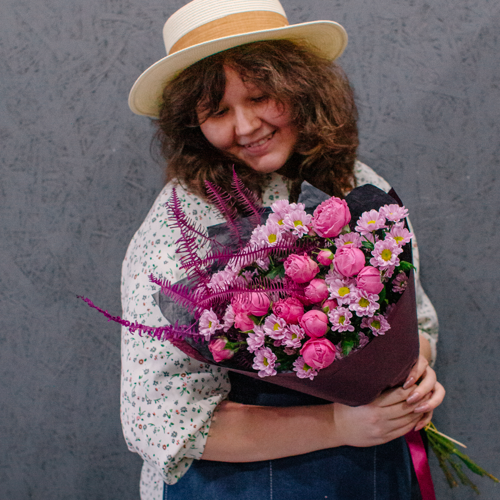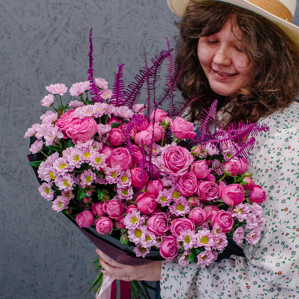 Дуо-букет с пионовидными кустовыми розами малинового оттенка, хризантемами сантини и стабилизированным папоротником.
