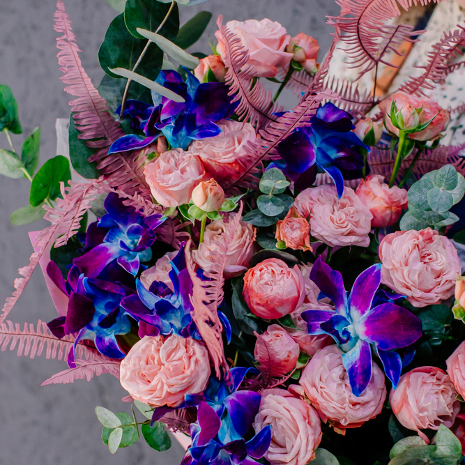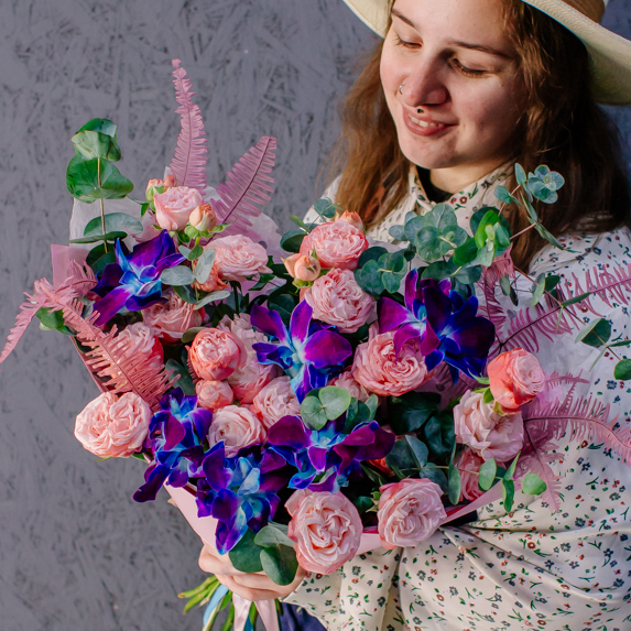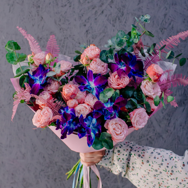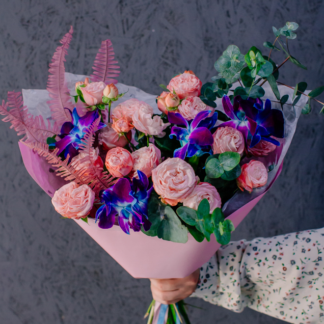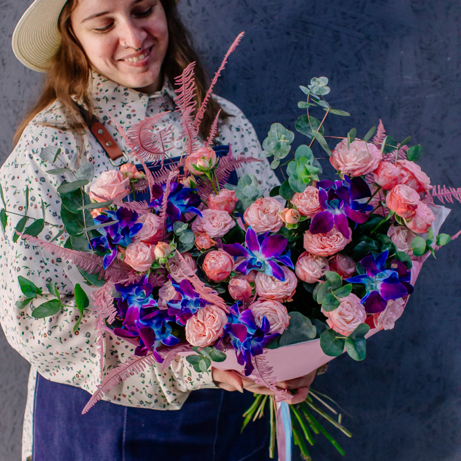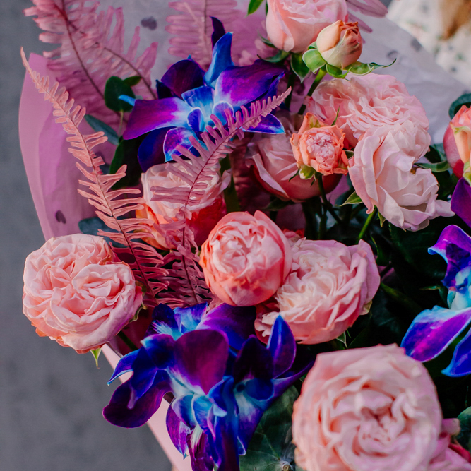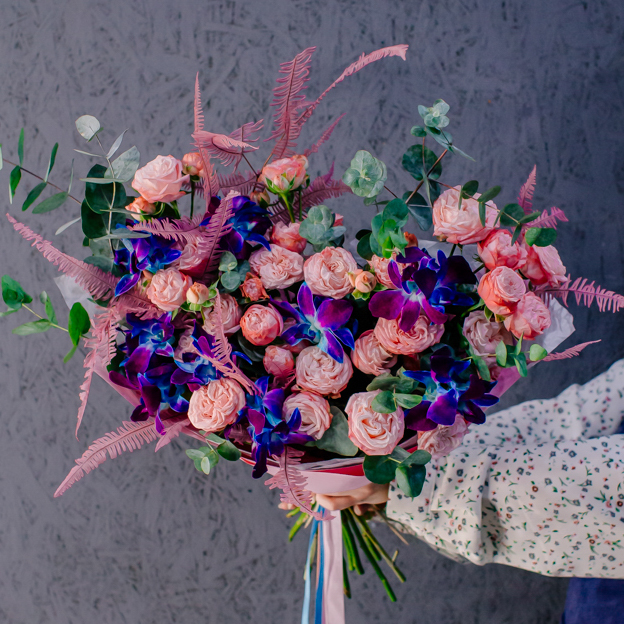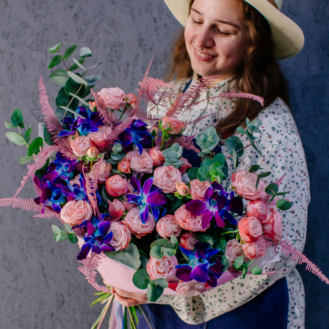 Мягкие оттенки роз и сияние синих орхидей создают чарующую гармонию. Такой букет словно благодарность для близкого человека: «Спасибо за заботу, нежность и свет, который ты даришь каждый день».