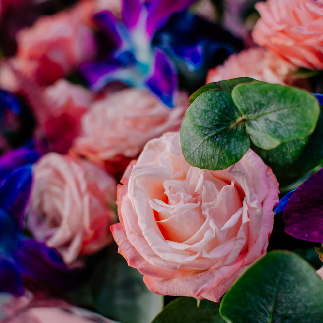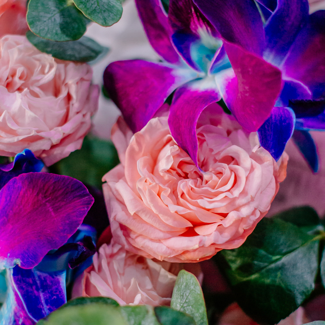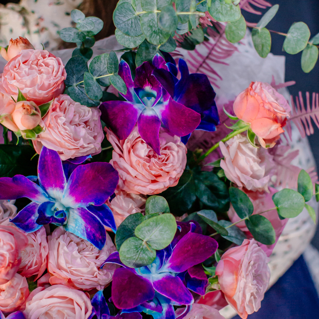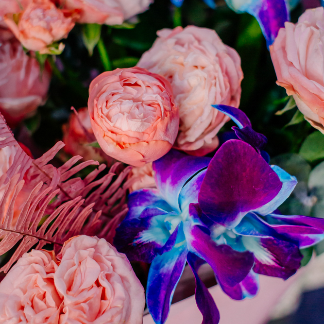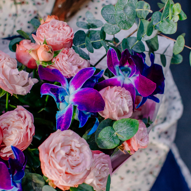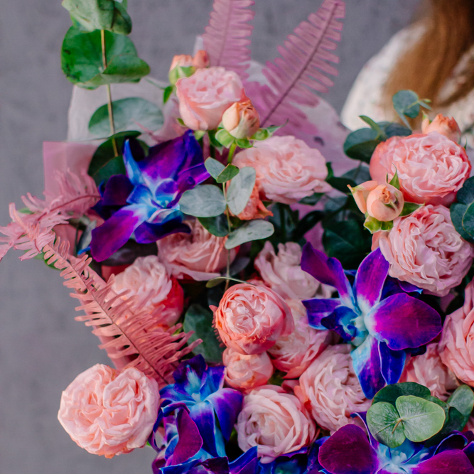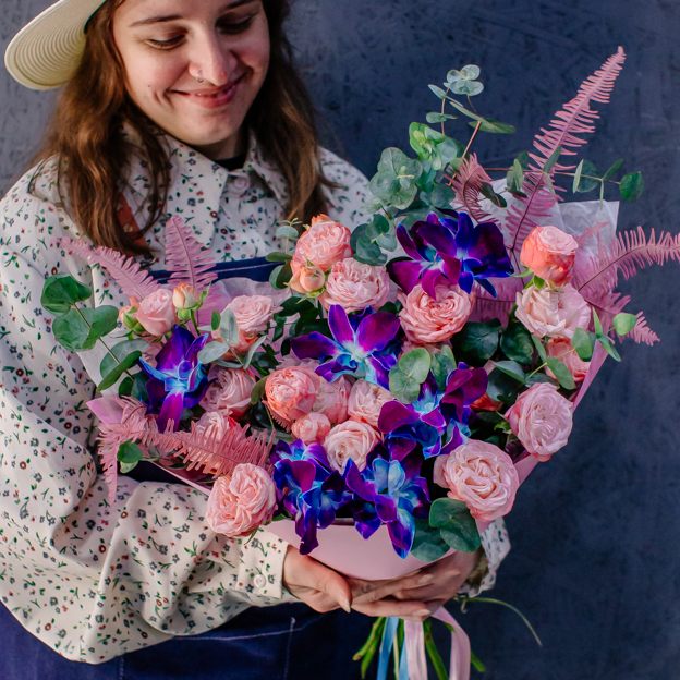 Мягкие оттенки роз и сияние синих орхидей создают чарующую гармонию. Такой букет словно благодарность для близкого человека: «Спасибо за заботу, нежность и свет, который ты даришь каждый день».
