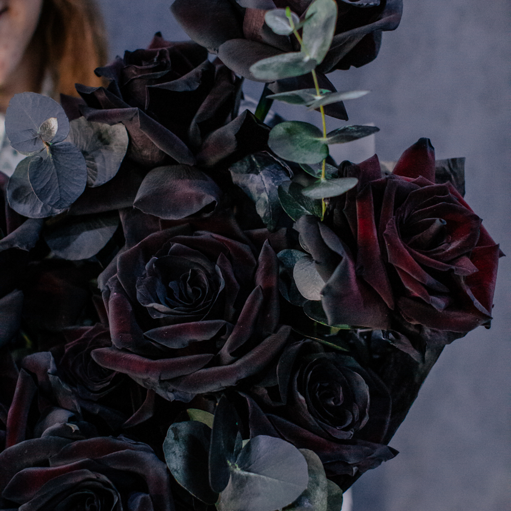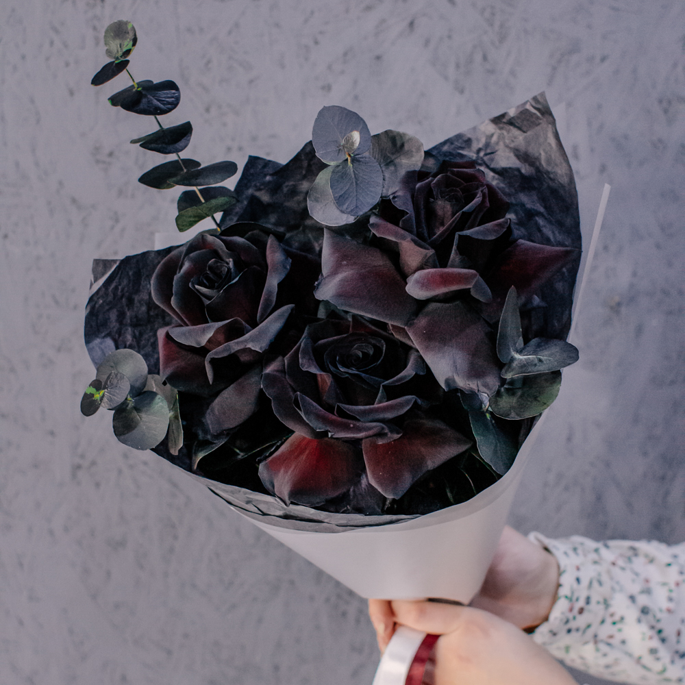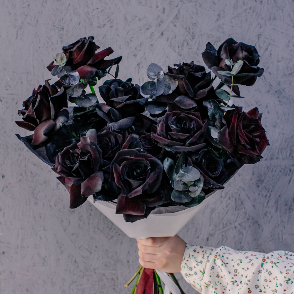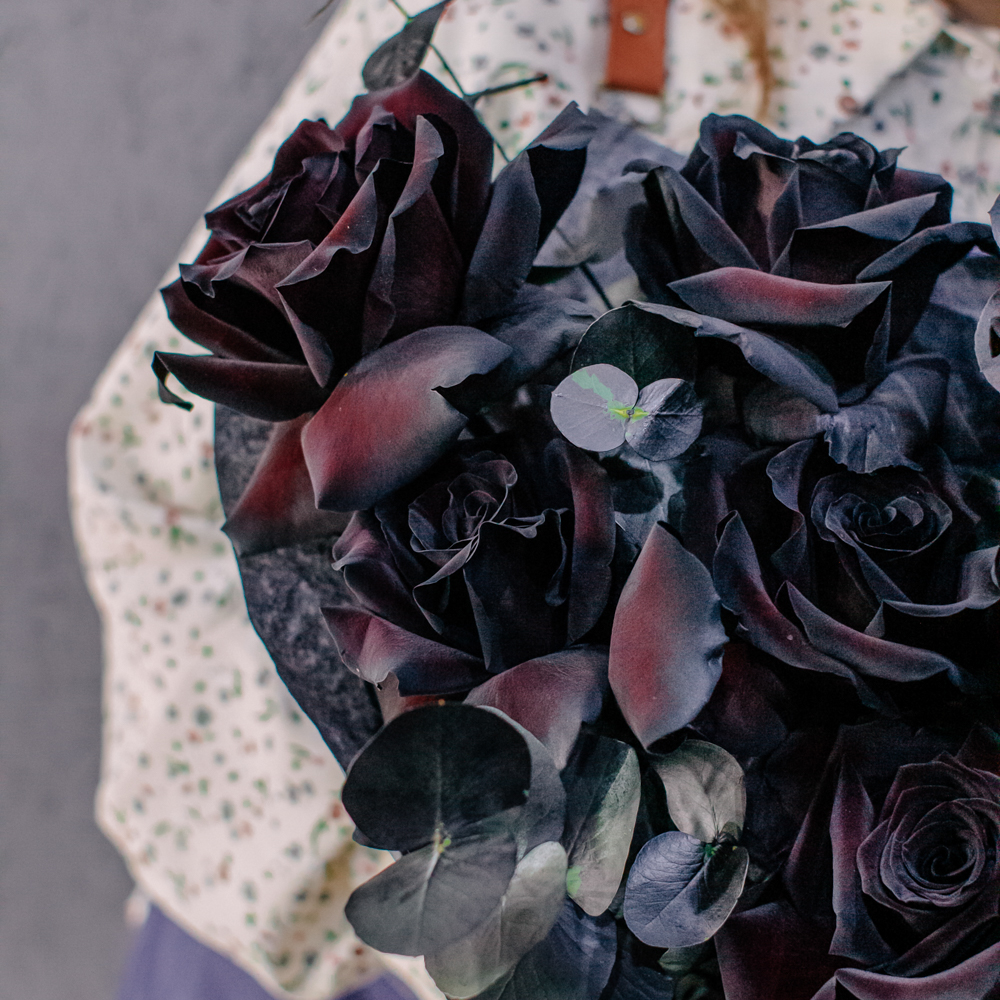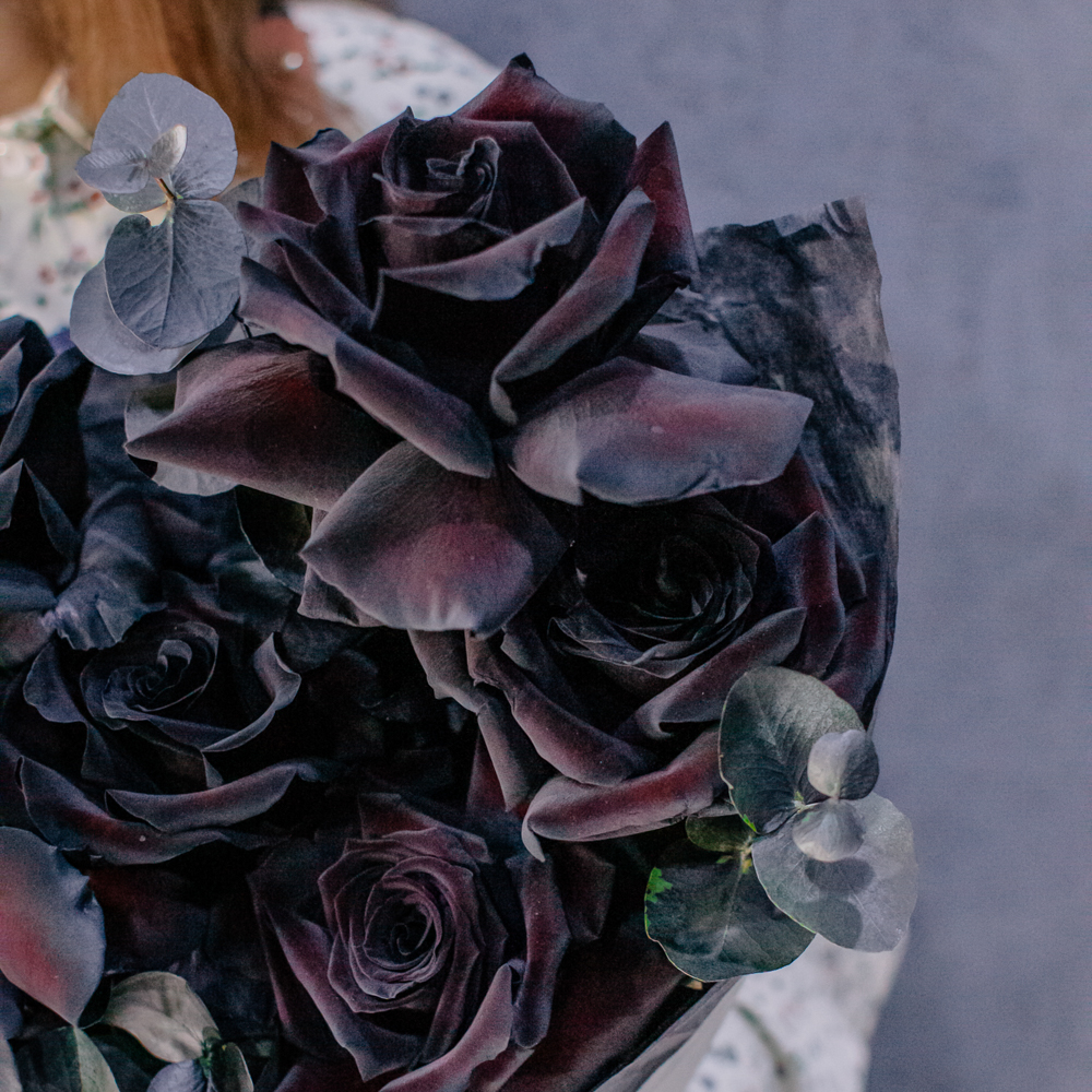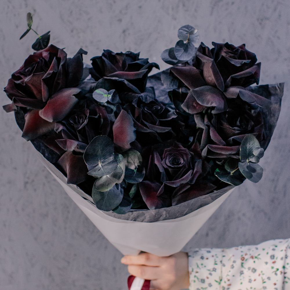 Черные розы и насыщенно-тёмный эвкалипт создают эффектный, выразительный дуэт с драматичным характером. Глубокий цвет роз — результат профессиональной покраски поставщиков, а тёмный эвкалипт также окрашен аккуратно и безопасно, что обеспечивает впечатляющую глубину композиции.