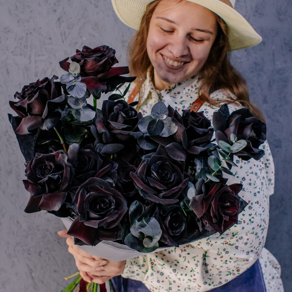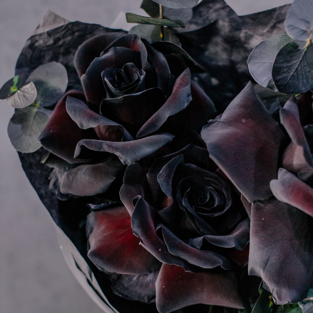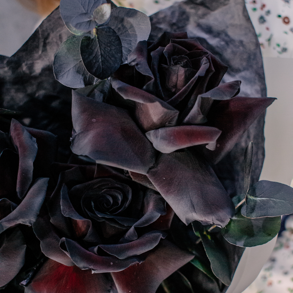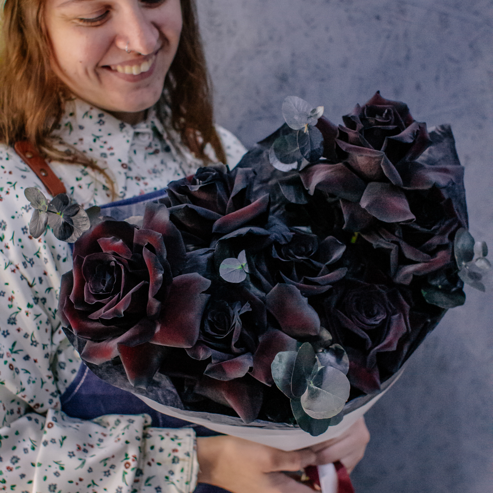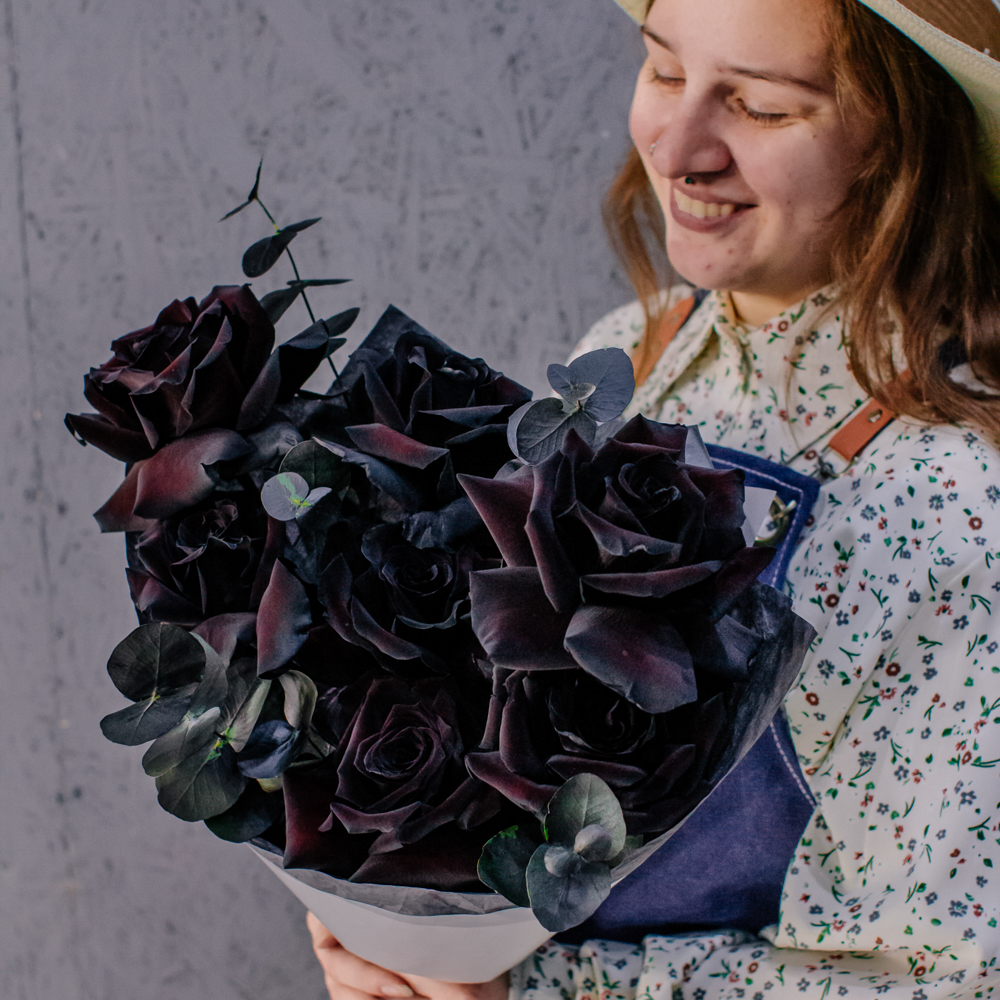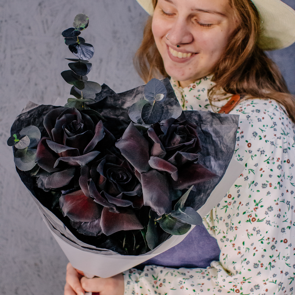 Черные розы и насыщенно-тёмный эвкалипт создают эффектный, выразительный дуэт с драматичным характером. Глубокий цвет роз — результат профессиональной покраски поставщиков, а тёмный эвкалипт также окрашен аккуратно и безопасно, что обеспечивает впечатляющую глубину композиции.