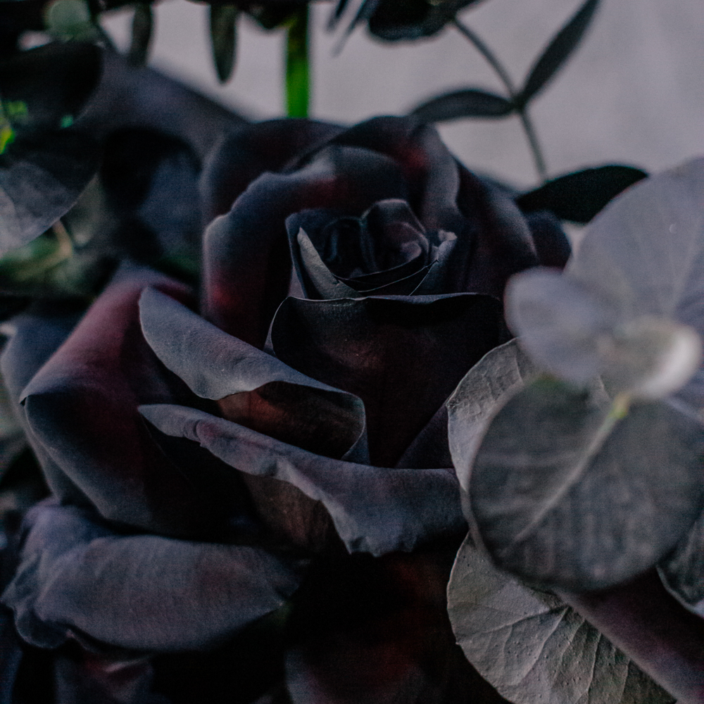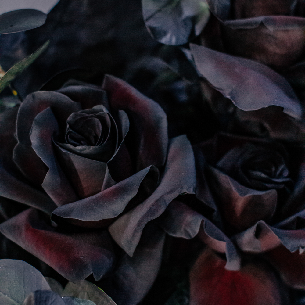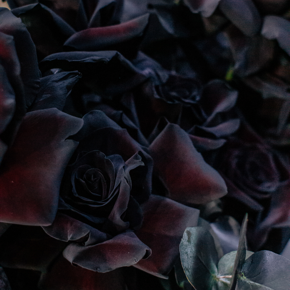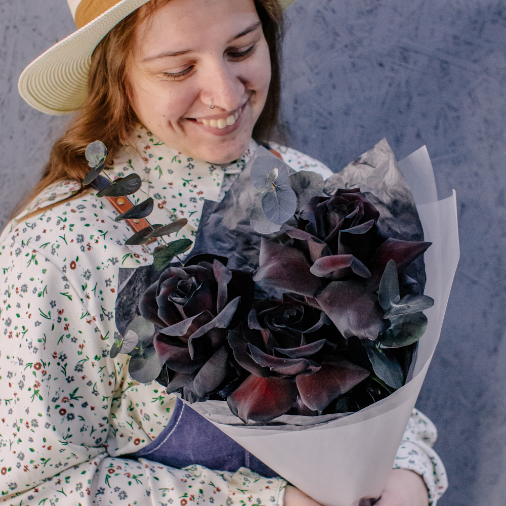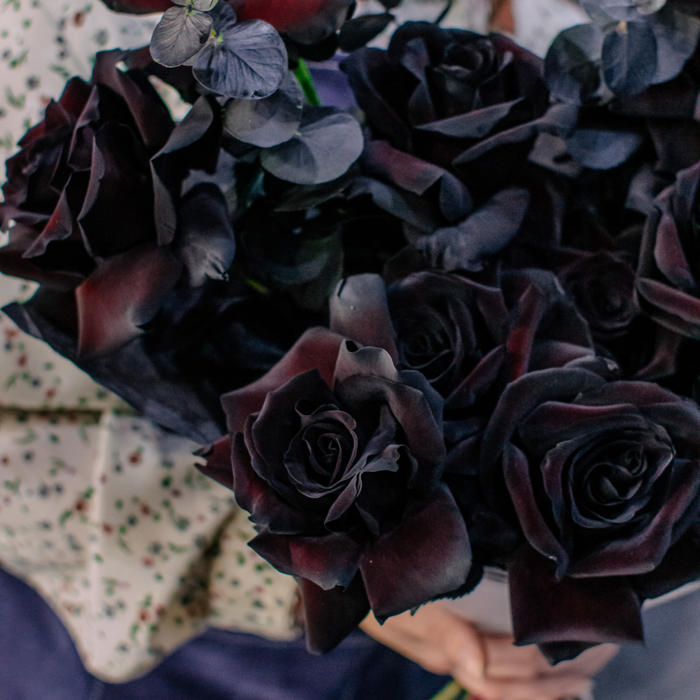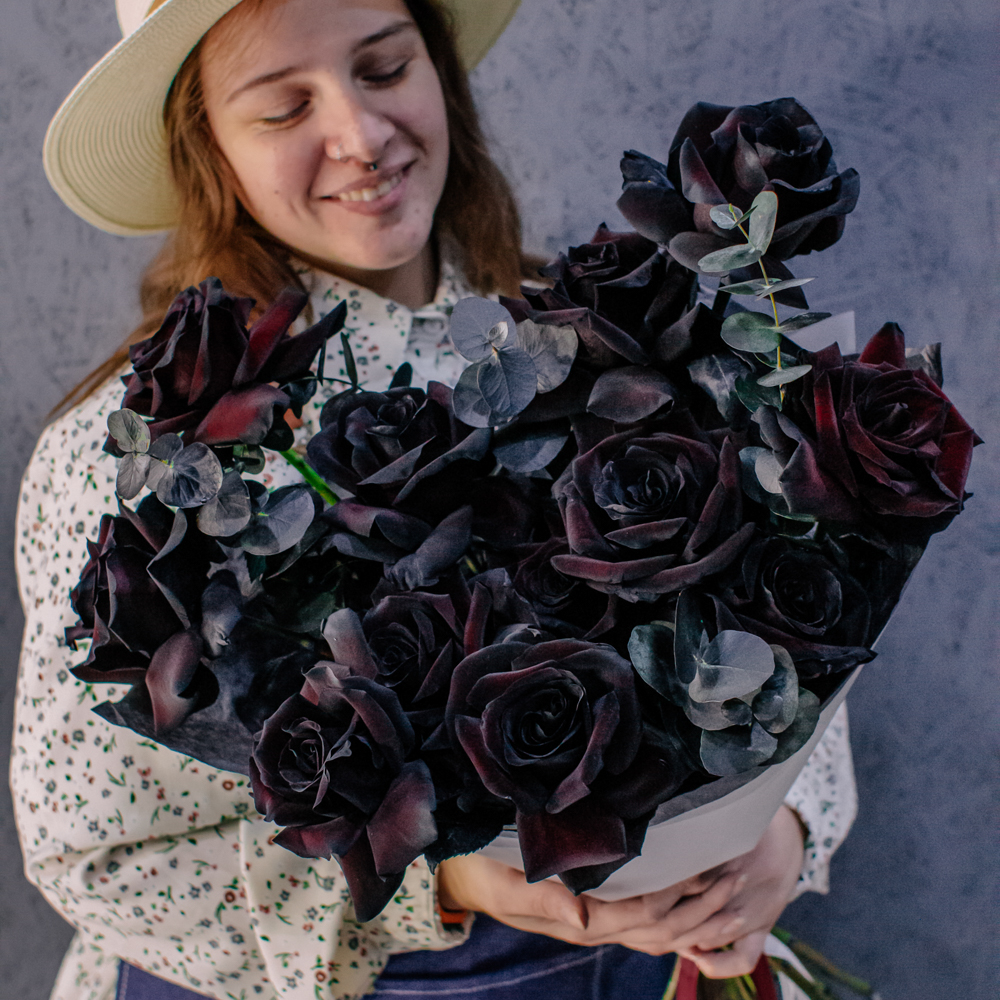 Черные розы и насыщенно-тёмный эвкалипт создают эффектный, выразительный дуэт с драматичным характером. Глубокий цвет роз — результат профессиональной покраски поставщиков, а тёмный эвкалипт также окрашен аккуратно и безопасно, что обеспечивает впечатляющую глубину композиции.