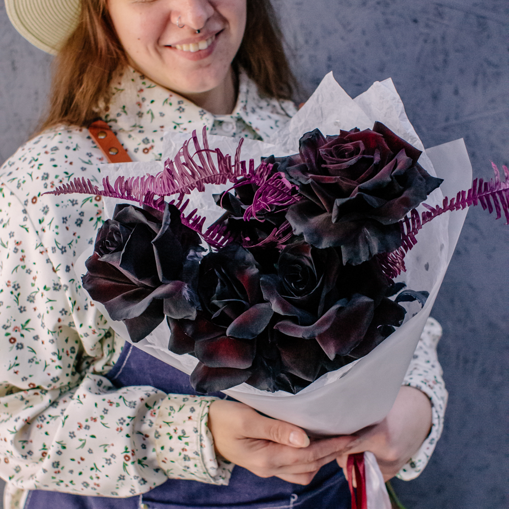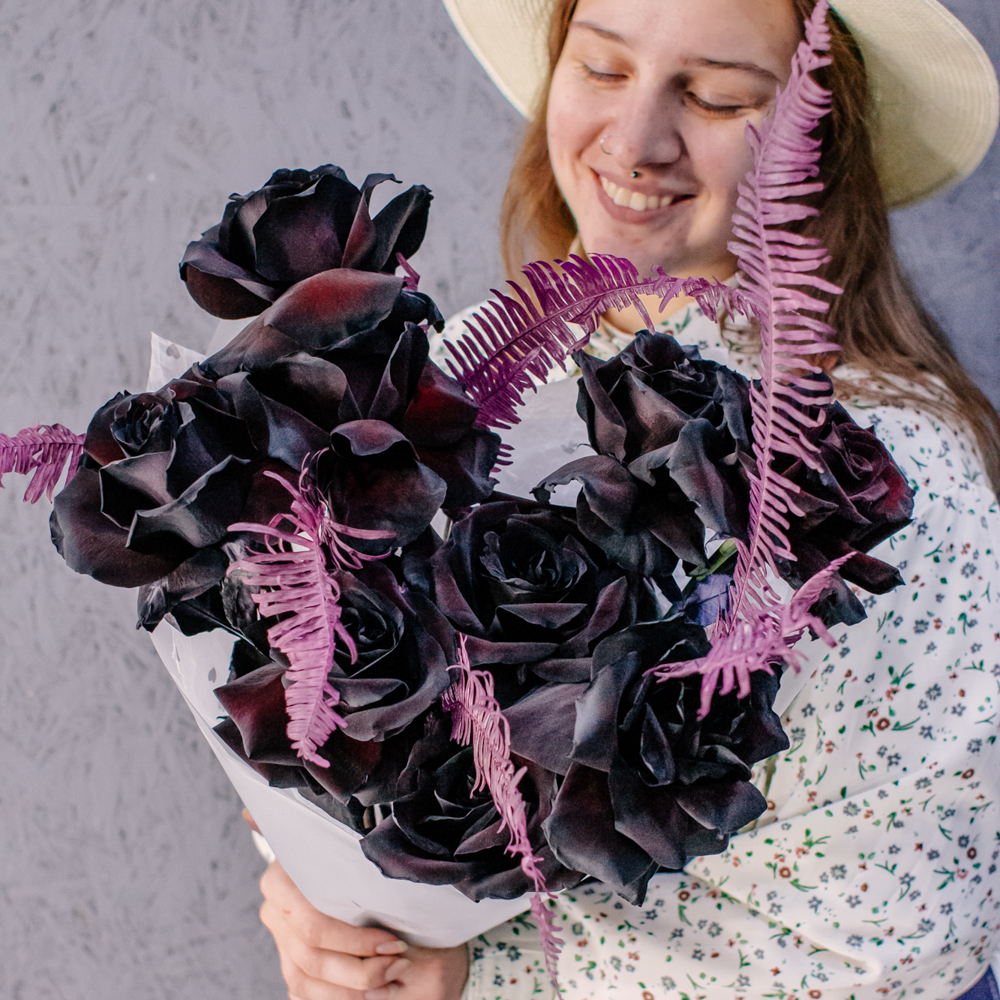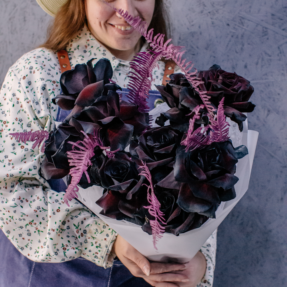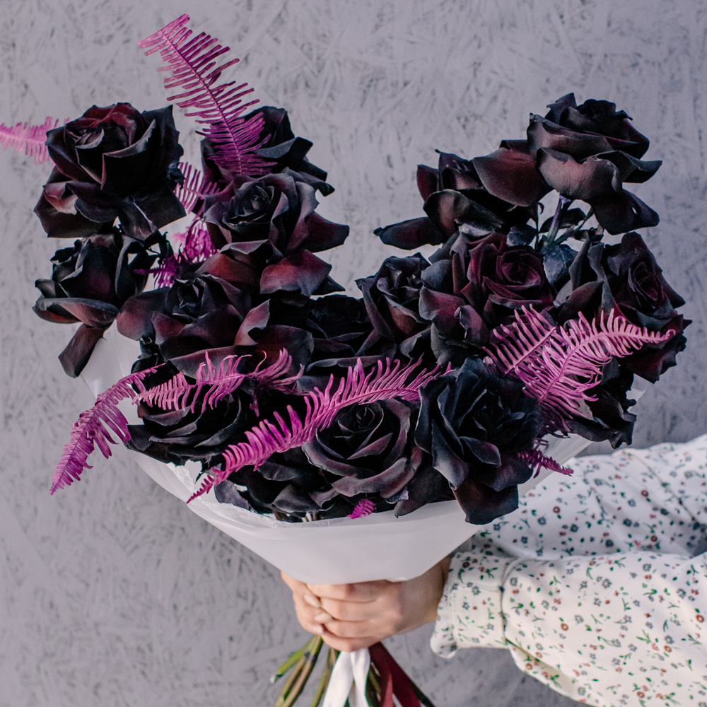 Чёрный оттенок этих роз достигается на этапе поставки — бордовые розы проходят профессиональное окрашивание у производителя. Это стандартная и безопасная технология, благодаря которой цветы приобретают глубокий, бархатный тон.