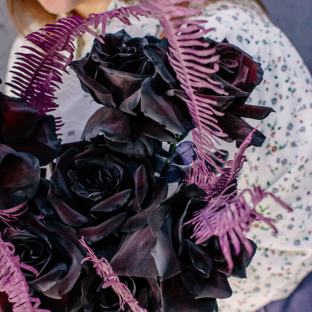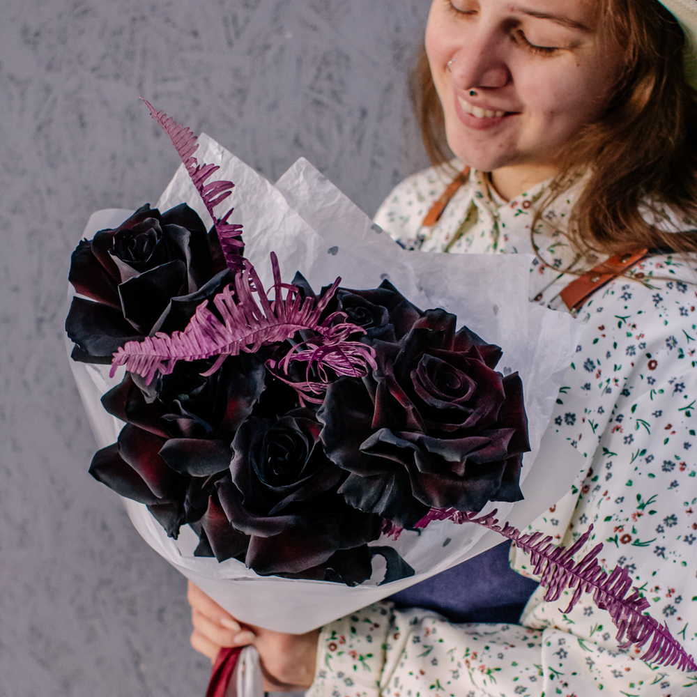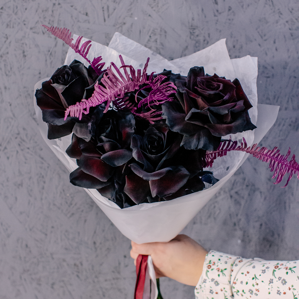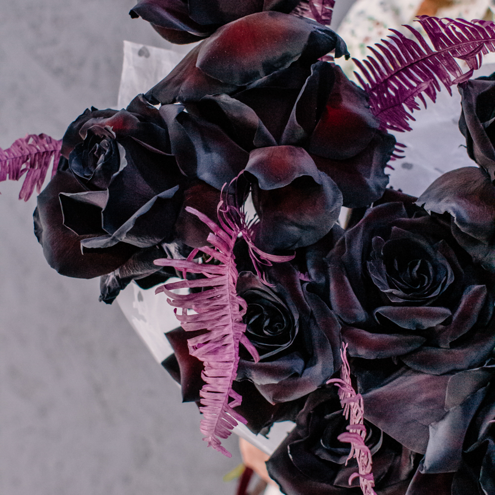 Чёрный оттенок этих роз достигается на этапе поставки — бордовые розы проходят профессиональное окрашивание у производителя. Это стандартная и безопасная технология, благодаря которой цветы приобретают глубокий, бархатный тон.