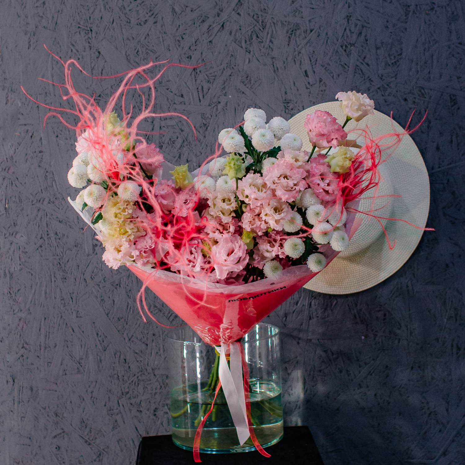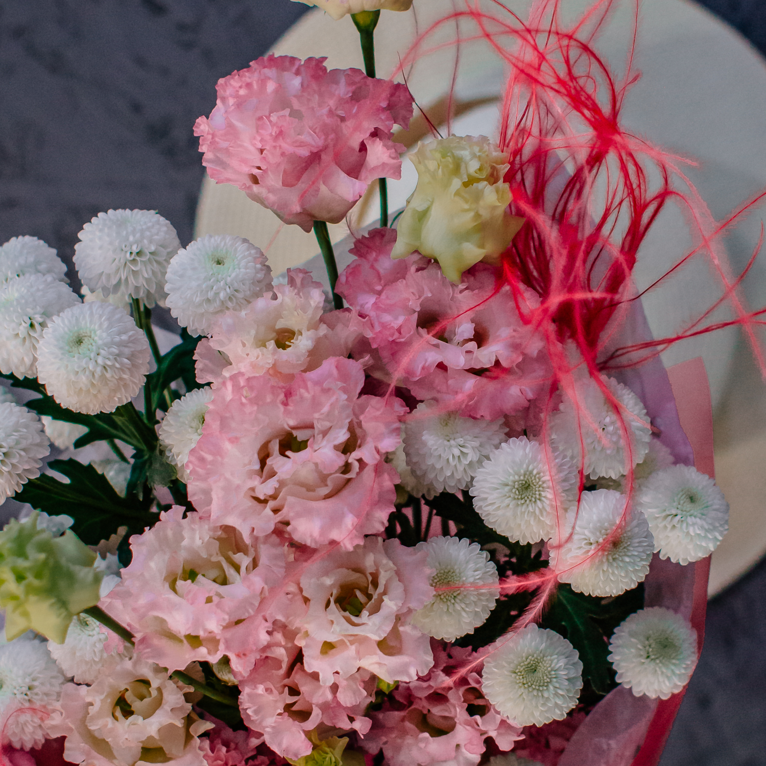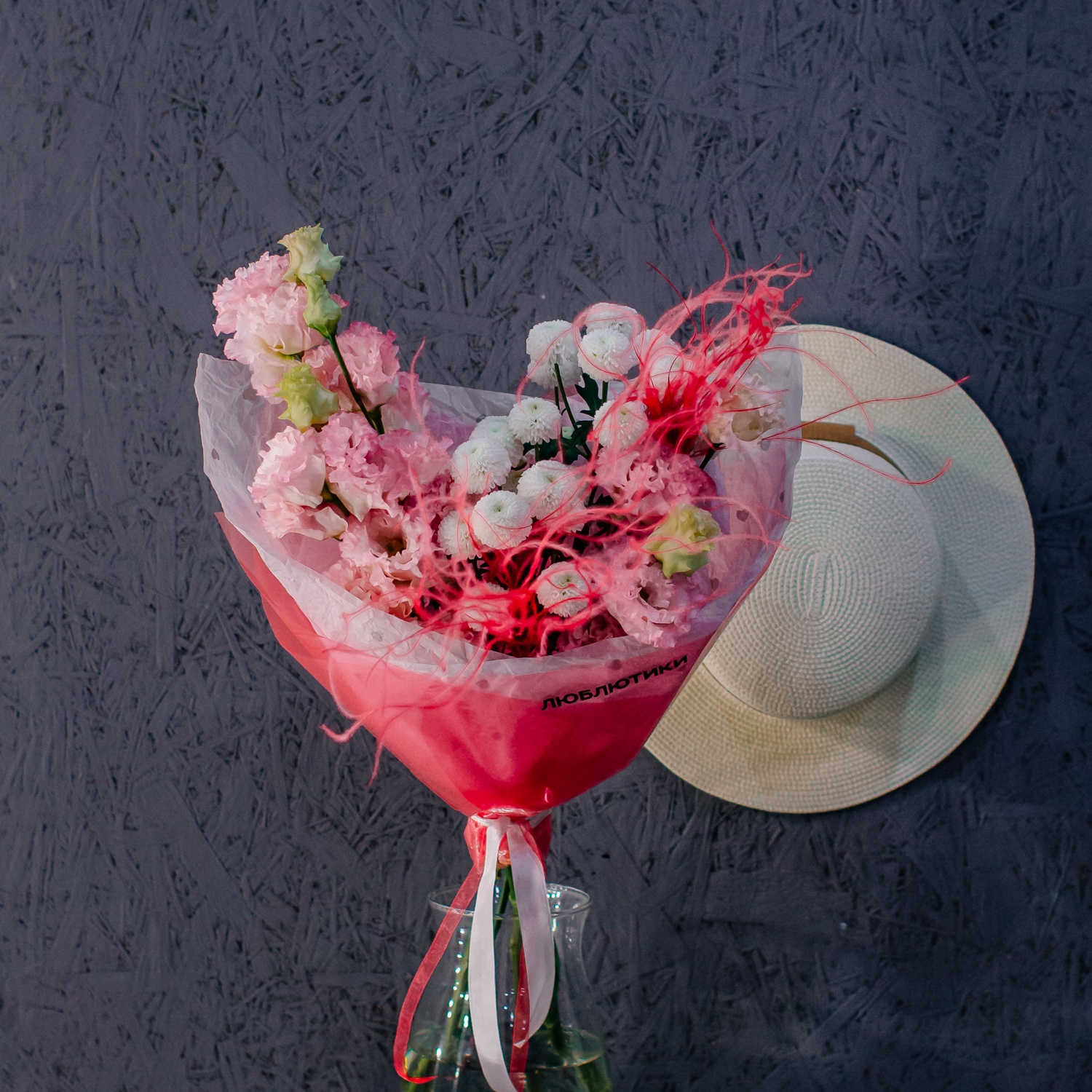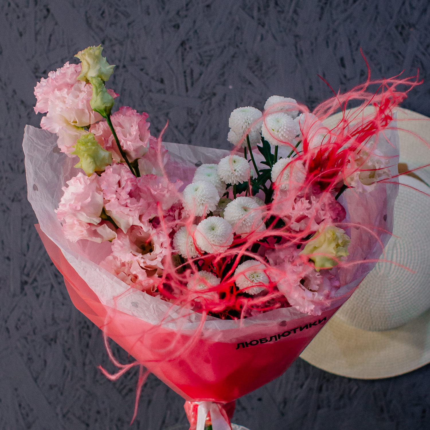 Розовая эустома и белая кустовая хризантема Ньютон создают в букете мягкое, нежное настроение, а красная стифа добавляет яркие акценты и делает композицию более живой и выразительной. Лёгкая динамика формы и стильные цветовые сочетания дают ощущение воздушности и собранной аккуратности одновременно.