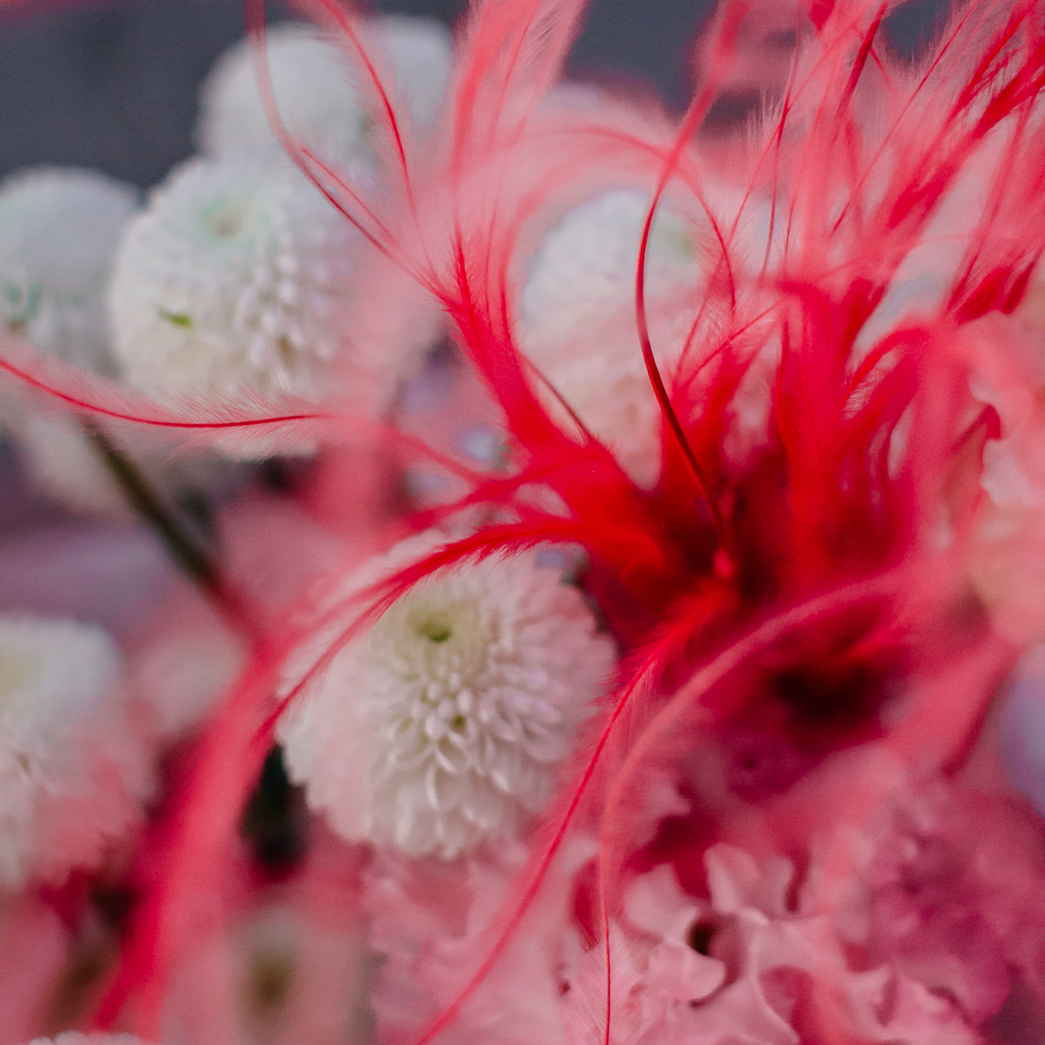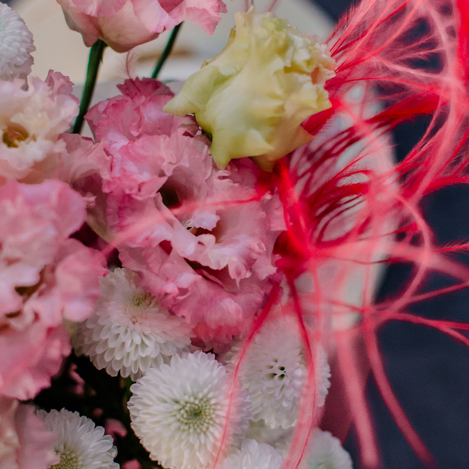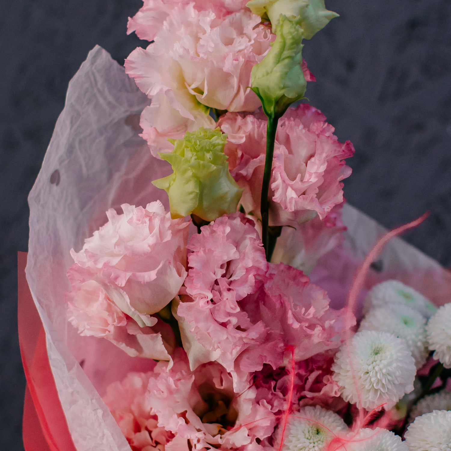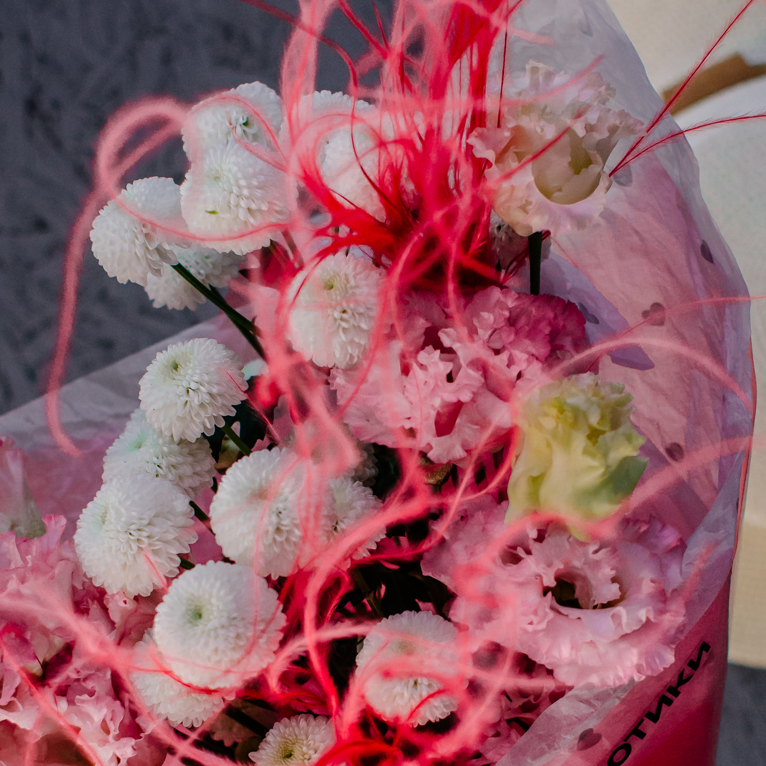 Розовая эустома и белая кустовая хризантема Ньютон создают в букете мягкое, нежное настроение, а красная стифа добавляет яркие акценты и делает композицию более живой и выразительной. Лёгкая динамика формы и стильные цветовые сочетания дают ощущение воздушности и собранной аккуратности одновременно.