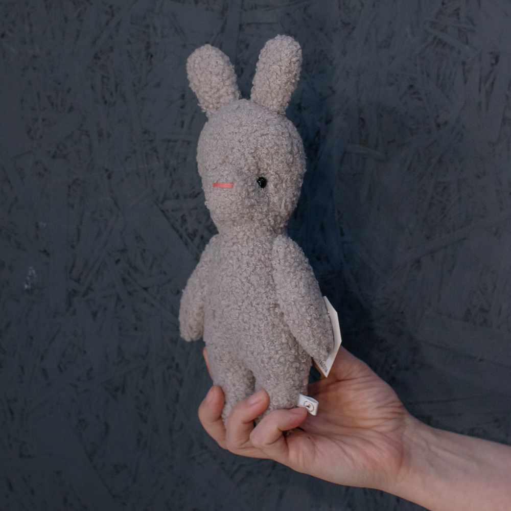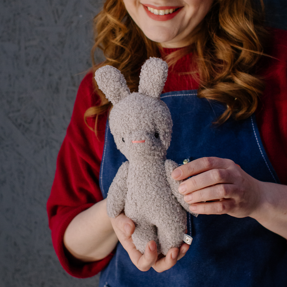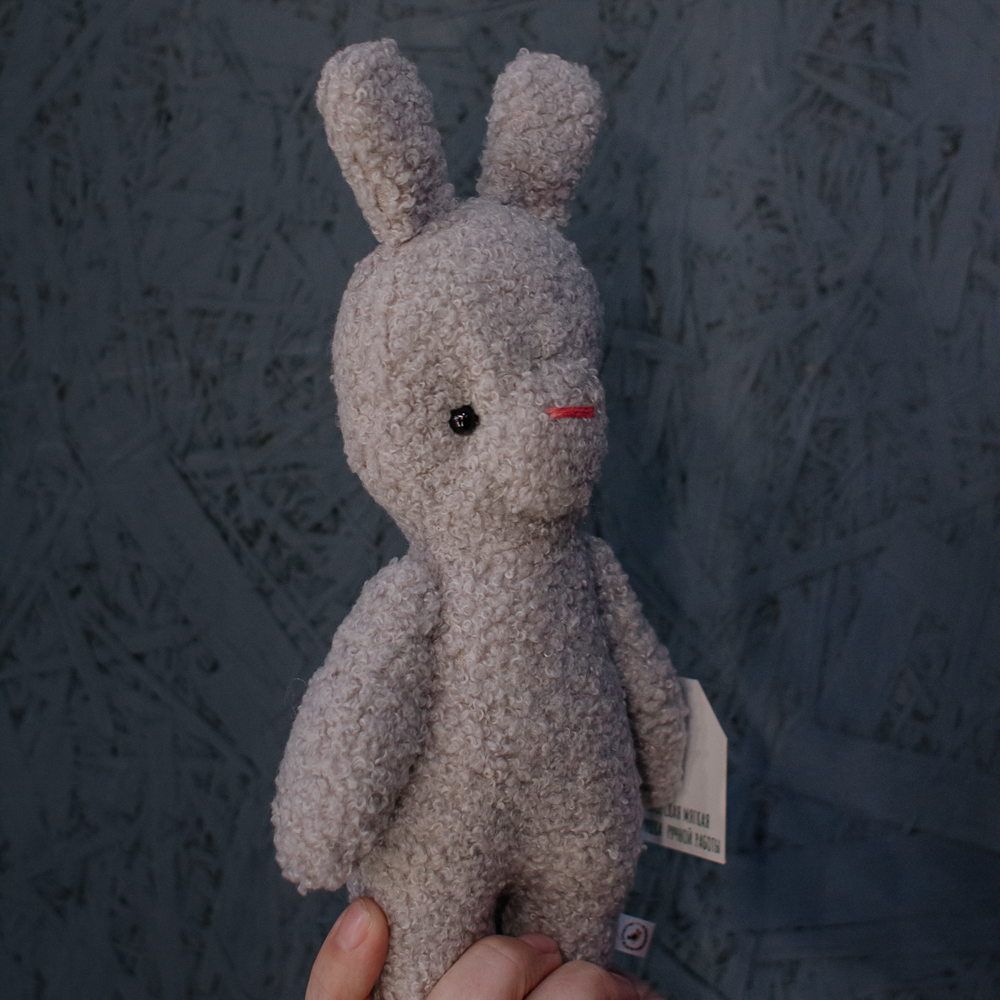 Зайка из букле — нежный и трогательный, с длинными ушками и мягким характером. Идеален для подарка с заботой.
