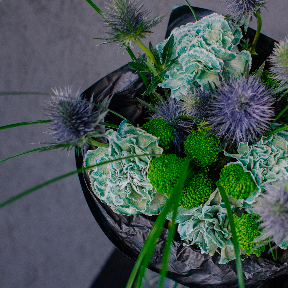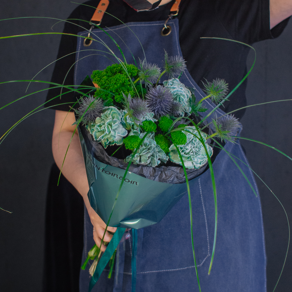 Стильный букет с зелёной хризантемой, синим эрингиумом, изумрудными гвоздиками и берграссом — выразительное сочетание глубоких оттенков и современной флористики. Зелёная хризантема создаёт объём и насыщенную природную основу, синий эрингиум добавляет фактурный контраст и лёгкую графичность, а изумрудные гвоздики усиливают цветовую глубину и делают композицию более эффектной. Берграсс придаёт букету динамику, формируя ощущение живой, «лесной» структуры и естественной свободы.